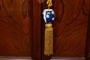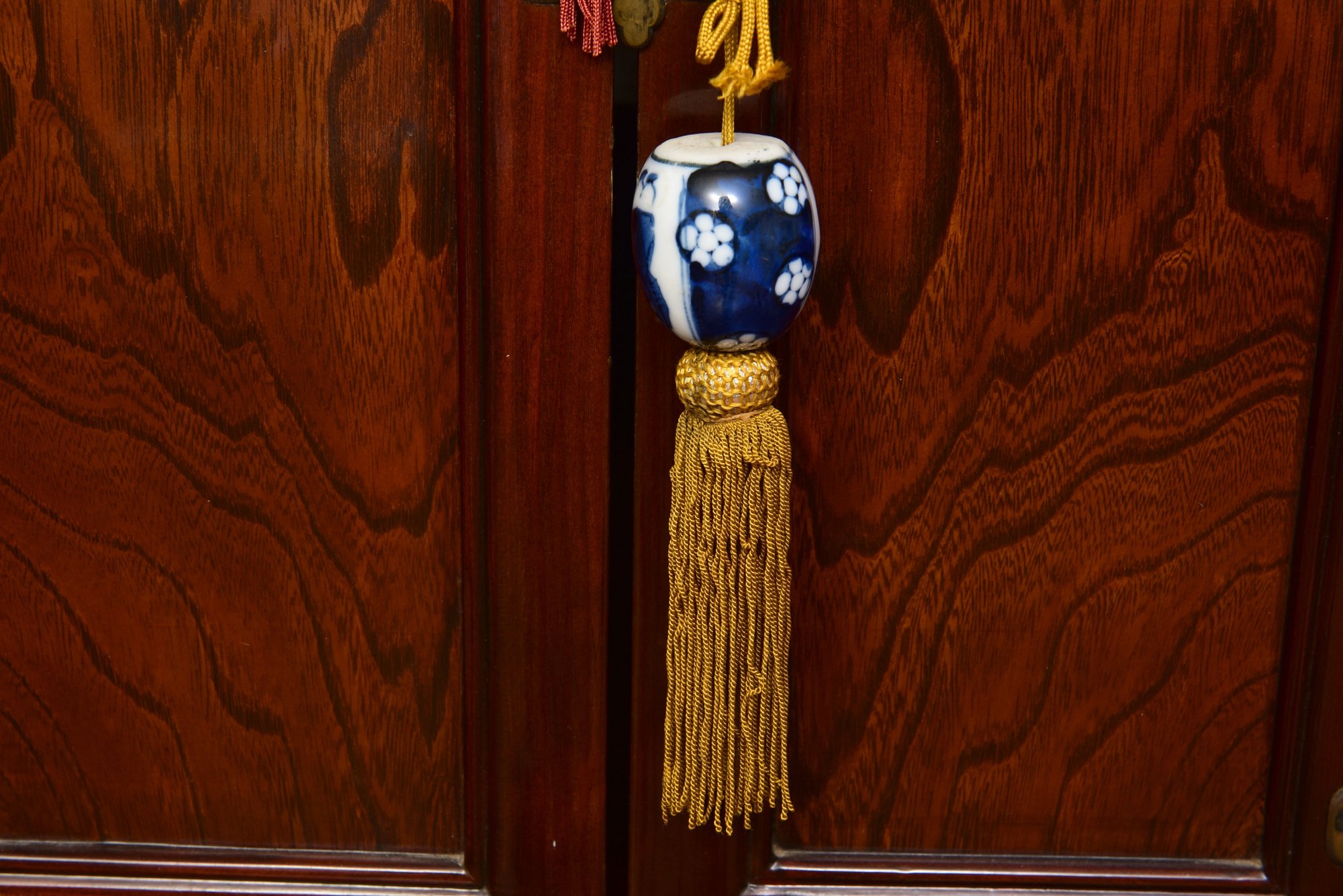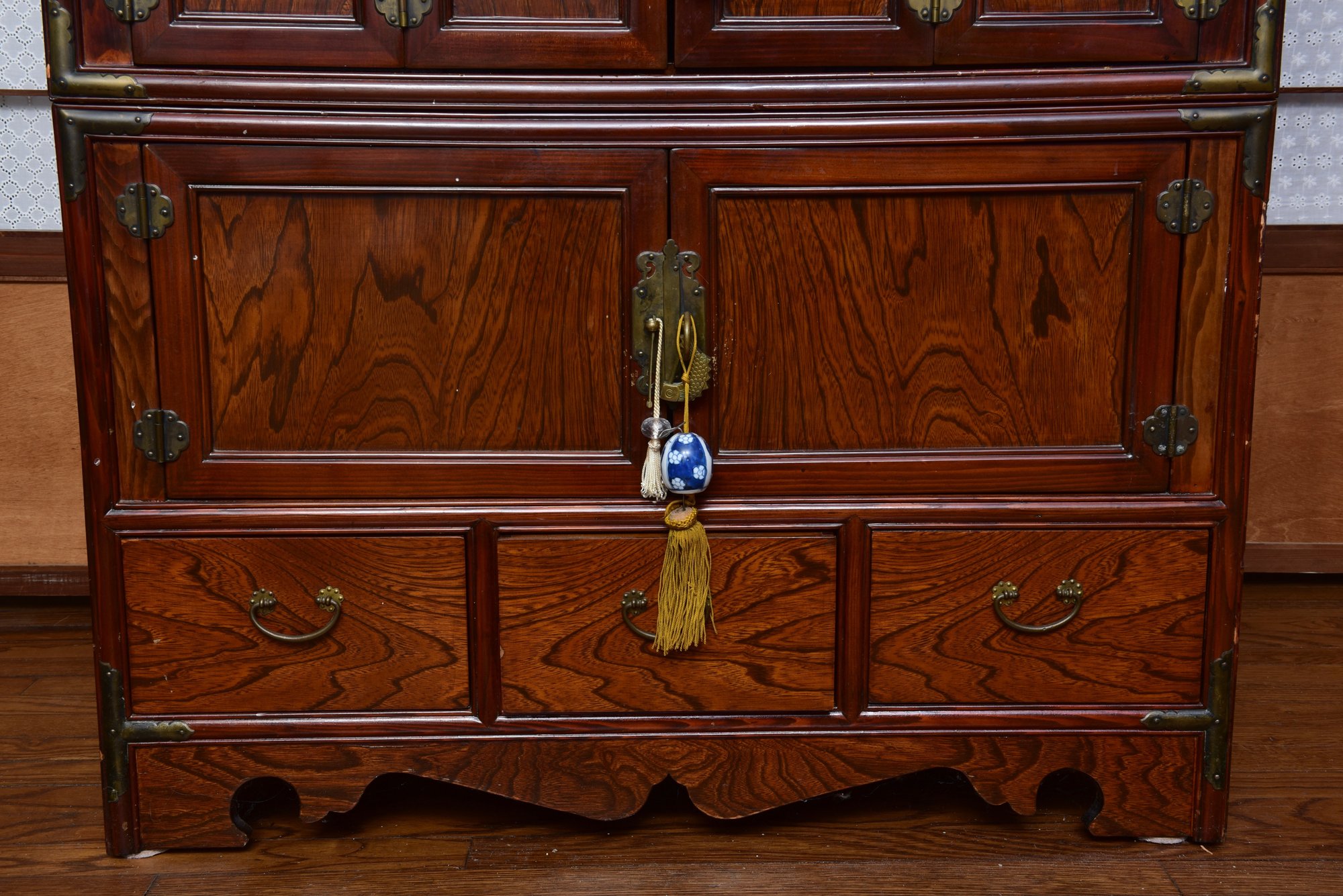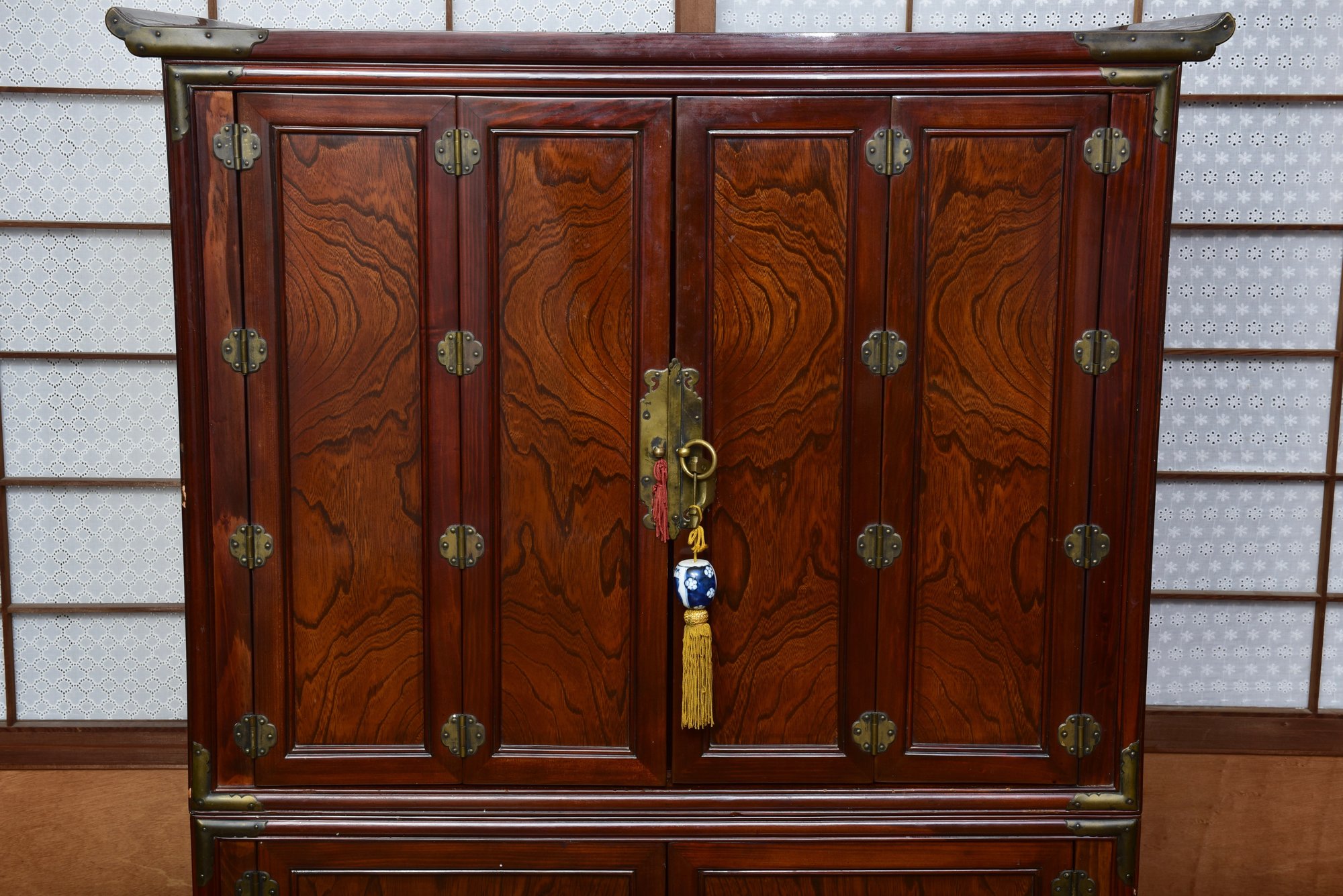 A handsome Japanese tansu-style cabinet featuring richly figured keyaki-grain veneer, traditional iron hardware, and compartmentalized interior with lower drawers. Designed in the mid-20th century for use as an entertainment center. A striking blend of traditional Japanese form and modern functionality.
