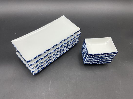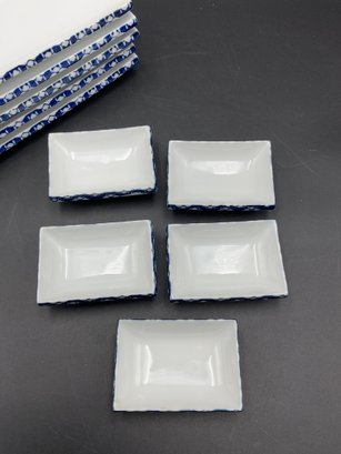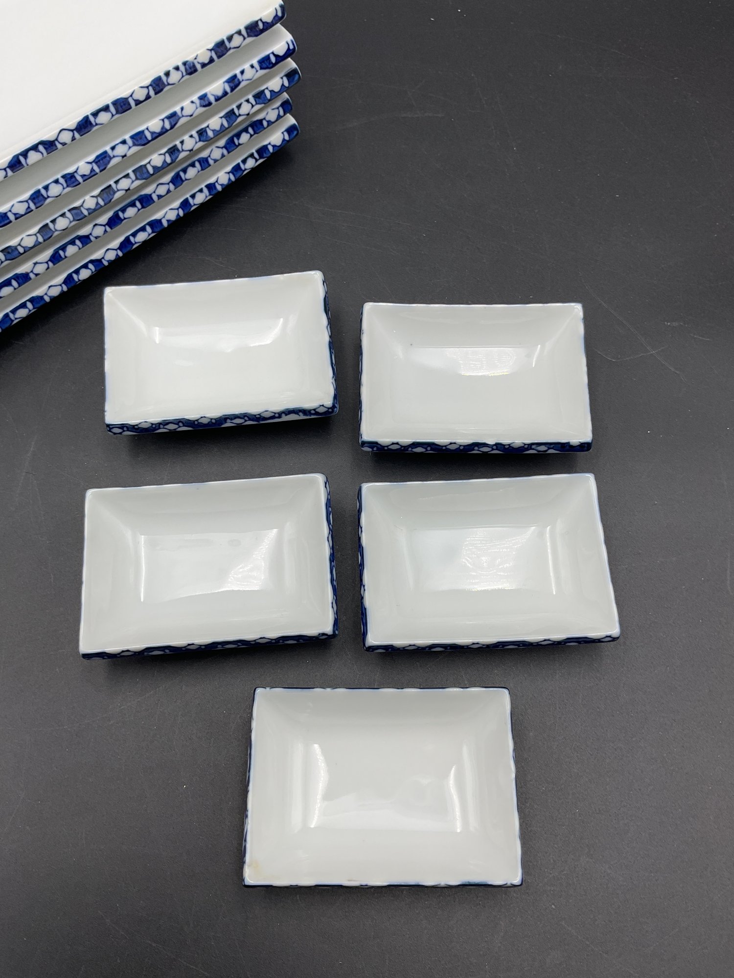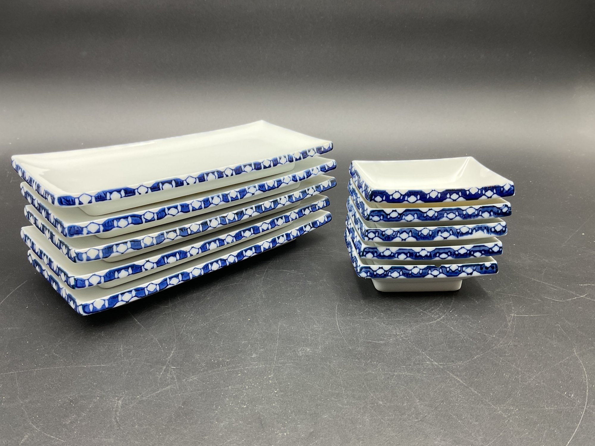 Matched porcelain dishes, five of each size, all unmarked. These are believed to be sushi plates with matched condiment dishes. All in excellent condition, no chips or cracks found. Simple and elegant styling with many possible uses.