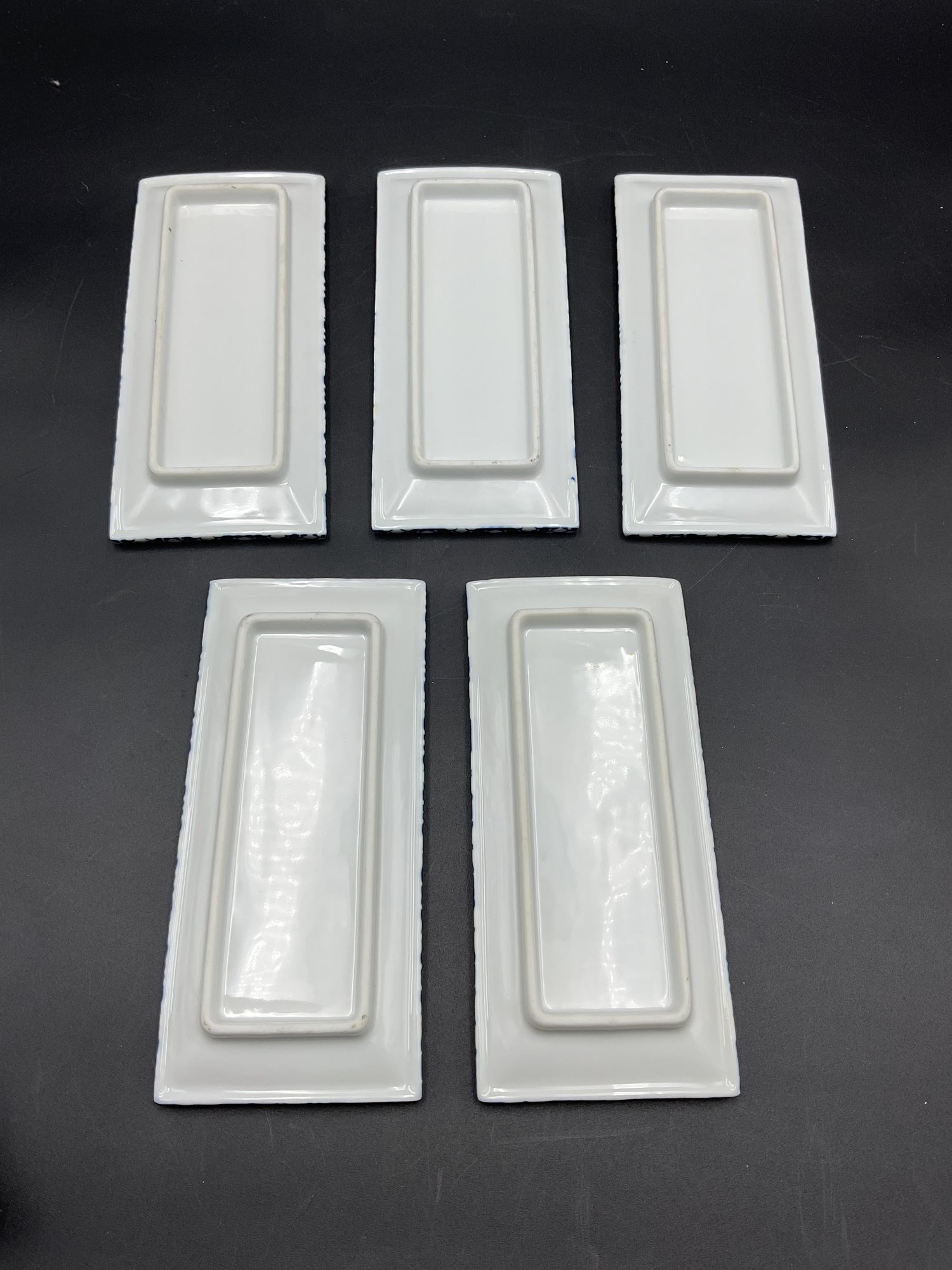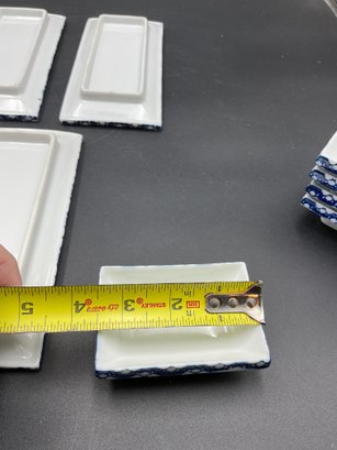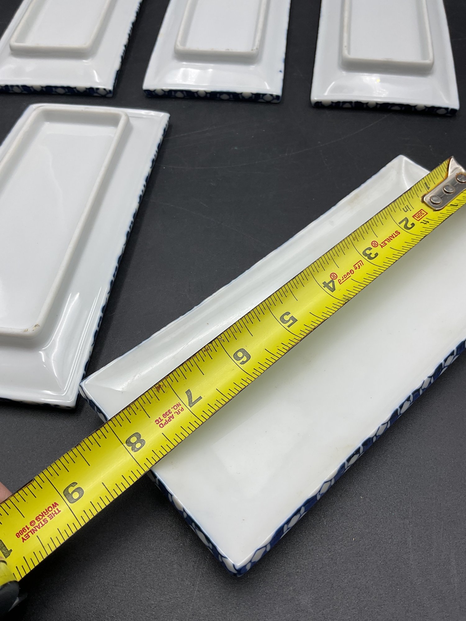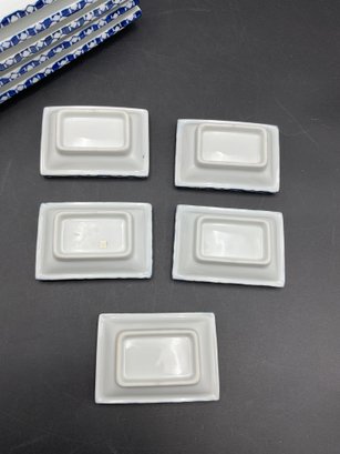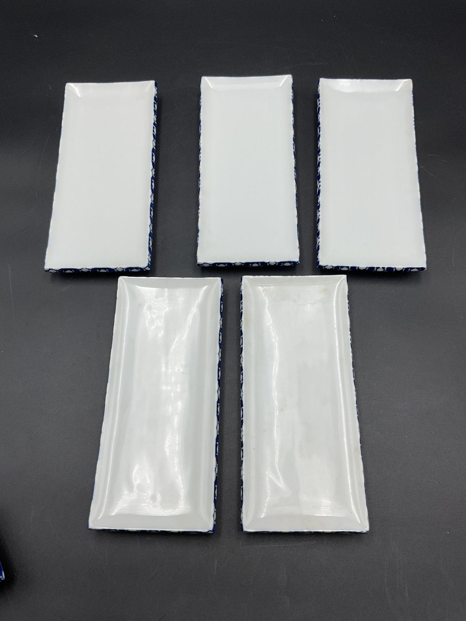 Matched porcelain dishes, five of each size, all unmarked. These are believed to be sushi plates with matched condiment dishes. All in excellent condition, no chips or cracks found. Simple and elegant styling with many possible uses.