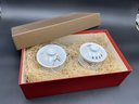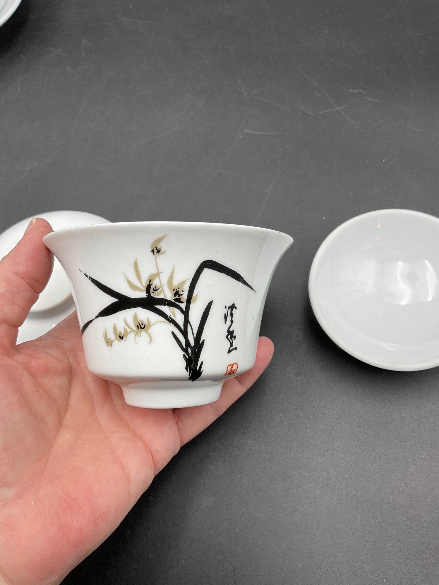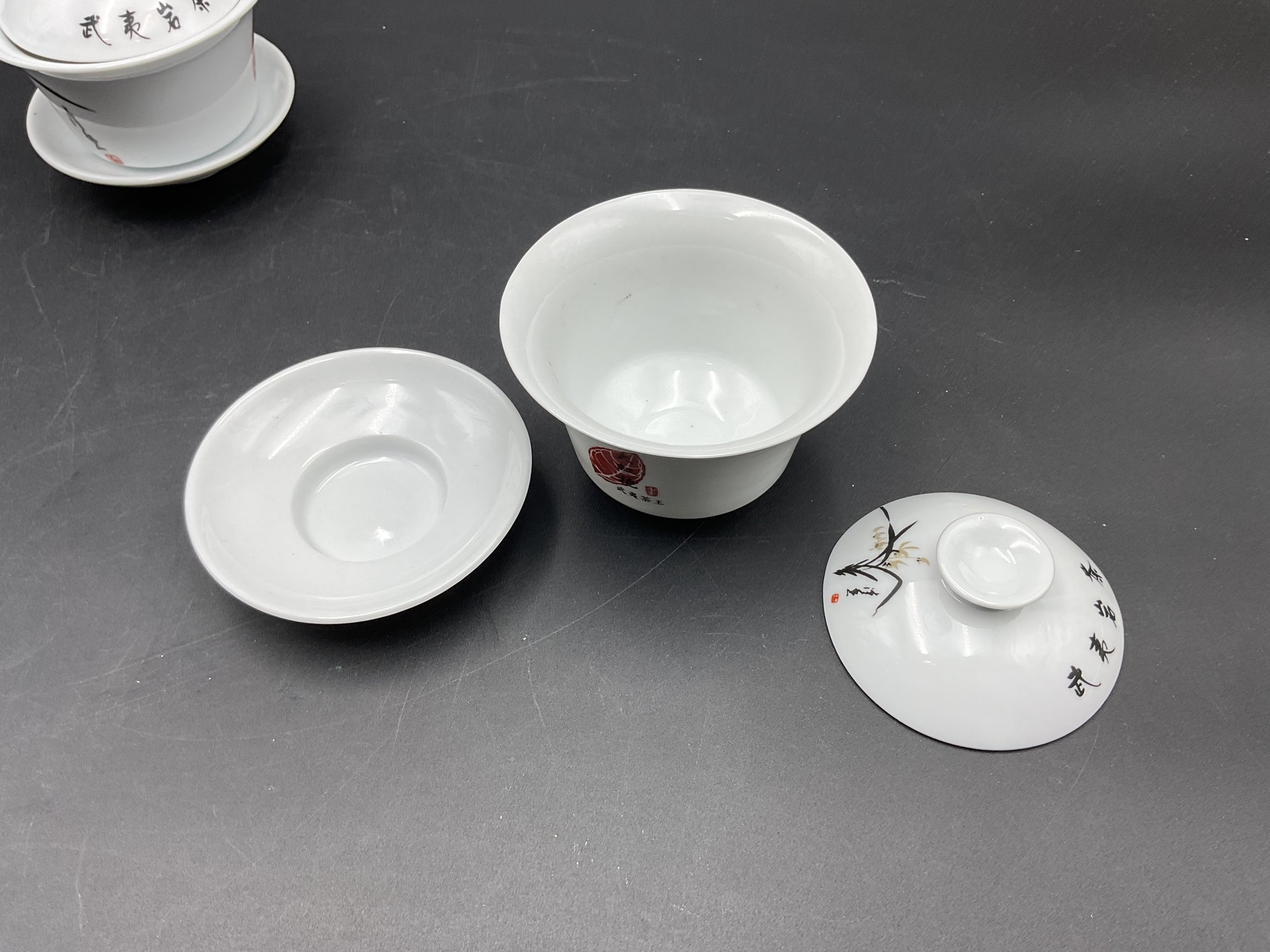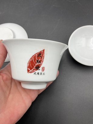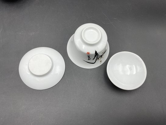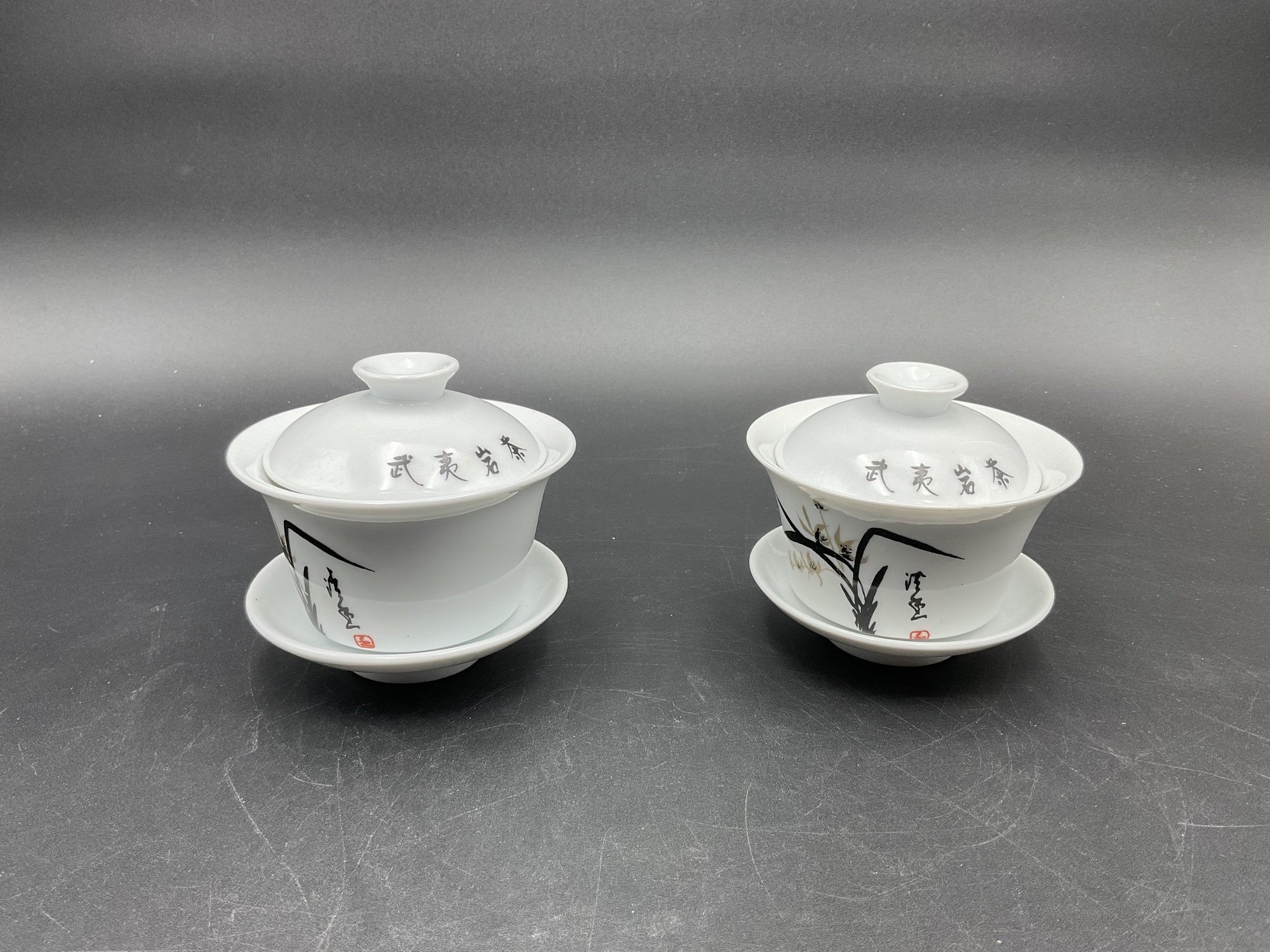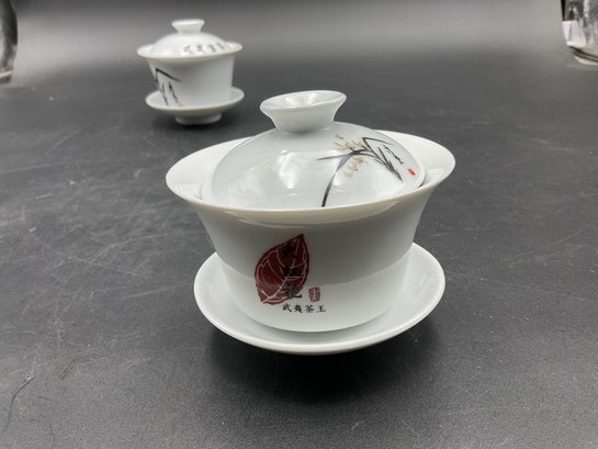 Pretty pair of matched porcelain cups with saucers and lids - these seem larger than traditional Asian teacups. Excellent condition. They come nestled in a gift box with protective fill and foam.