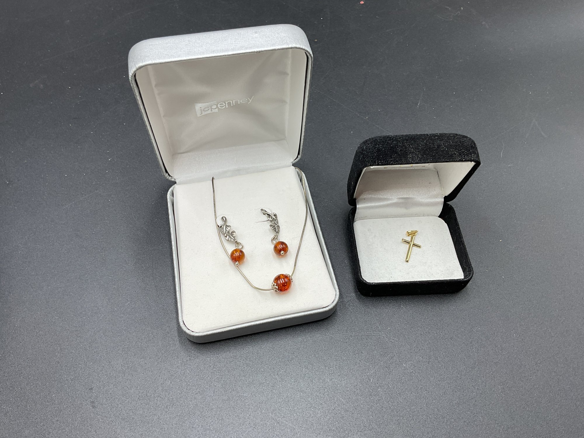 Boxed jewelry includes 14K gold cross and matched sterling with amber bead necklace and earrings. All in excellent condition. See photos for details.