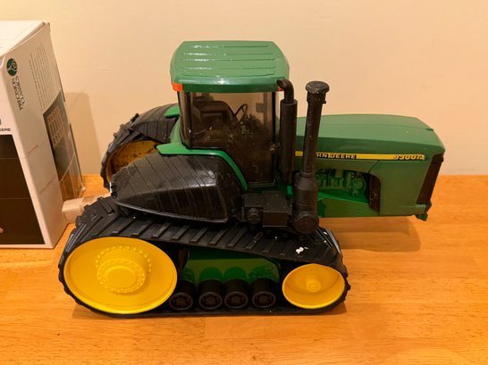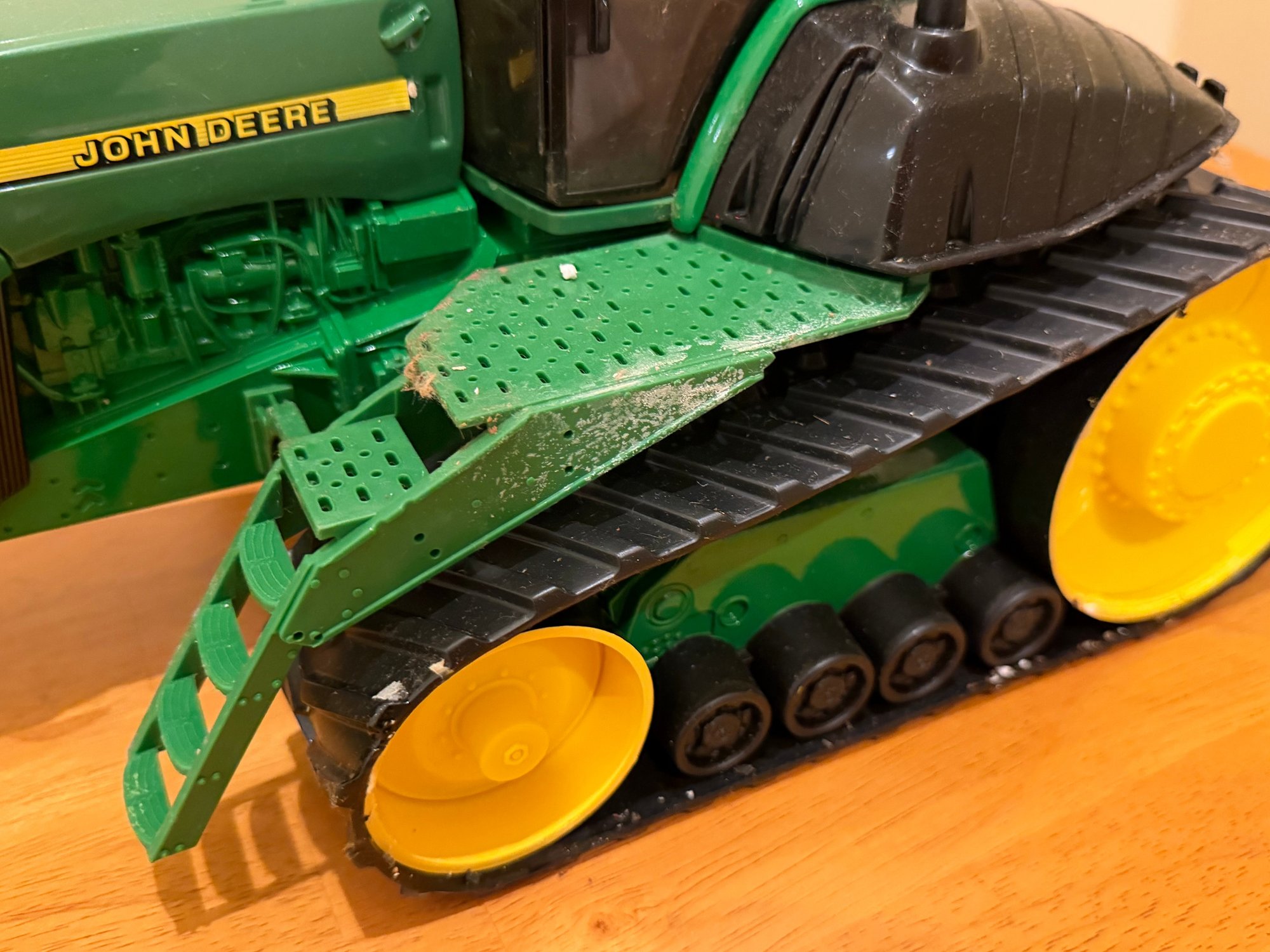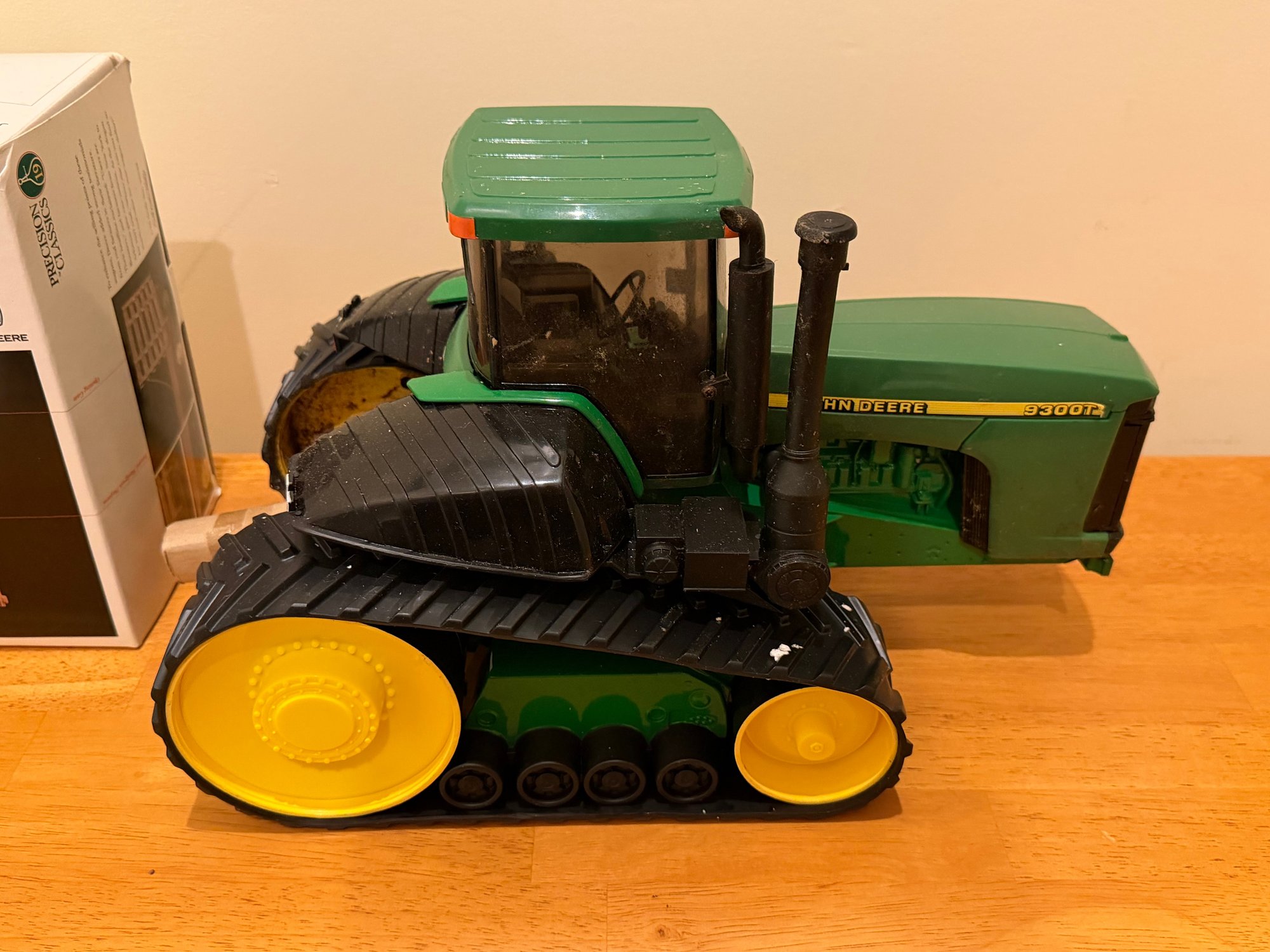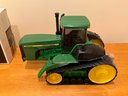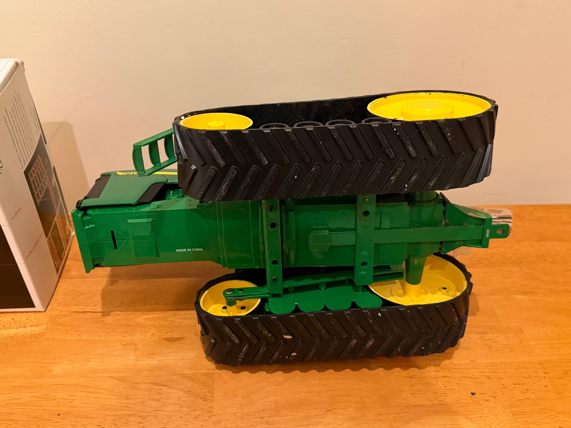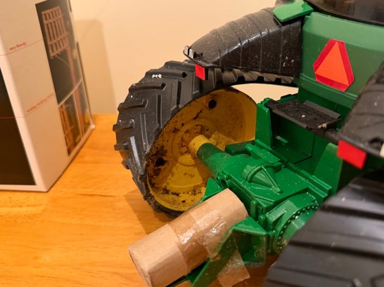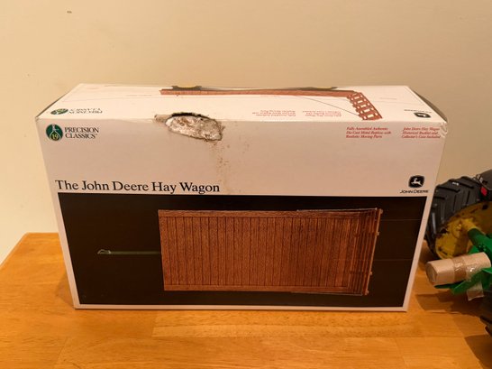 Tractor has debris on it, needs cleaning. Hay wagon has damaged box. Tractor 15" length. Sold as is.