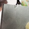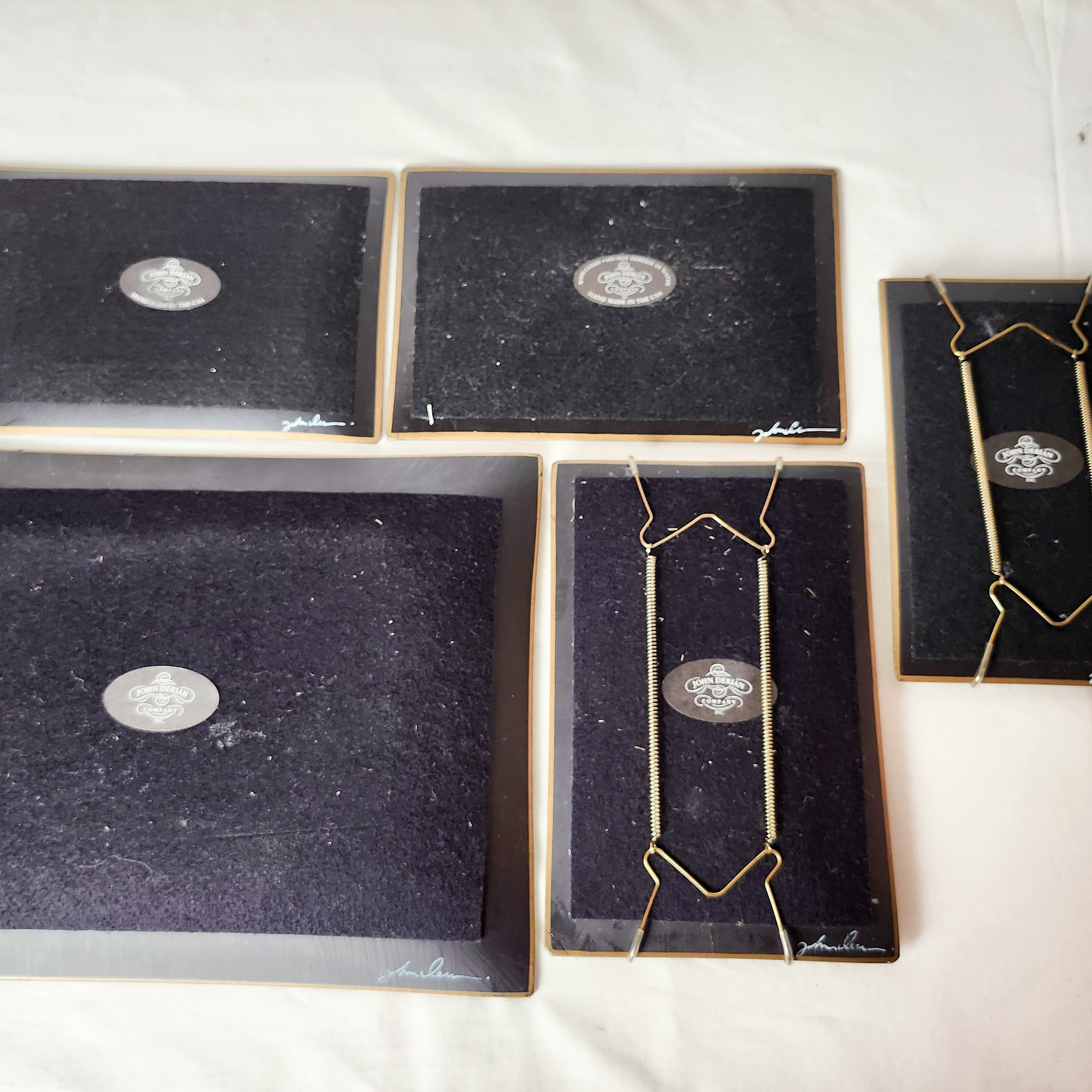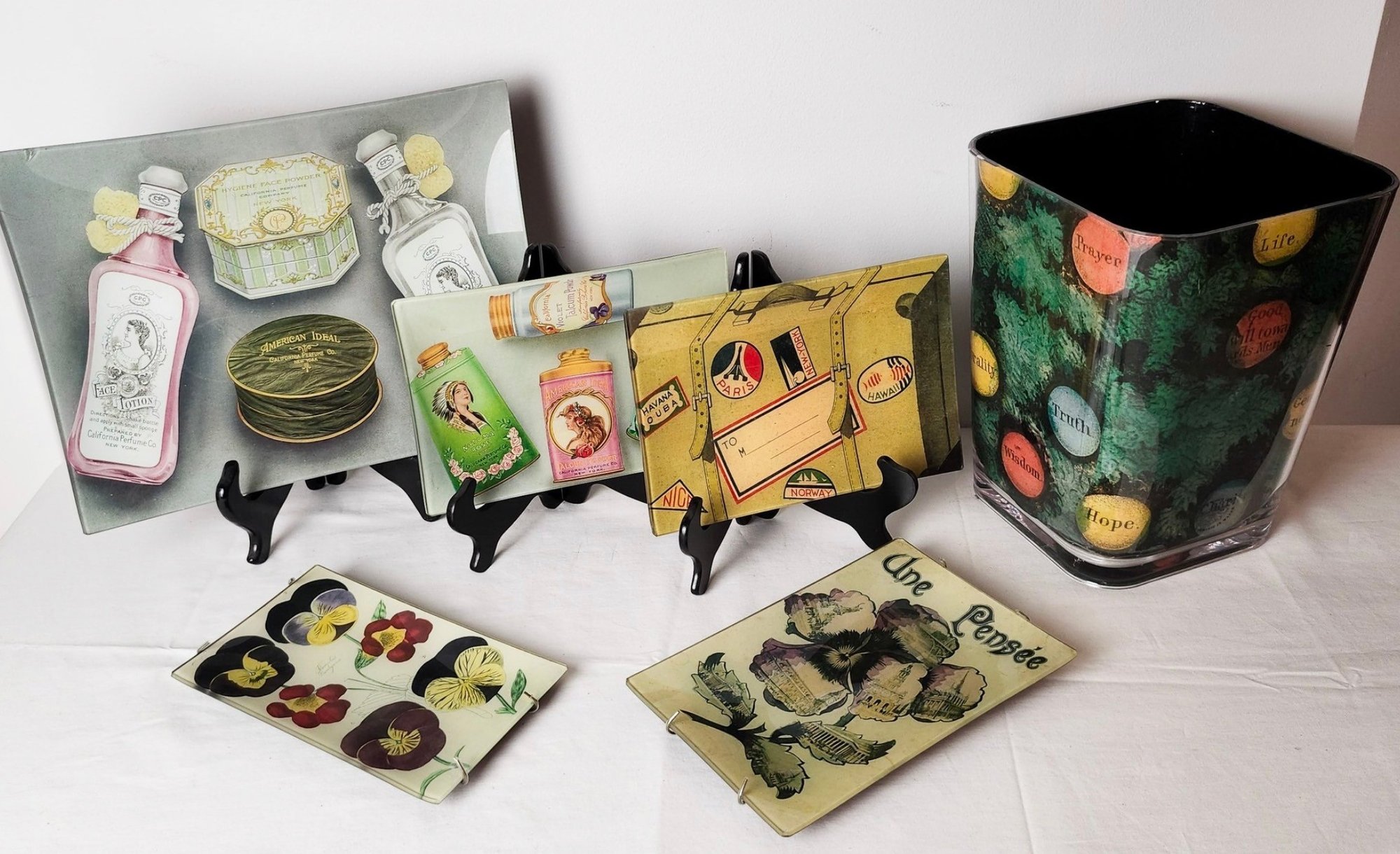 Reverse decorated plastic waste basket and reverse glass decorative plates, two with plate hangers by John Derian. Measurements of waste basket.