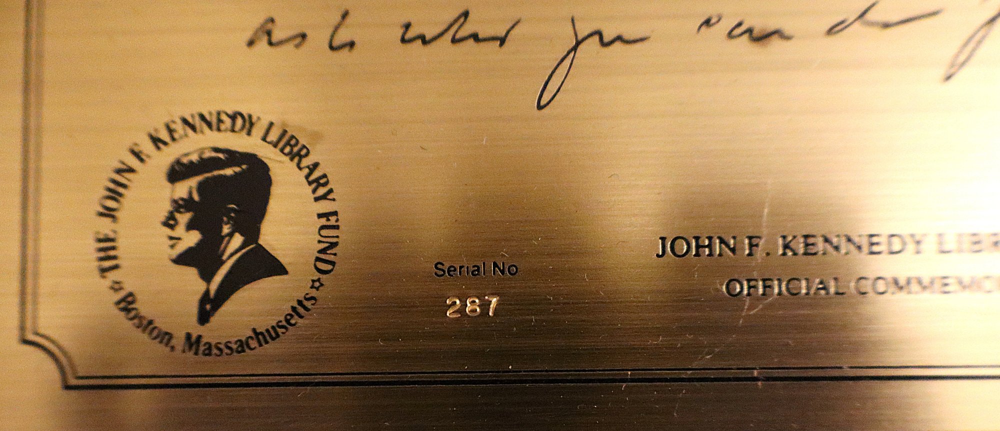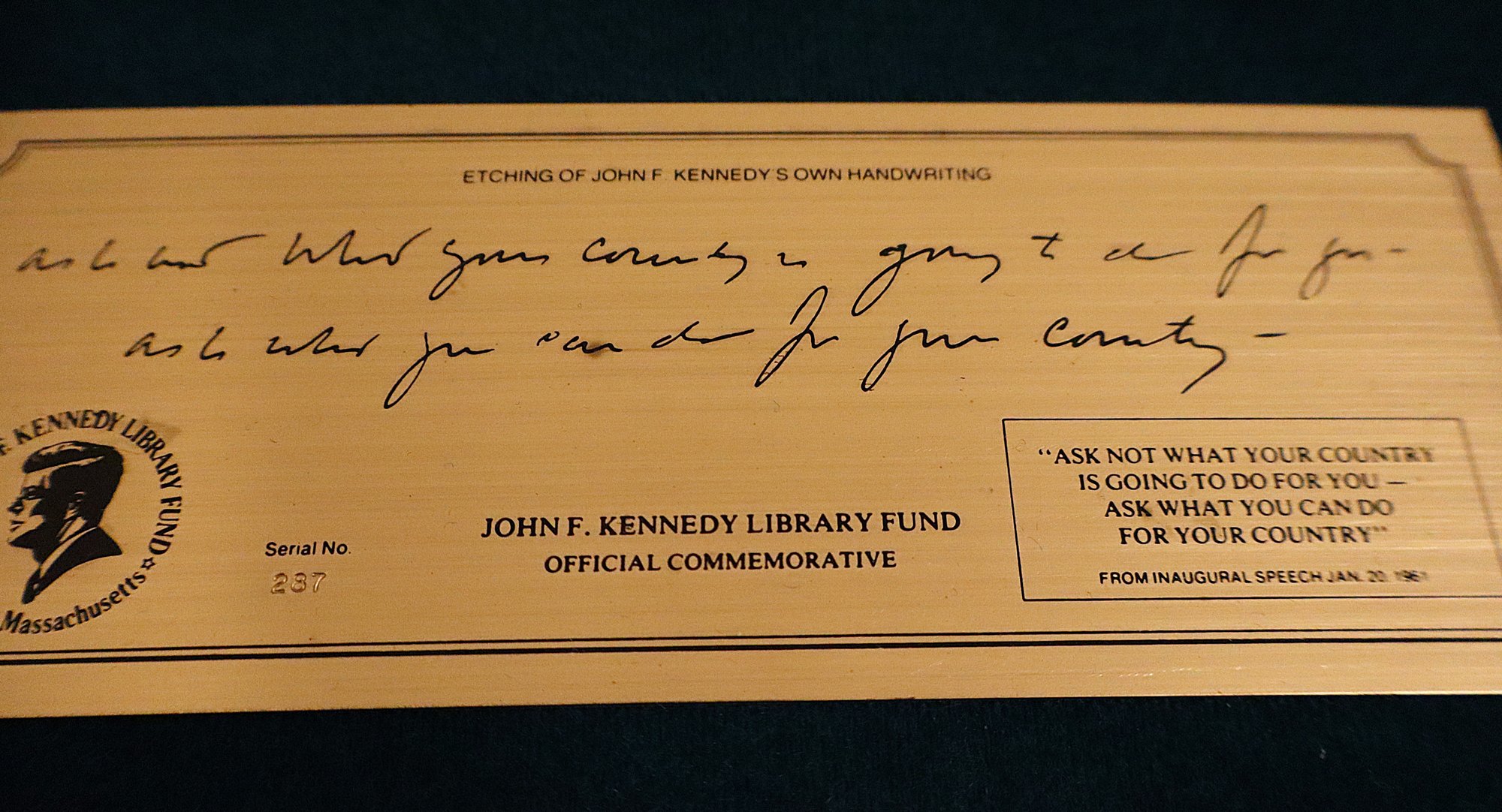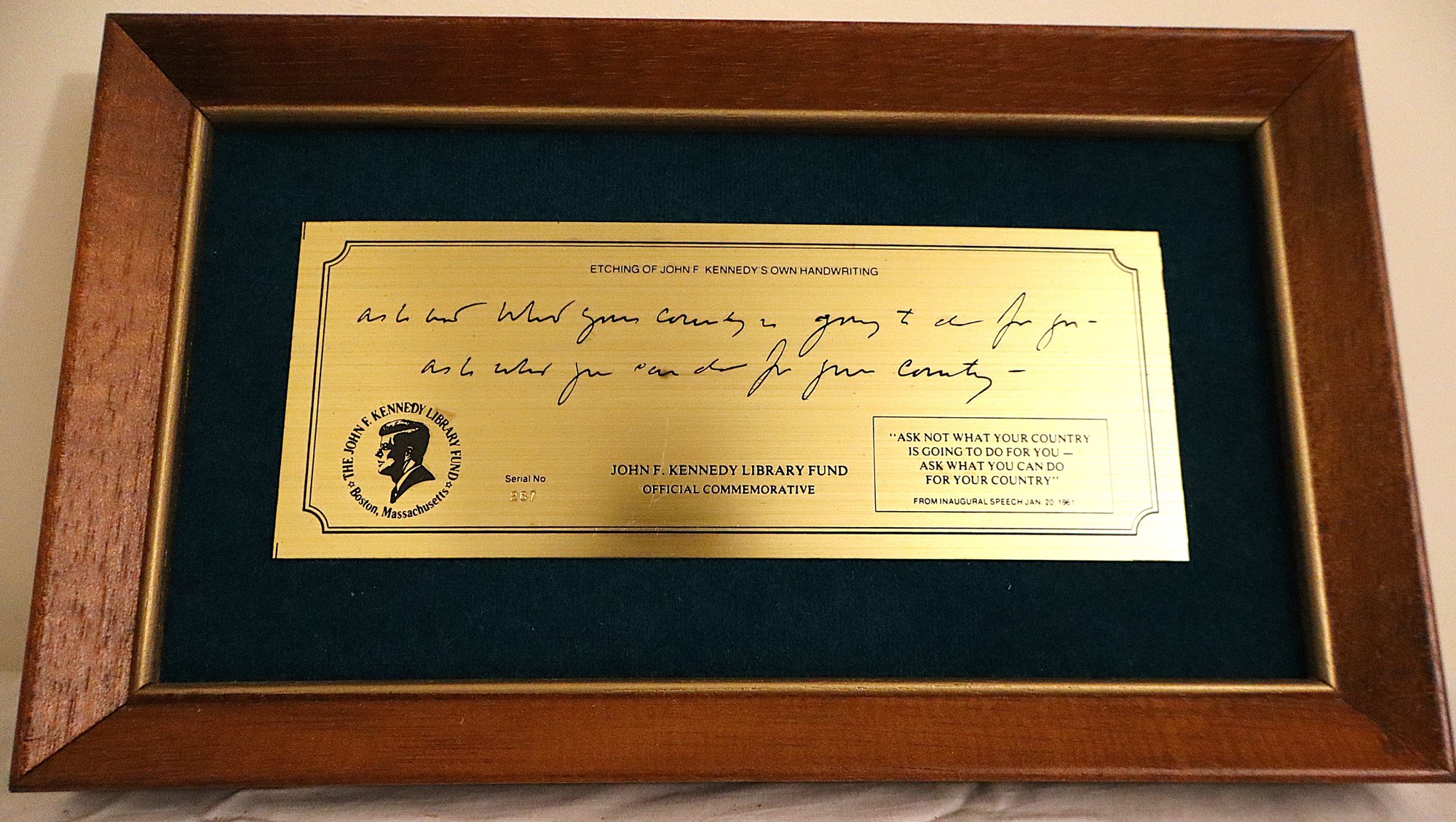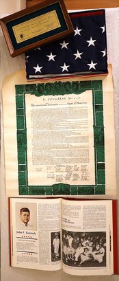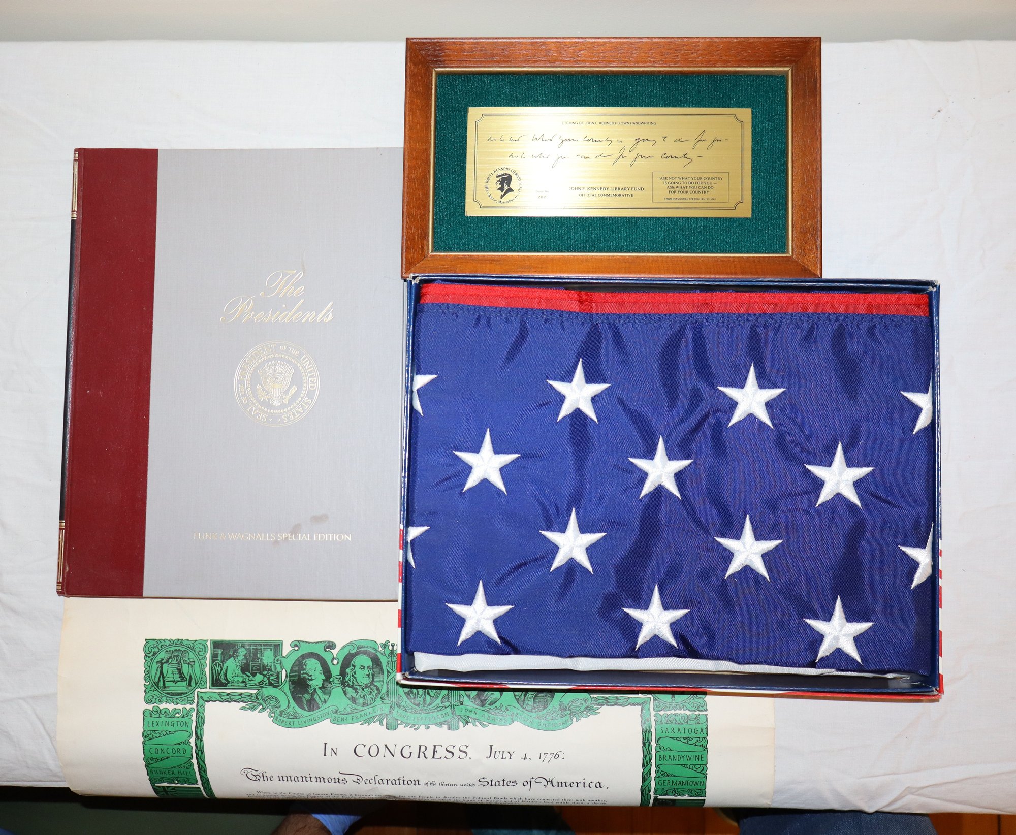 Includes official commemorative etching of John F. Kennedy's own handwriting on felt lined wooden plaque (Serial No. 287), replica of the Declaration of Independence, 3x5 Nyl-glo U.S. Flag & The Presidents by Funk & Wagnalls Special Edition hardcover book