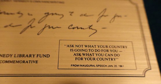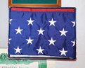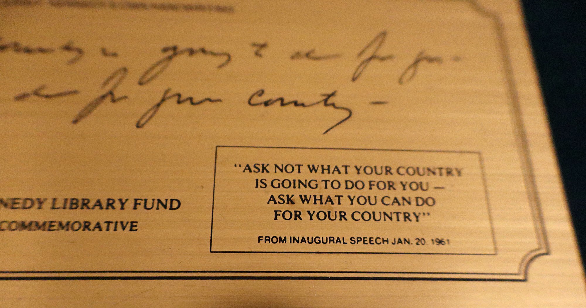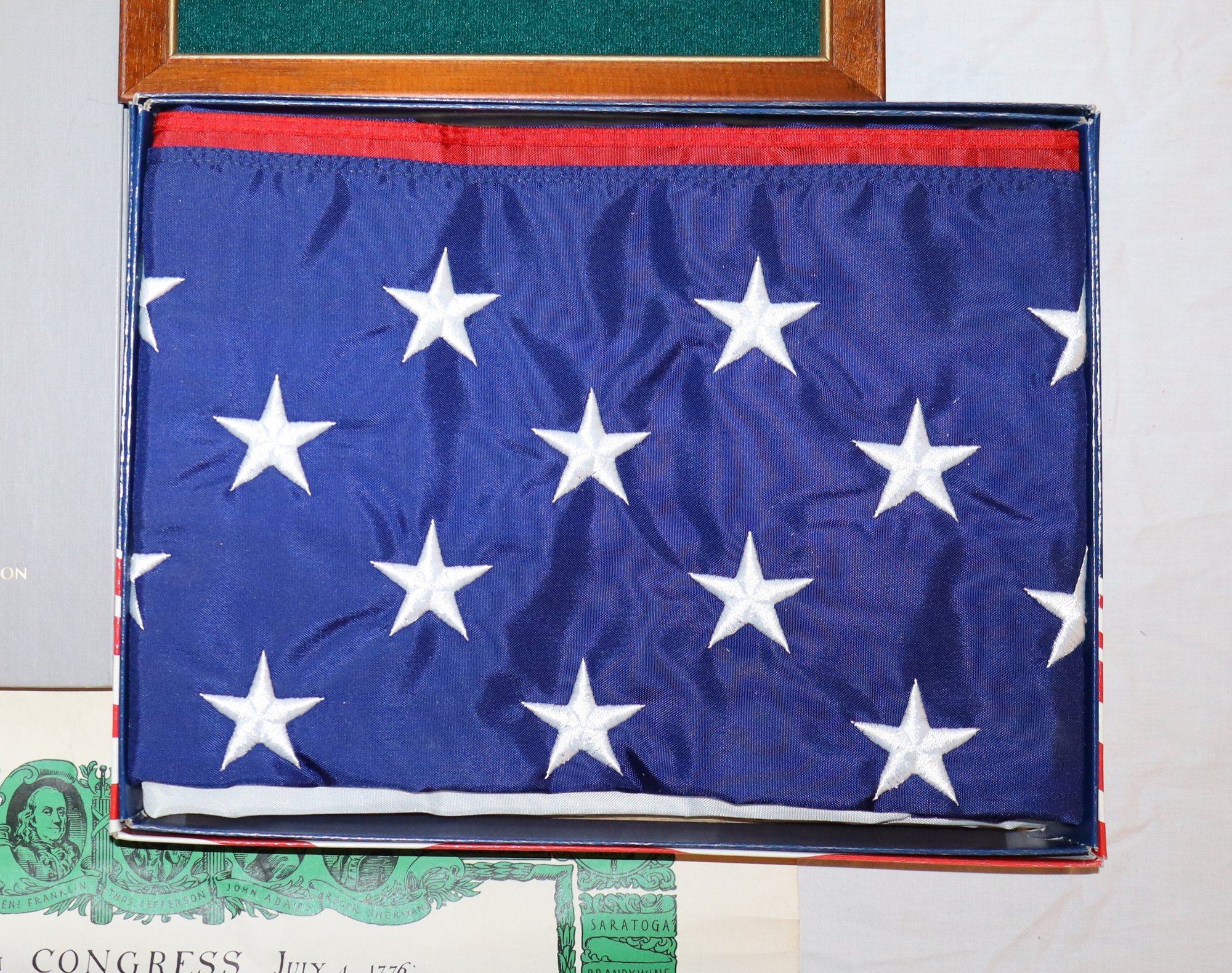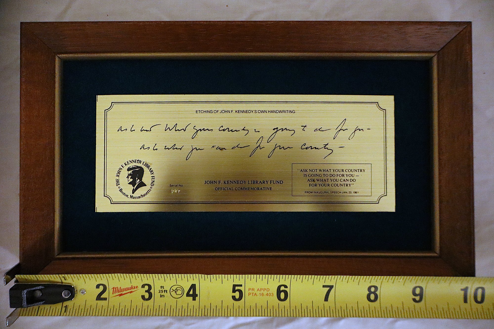 Includes official commemorative etching of John F. Kennedy's own handwriting on felt lined wooden plaque (Serial No. 287), replica of the Declaration of Independence, 3x5 Nyl-glo U.S. Flag & The Presidents by Funk & Wagnalls Special Edition hardcover book