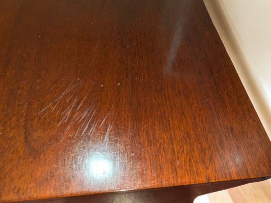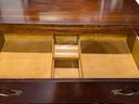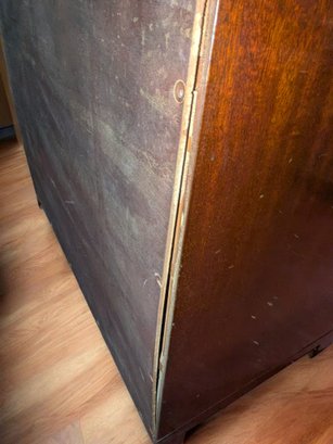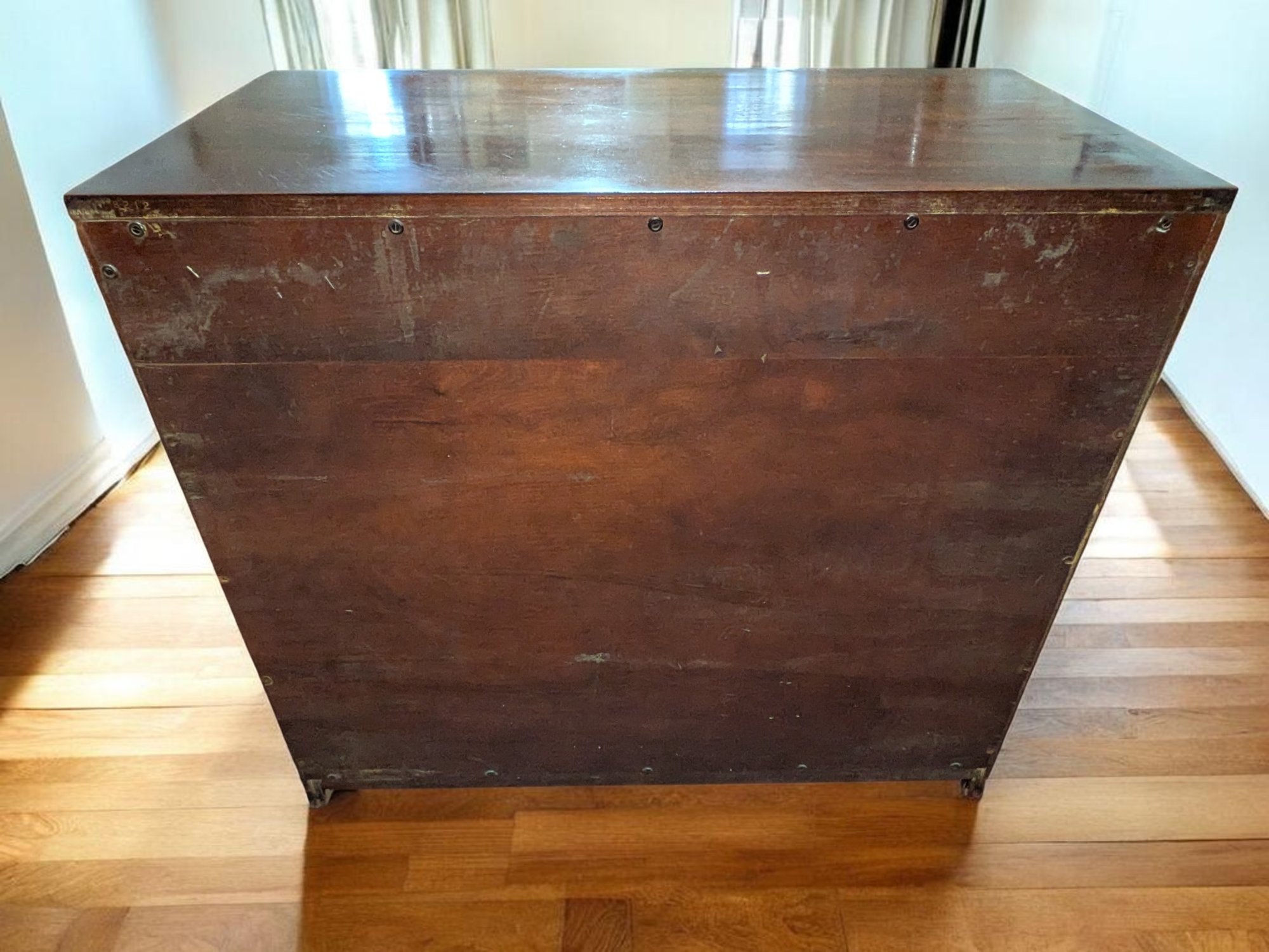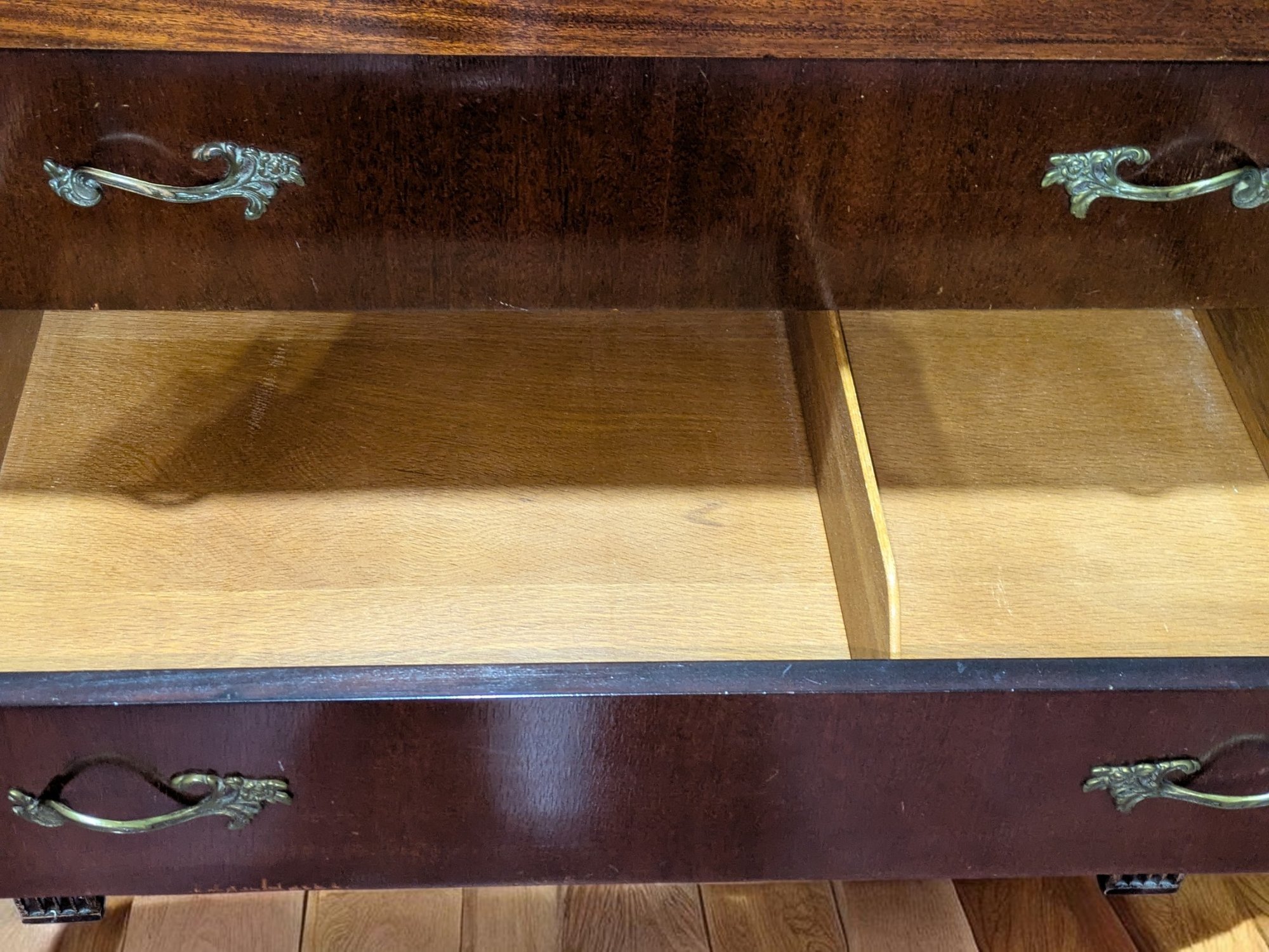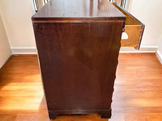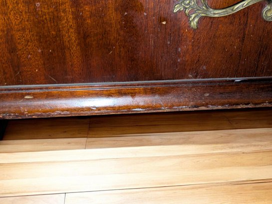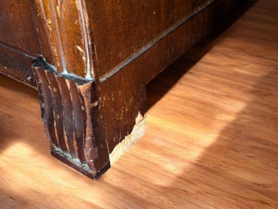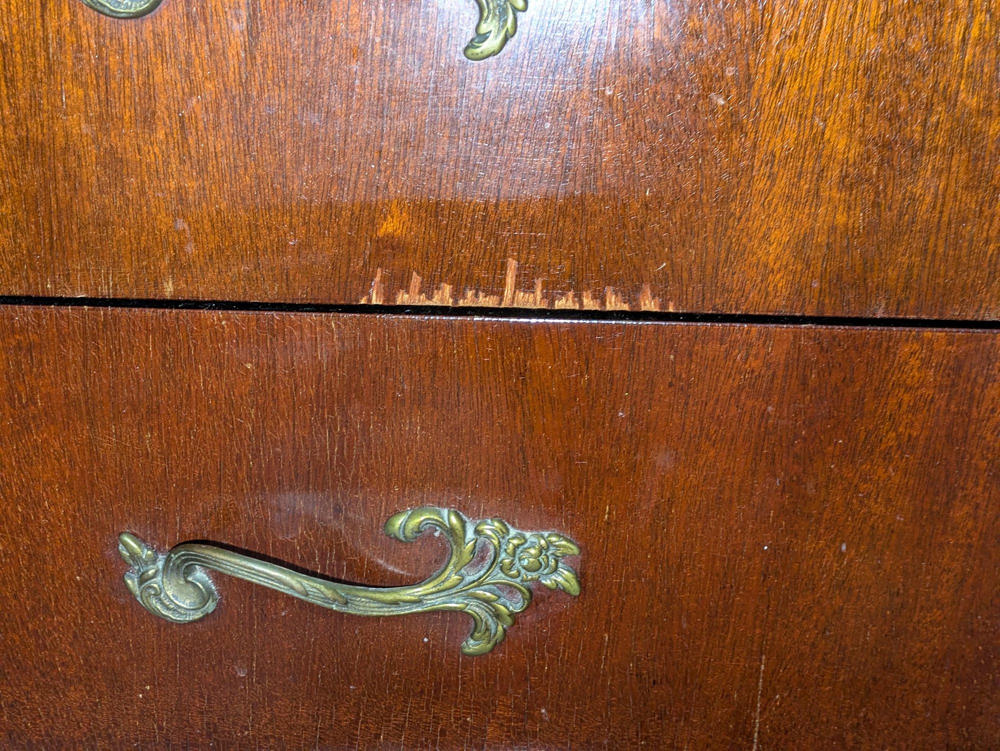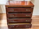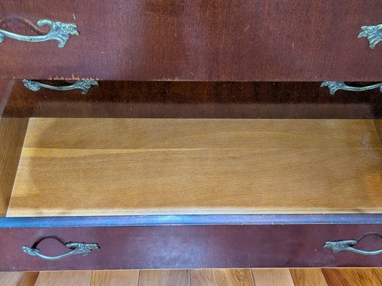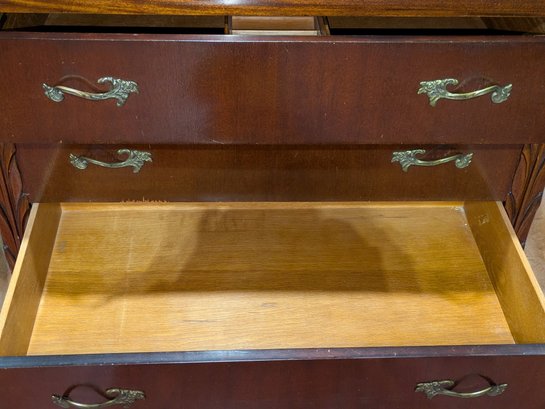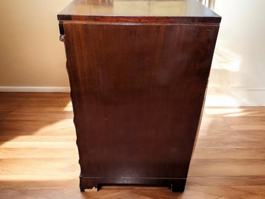 John Stuart, Fine Furniture, Midcentury MCMRosewood 4 Drawer Nightstand Chest/Dresser . Stunning Detail and Design. Made of solid mahogany with decorative leaf carvings on the side columns and ornate leaf-shaped brass drawer pulls. Normal wear & marks. The top has some wear and some faint surface scratches. The front right foot has missing veneer, and one drawer shows slight veneer chipping, all consistent with age and use; most are fillable with stain renew. Please see all photos as part of the description and condition. 38"W x 34"H x 21"D