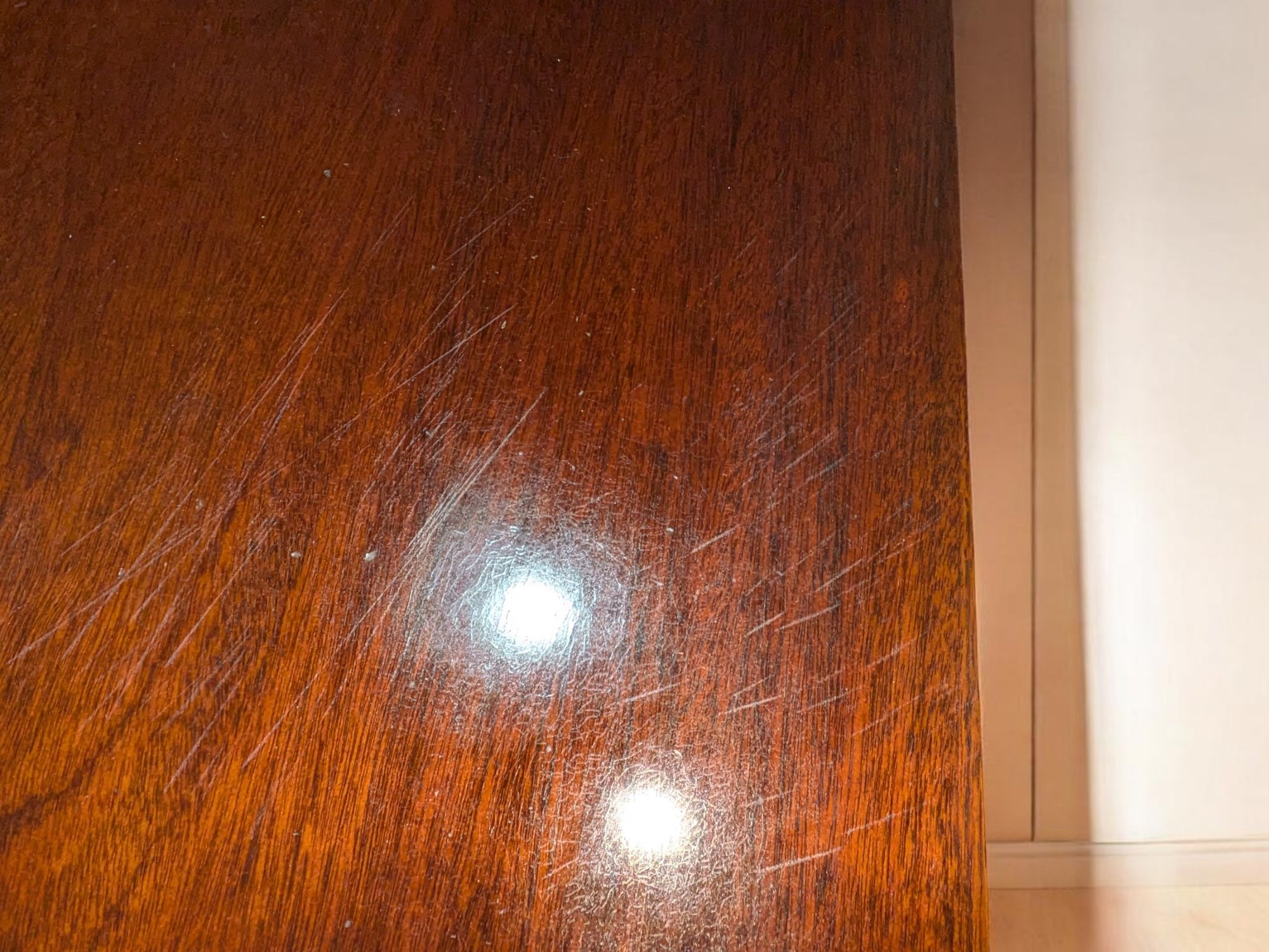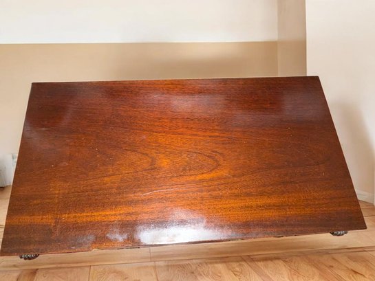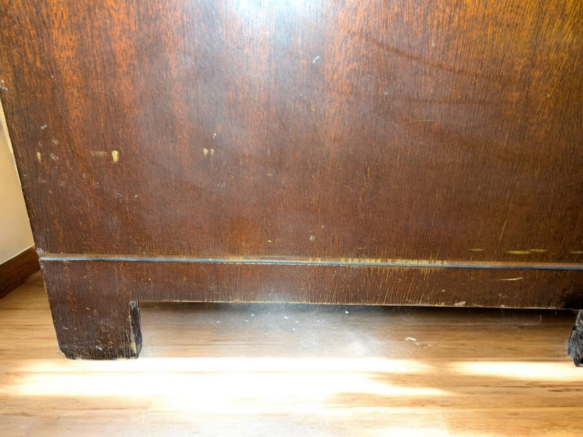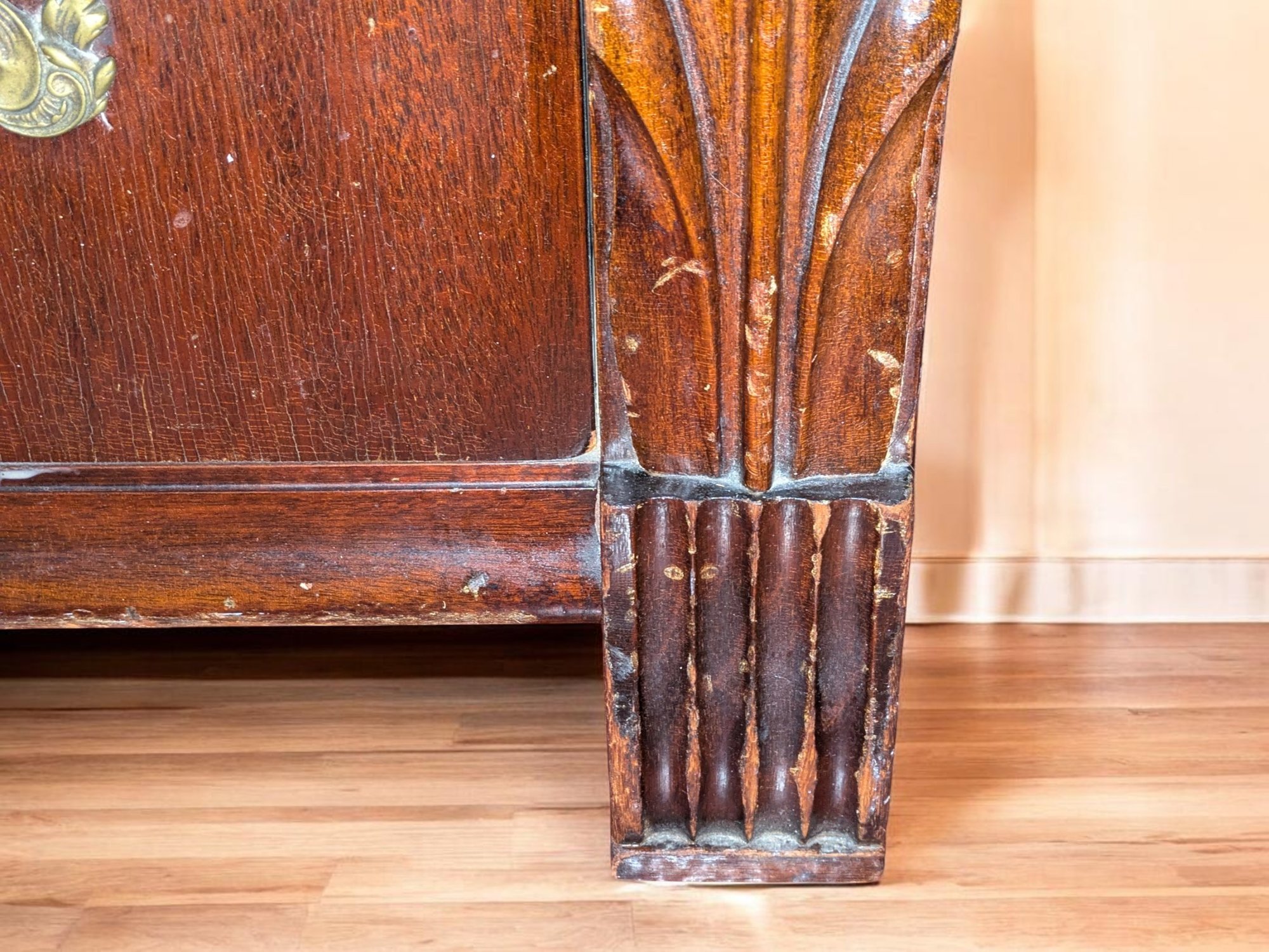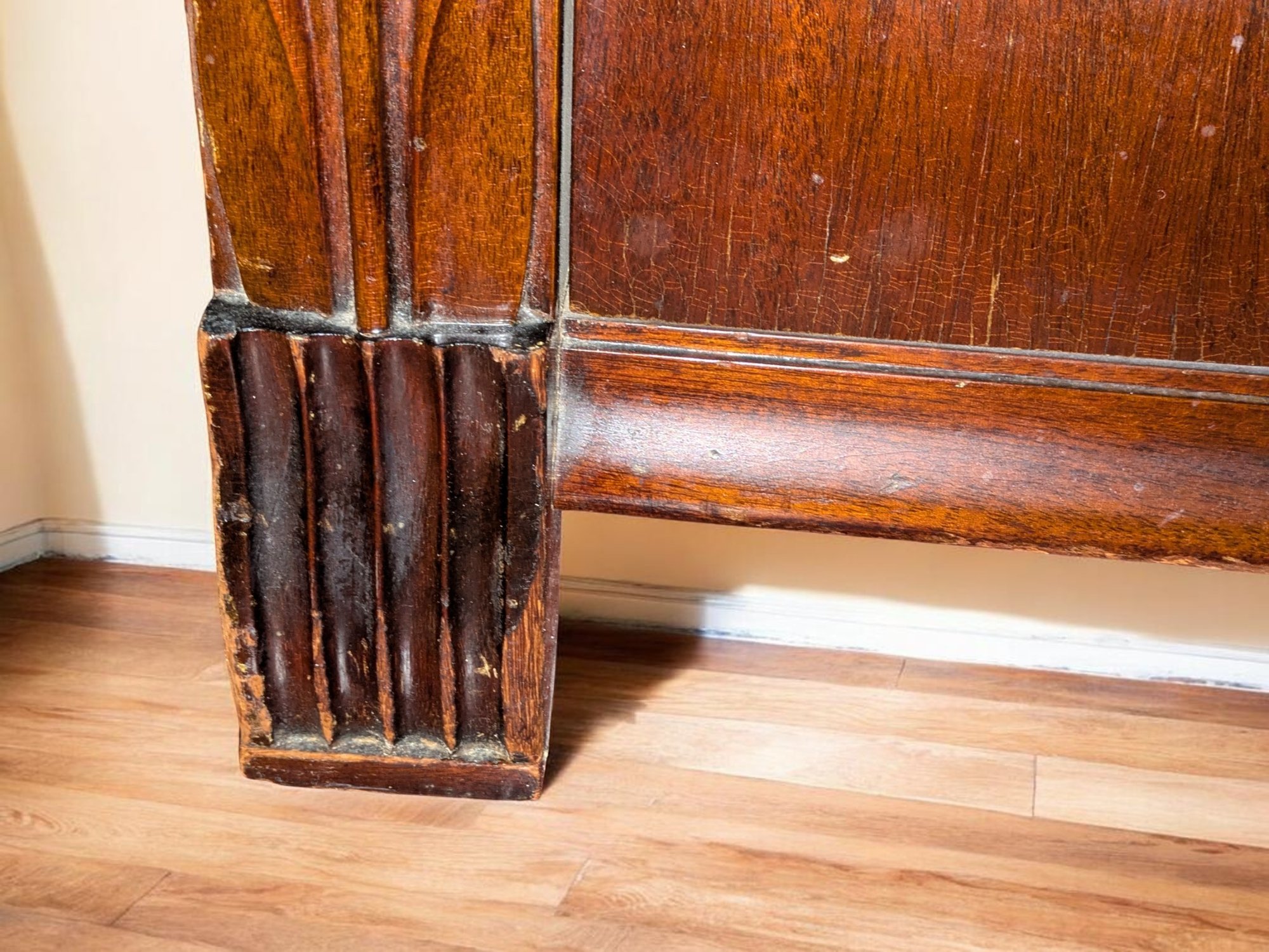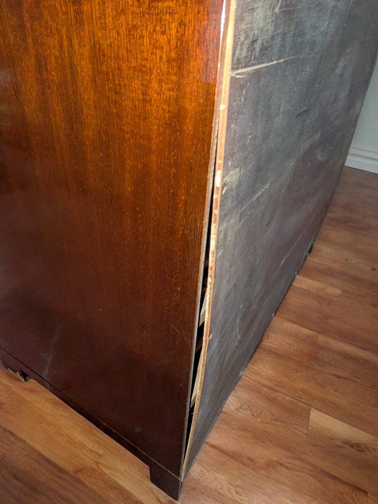 John Stuart, Fine Furniture, Midcentury MCMRosewood 4 Drawer Nightstand Chest/Dresser . Stunning Detail and Design. Made of solid mahogany with decorative leaf carvings on the side columns and ornate leaf-shaped brass drawer pulls. Normal wear & marks. The top has some wear and some faint surface scratches. The front right foot has missing veneer, and one drawer shows slight veneer chipping, all consistent with age and use; most are fillable with stain renew. Please see all photos as part of the description and condition. 38"W x 34"H x 21"D
