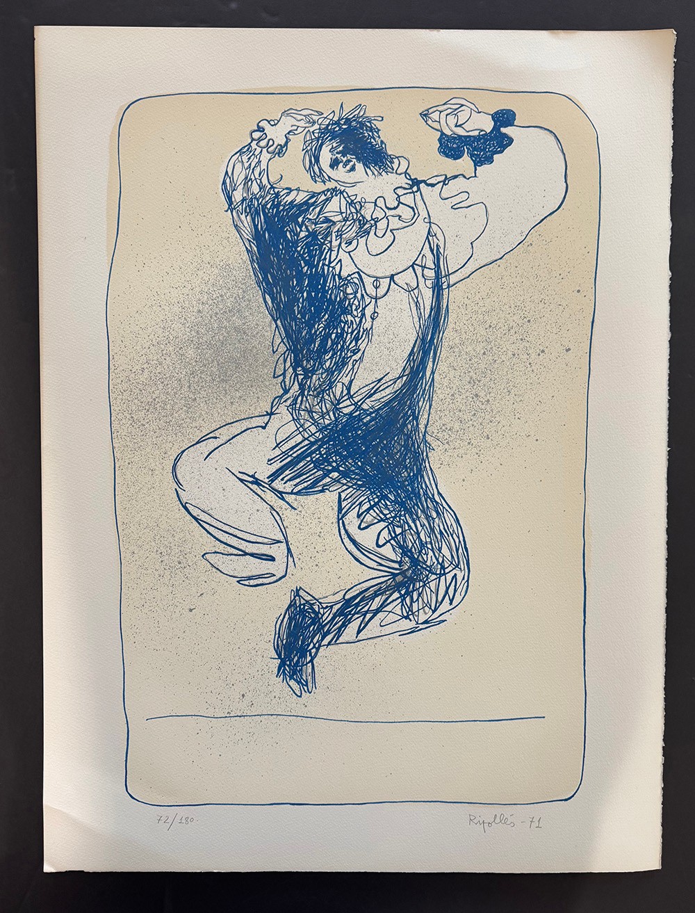This is a highly collectable limited edition 1971 lithograph by Juan Garcia Ripolles titled Arlequin leaping. This print is hand signed and numbered in pencil by Jaun Garcia Ripolles. This amazing piece is printed on heavy weight Arches paper with an edition of 180. Print size 25.5 x 19 inches, image size 21.75 x 14.25 inches .