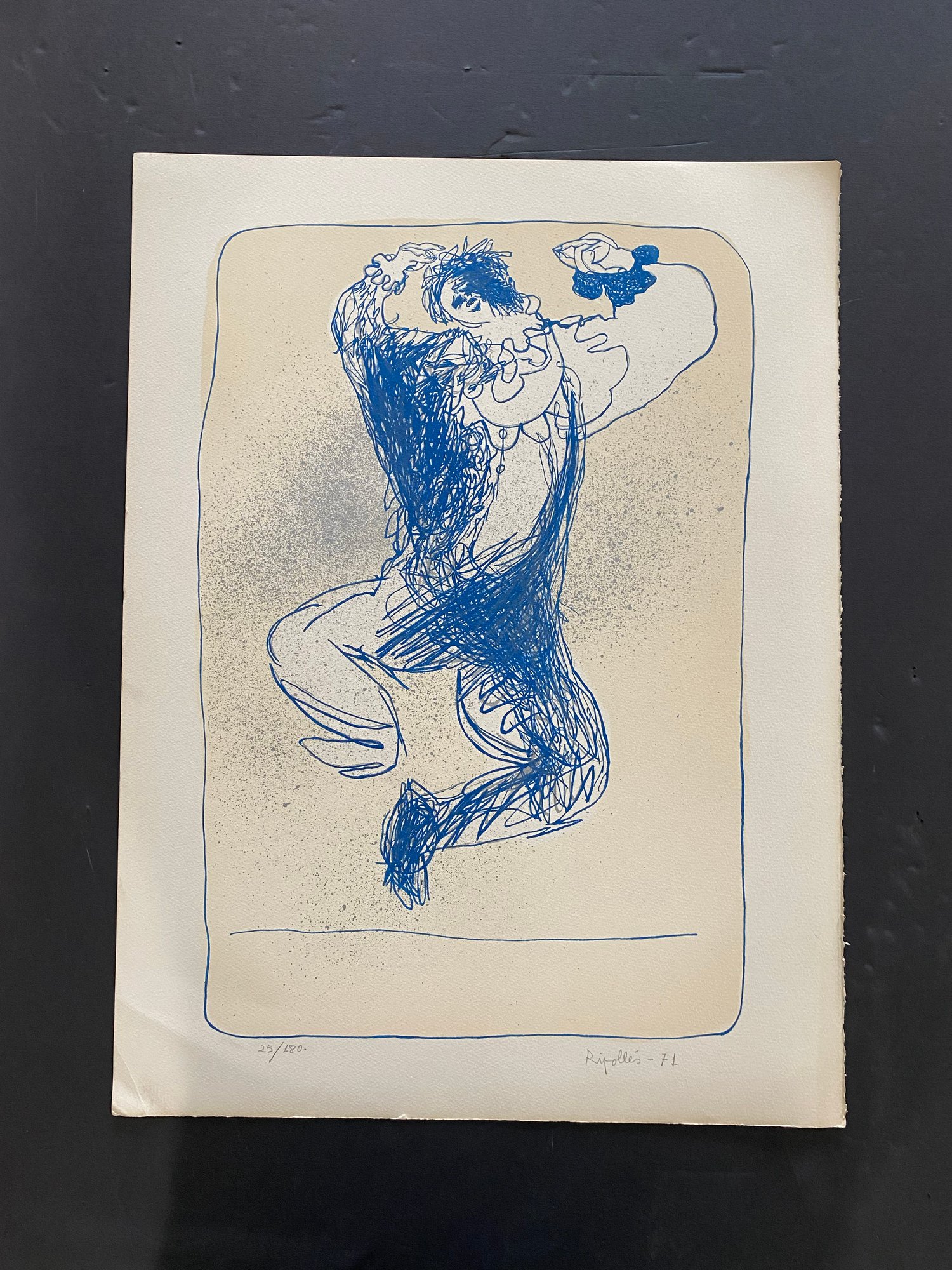 This is a highly collectable limited edition 1971 lithograph by Juan Garcia Ripolles titled Arlequin leaping.