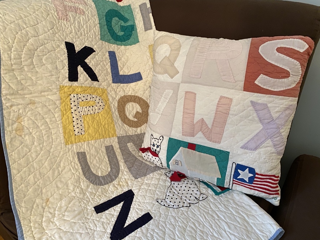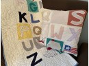 "Alphabet" Quilt Made of Happy Colors- Perfect for a Boy or Girl to learn the Alphabet. Overall good condition, but blanket does have a bit of staining.