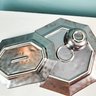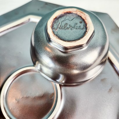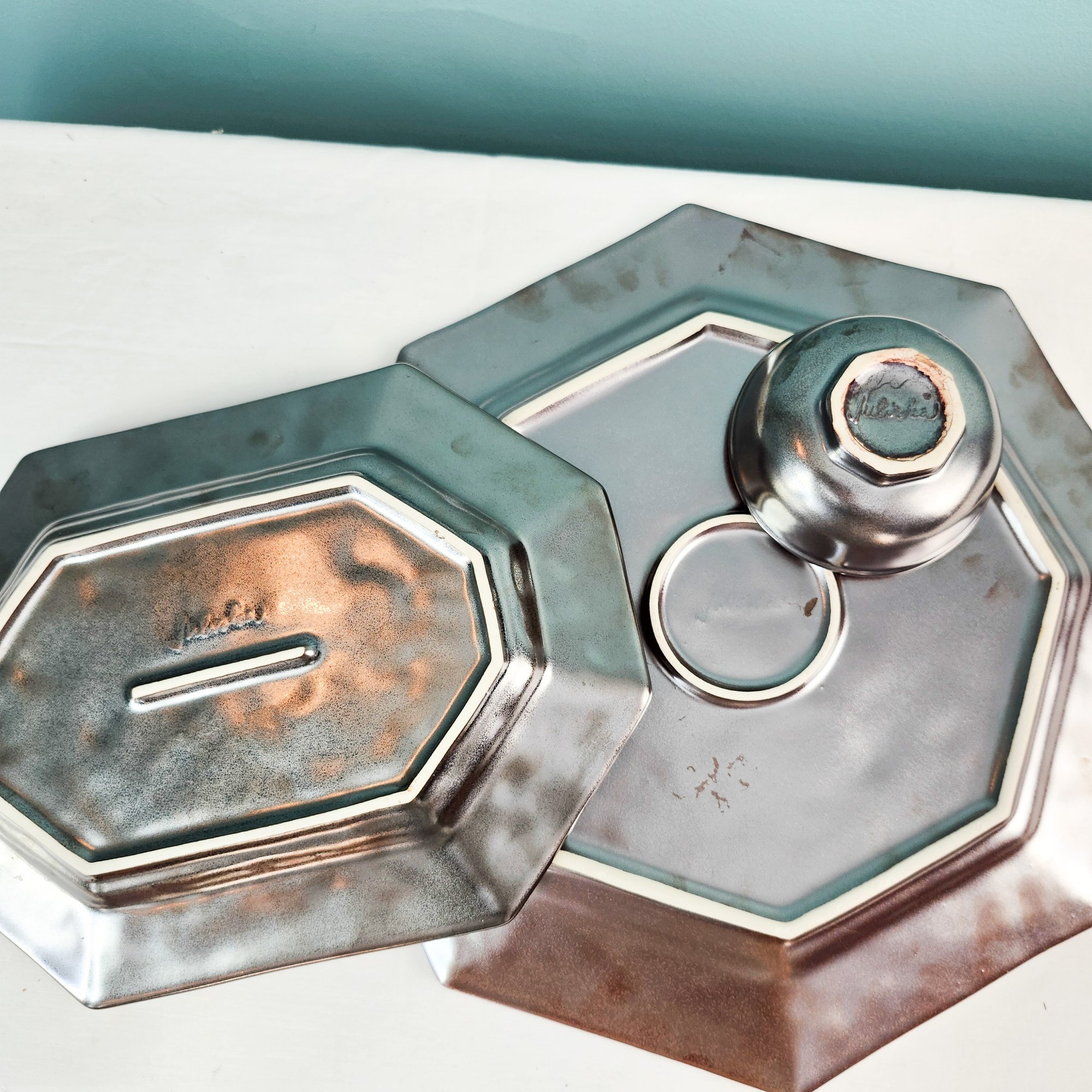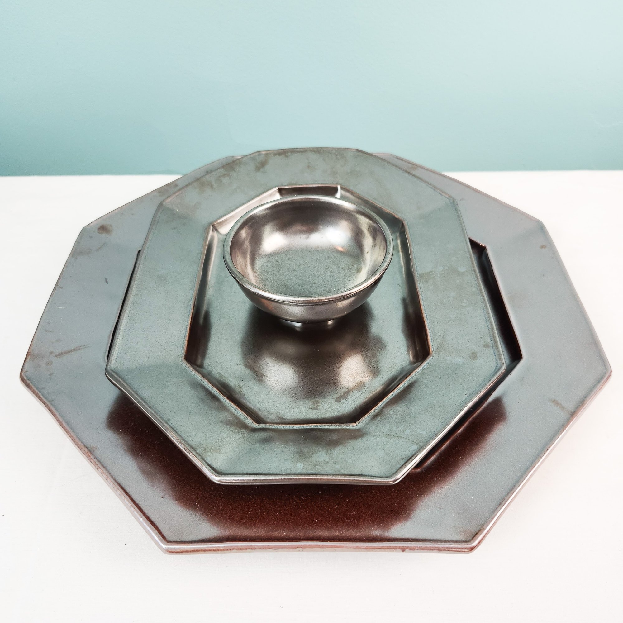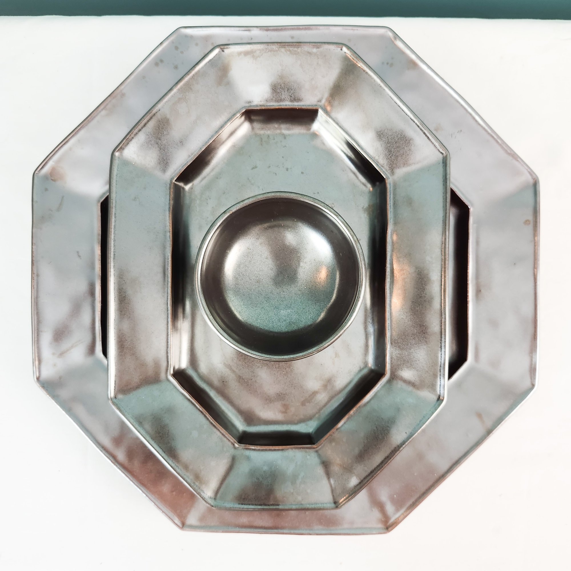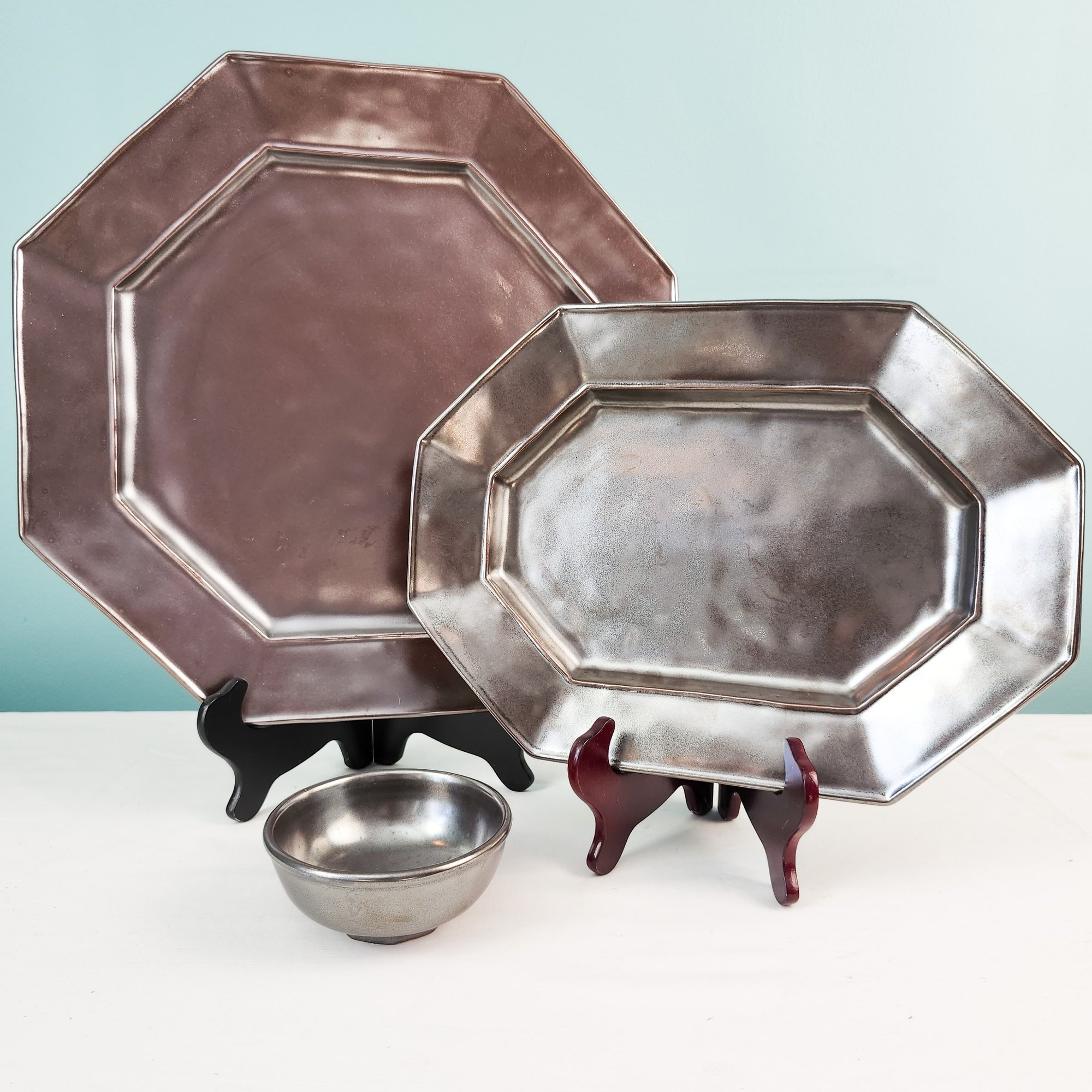 Three pretty silver luster dishes by Juliska. there is a large octagonal platter, a smaller long platter, and a small bowl. They call this glaze Pewter, which makes sense. Measurements of large platter.