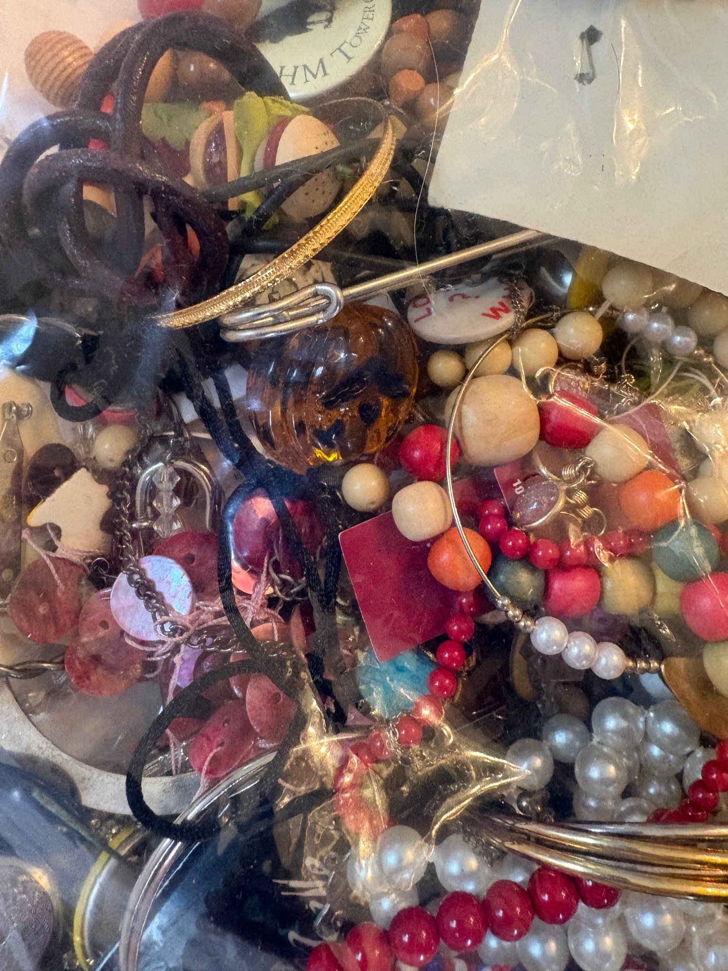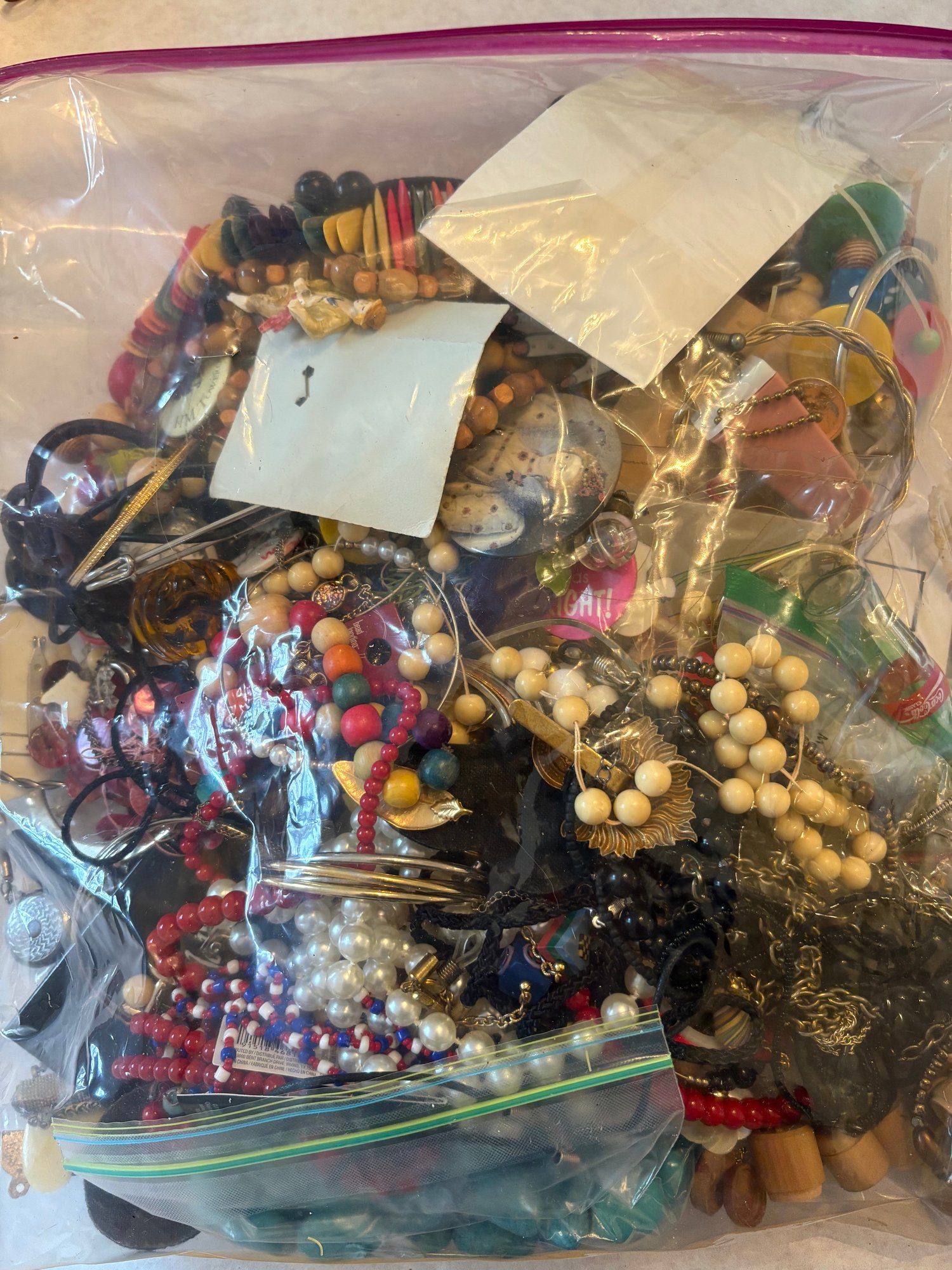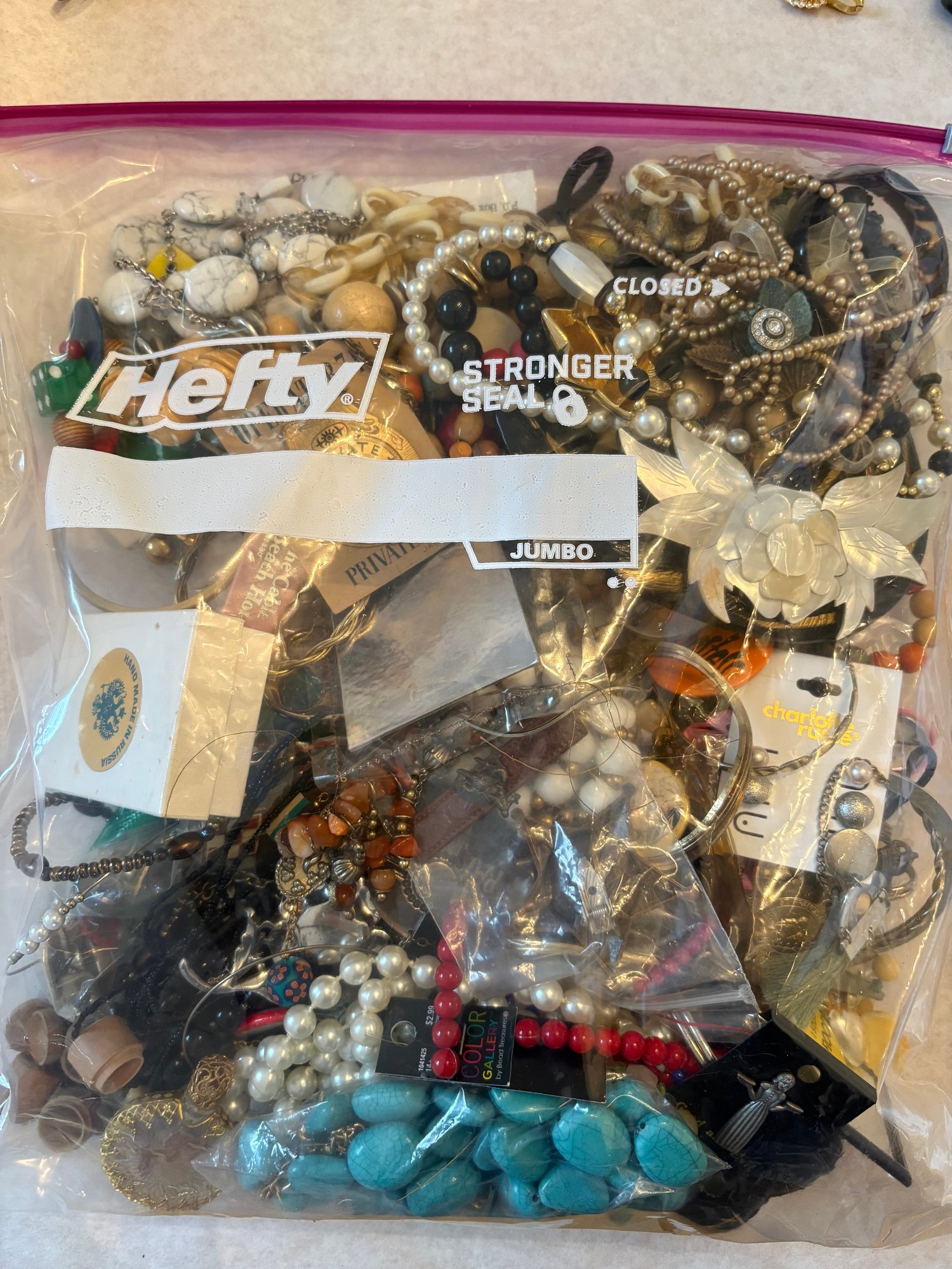 Jumbo size clear bag filled with jewelry.