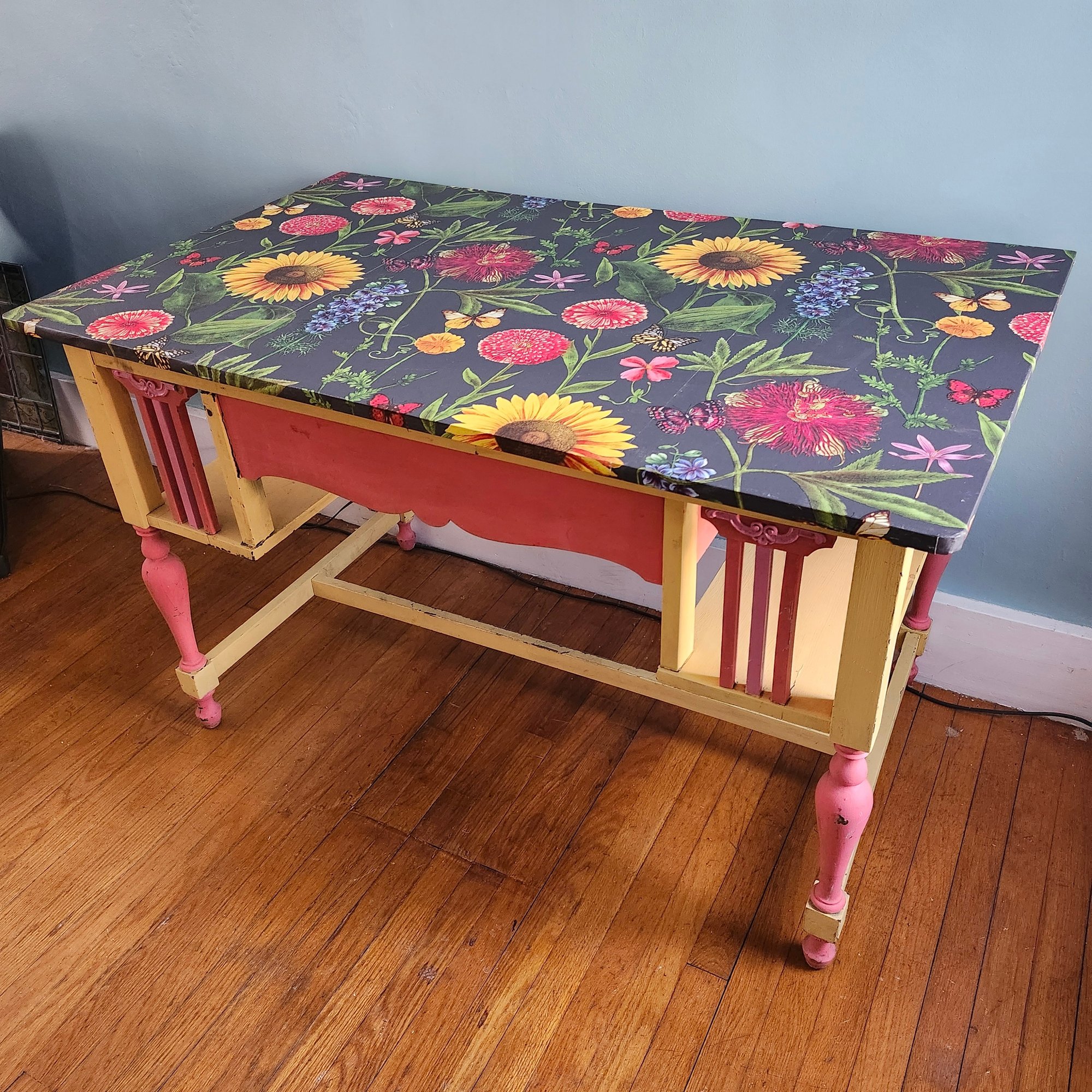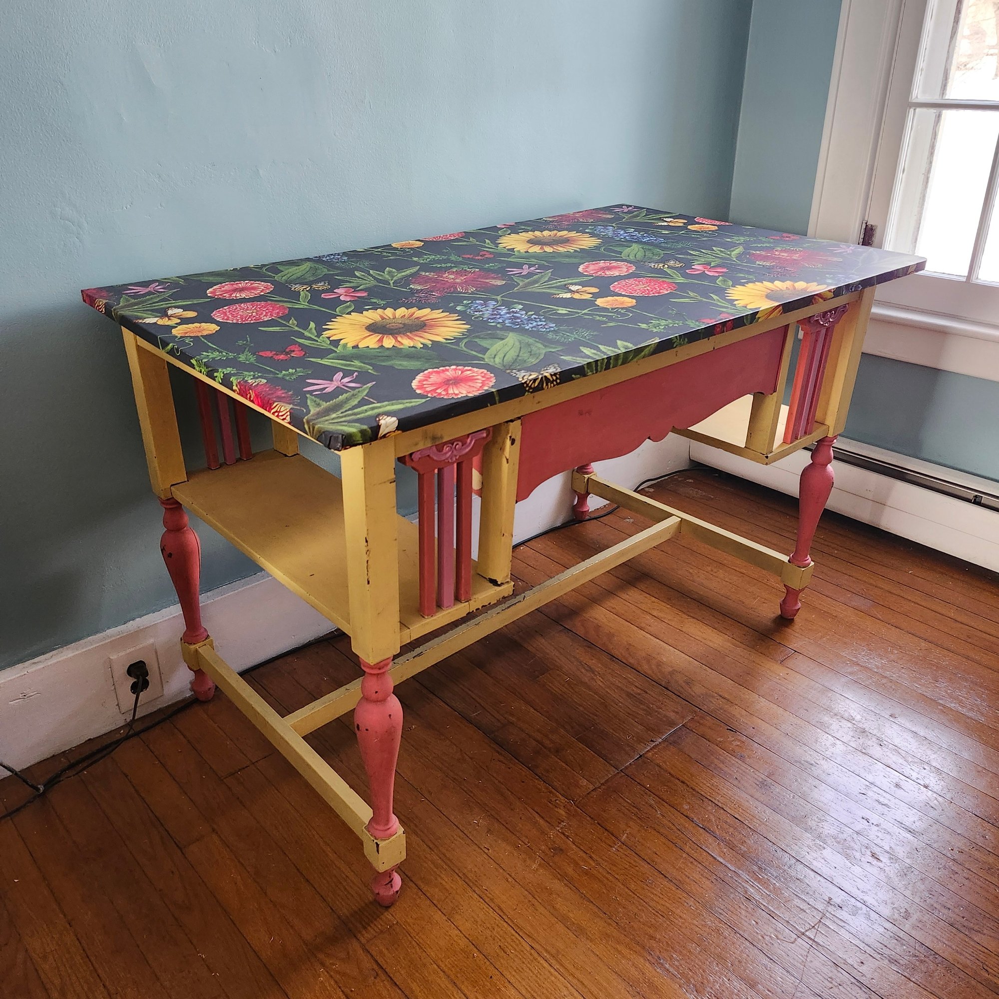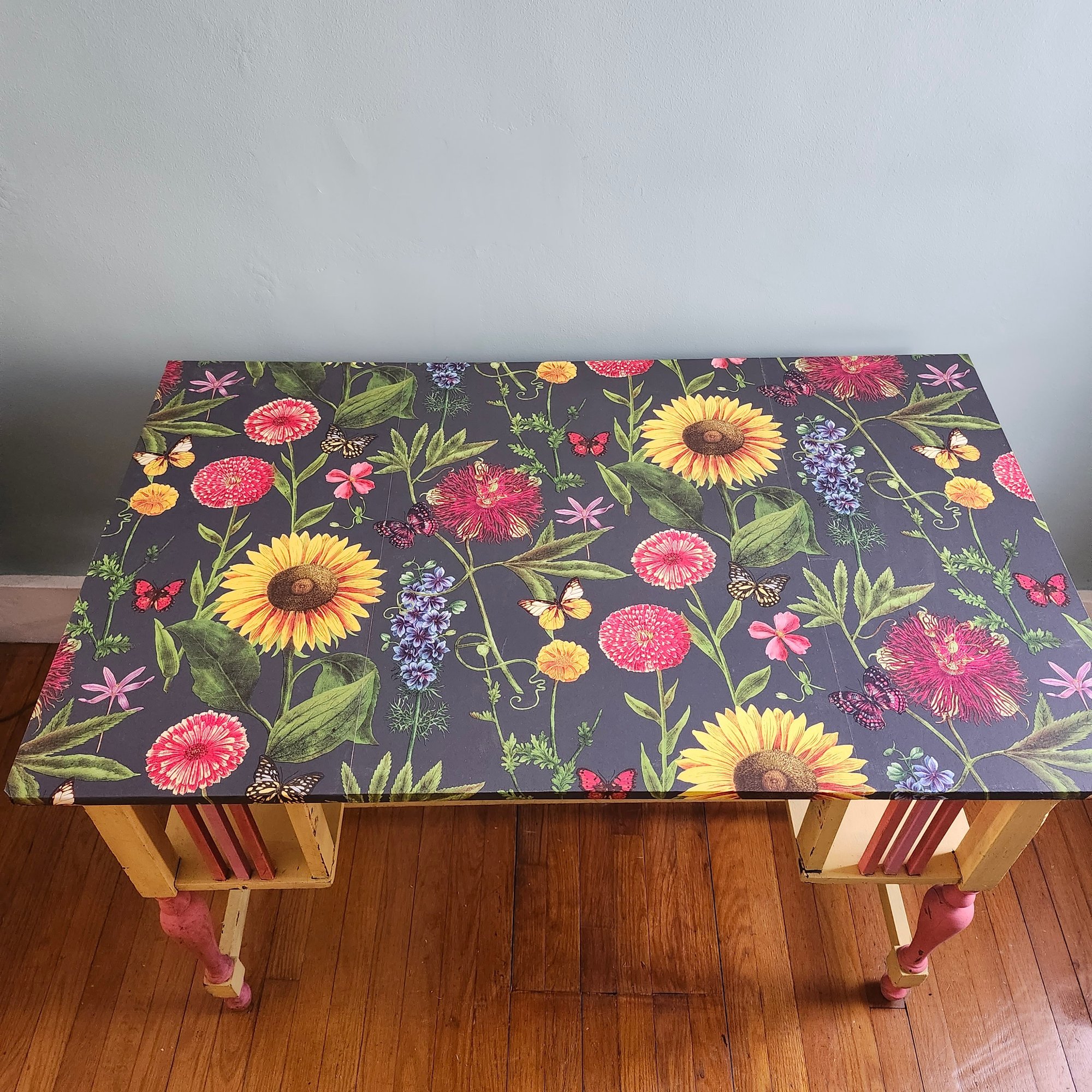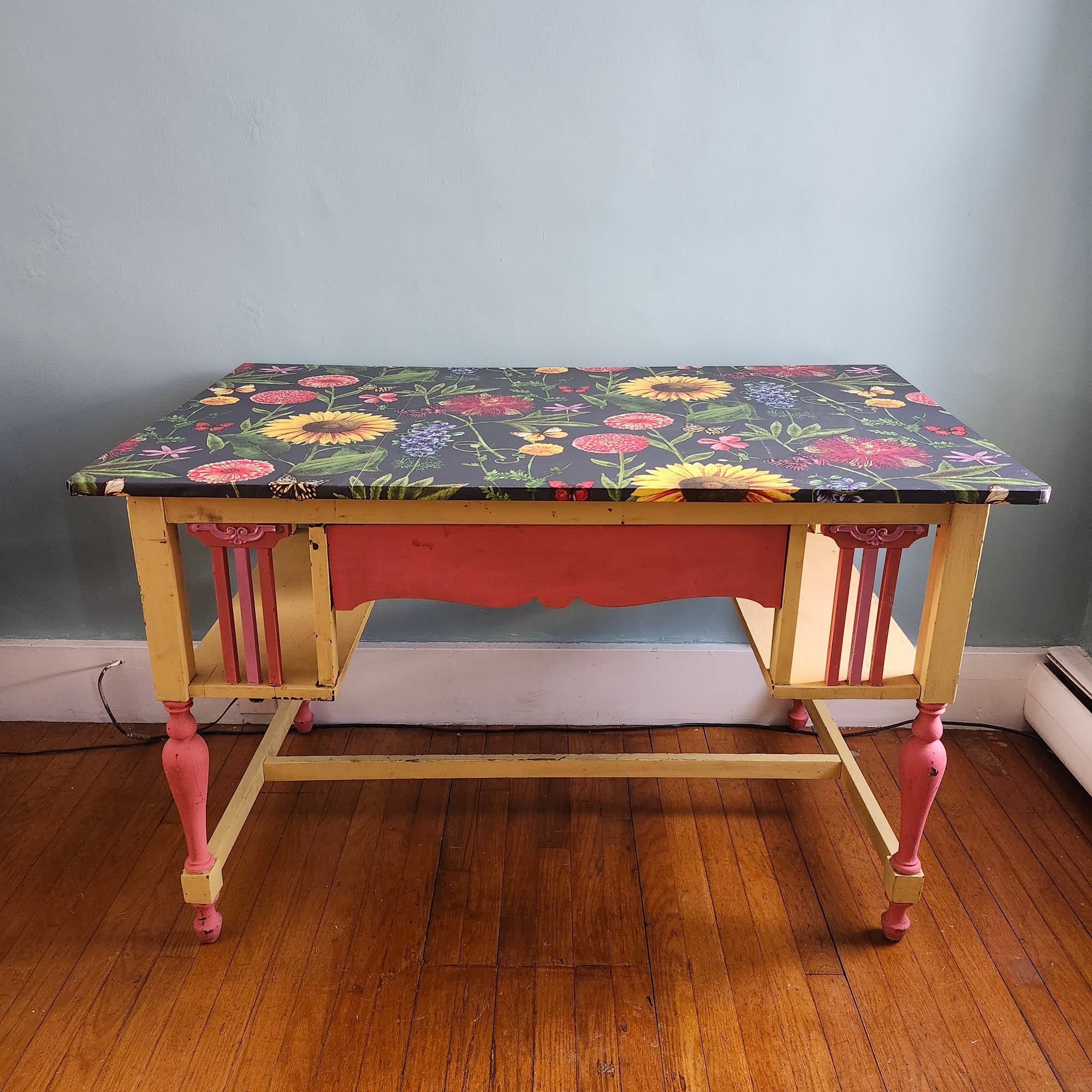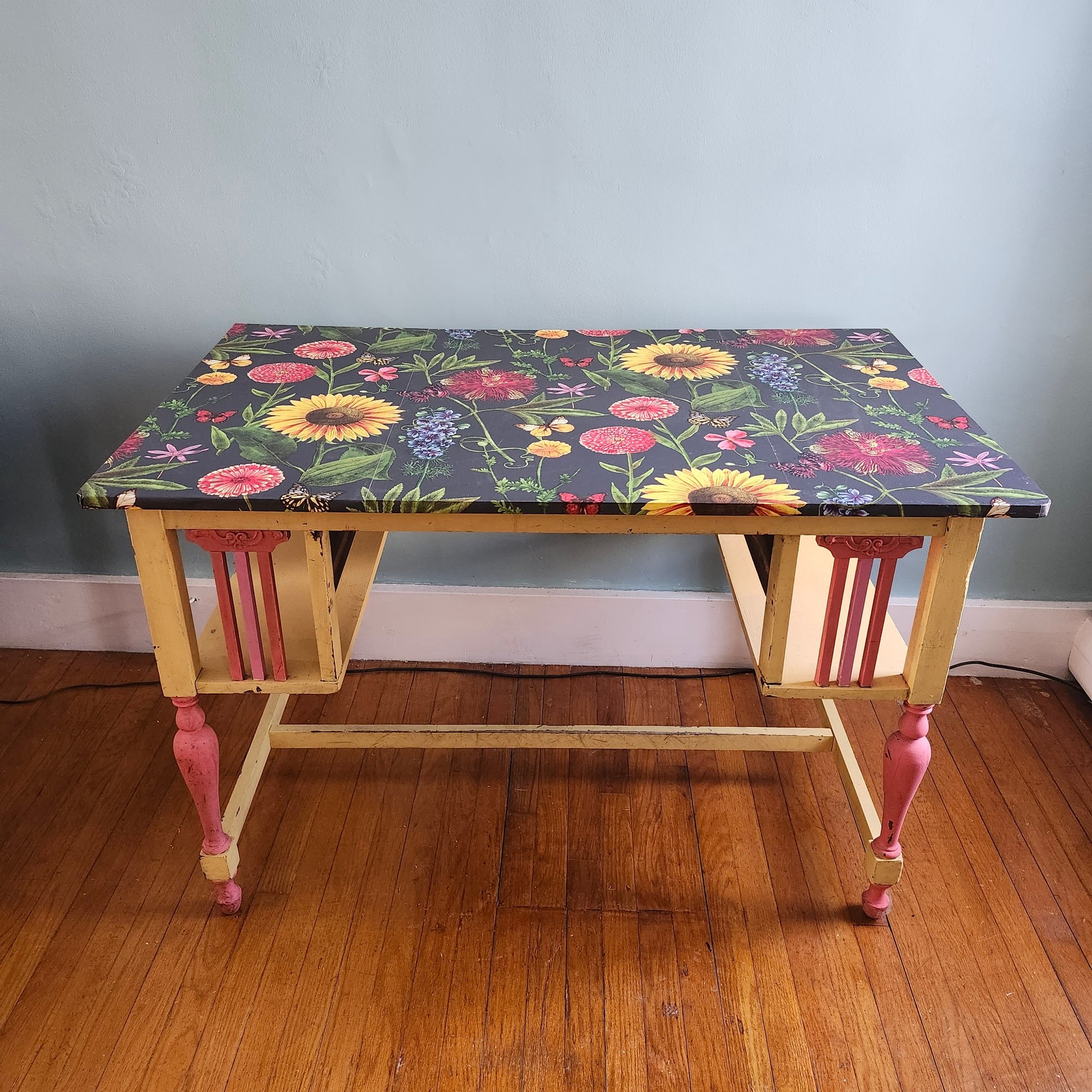 Colorful desk with side shelves and removable top that has been covered with contact paper with flower and butterfly design. Desk is painted pink and yellow.