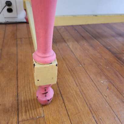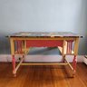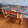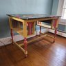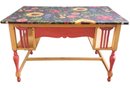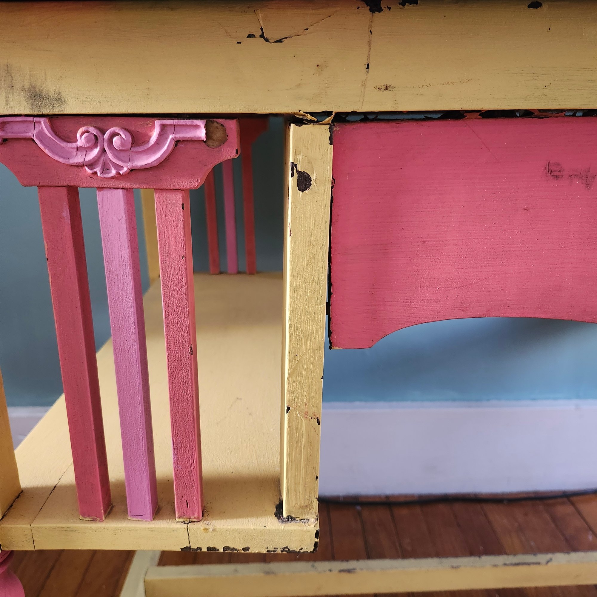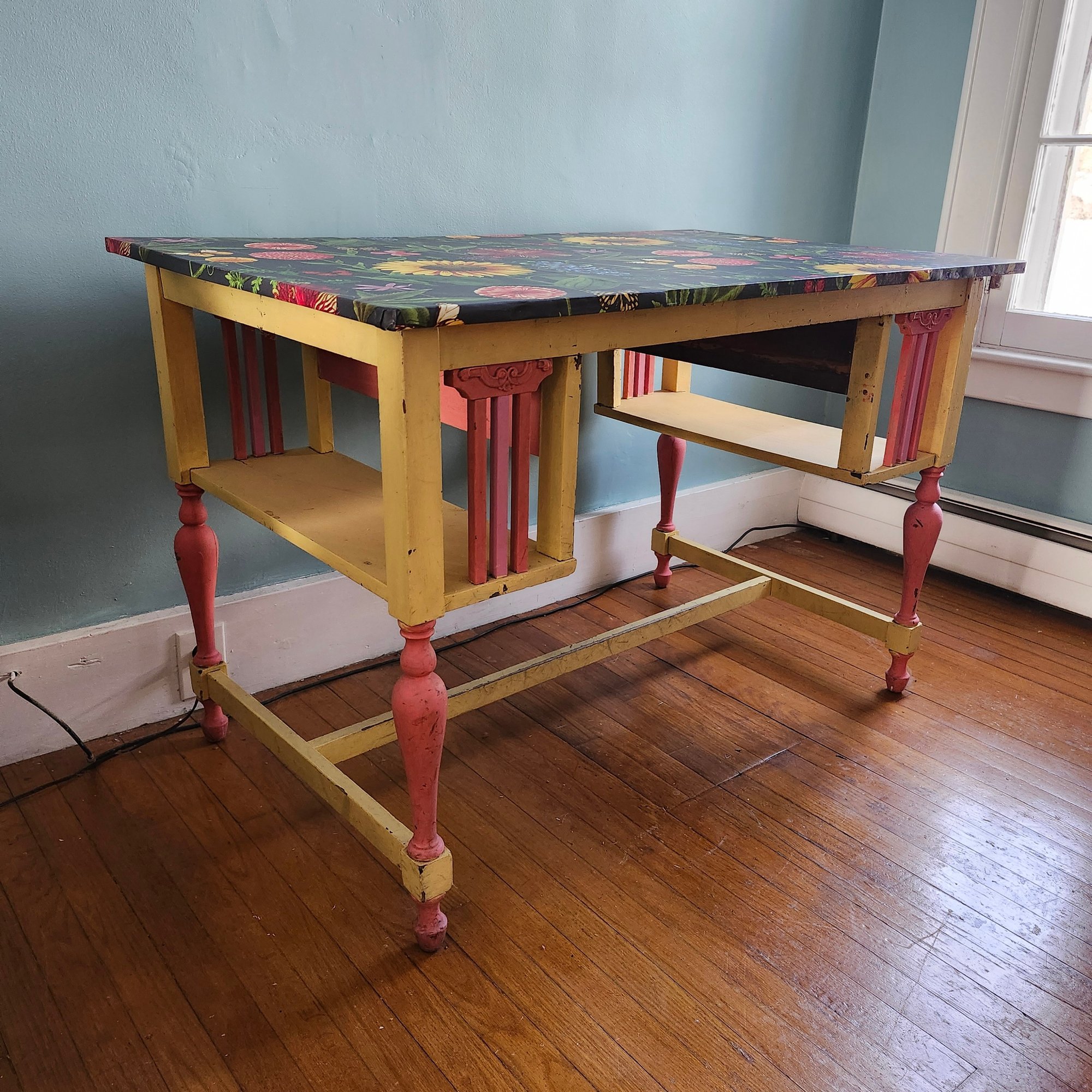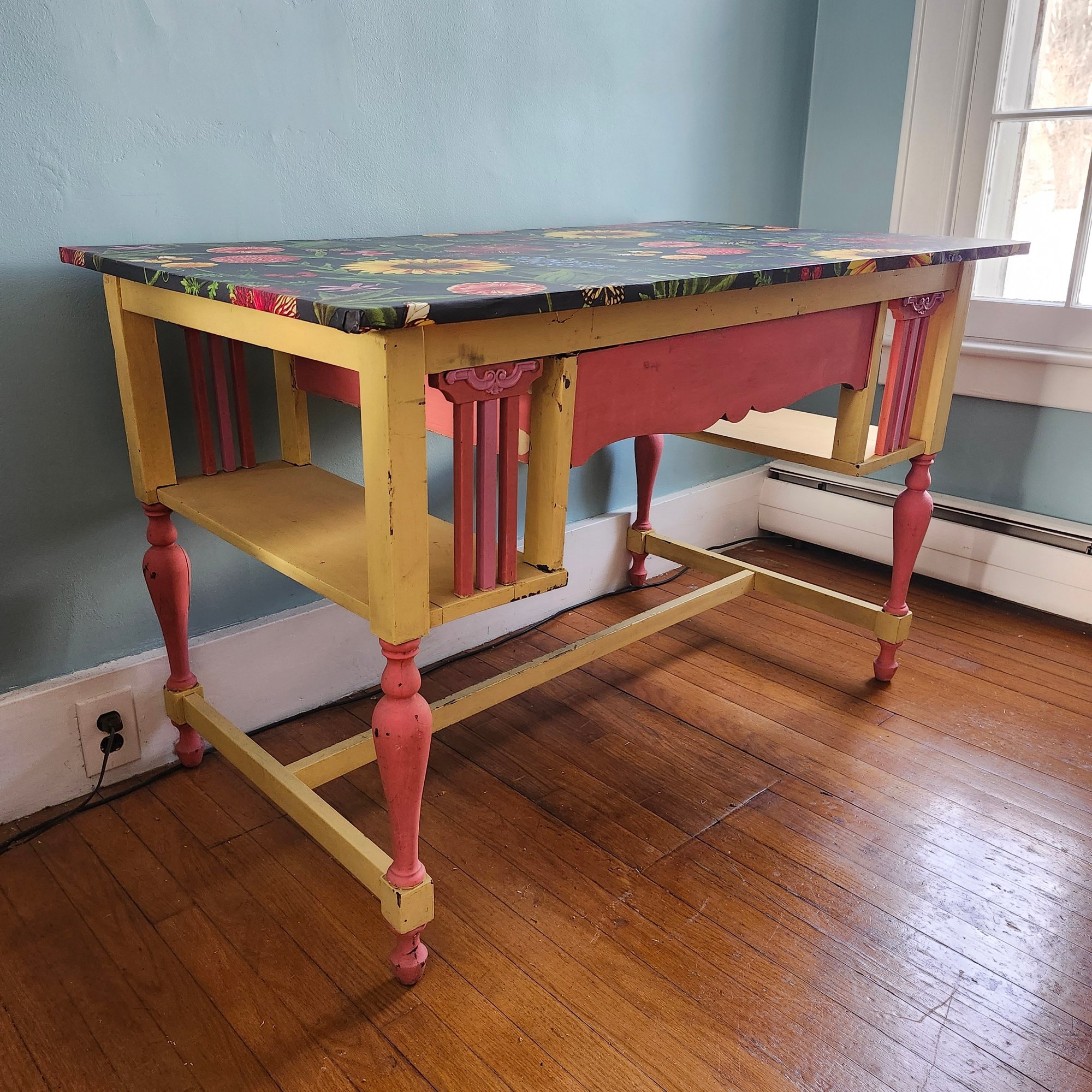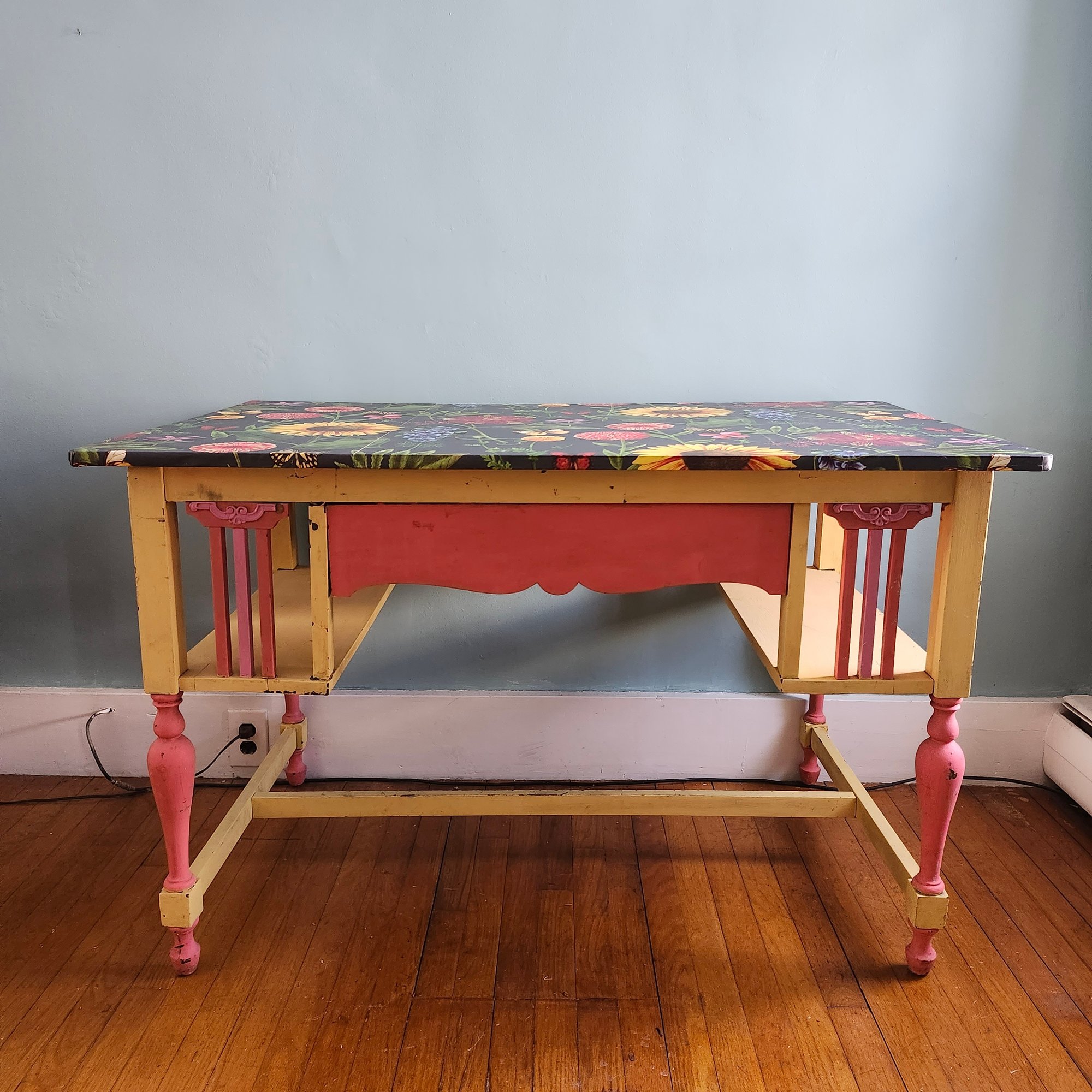 Colorful desk with side shelves and removable top that has been covered with contact paper with flower and butterfly design. Desk is painted pink and yellow.