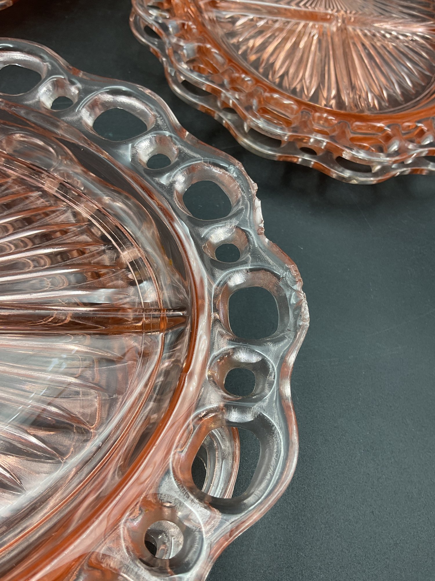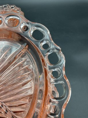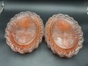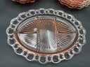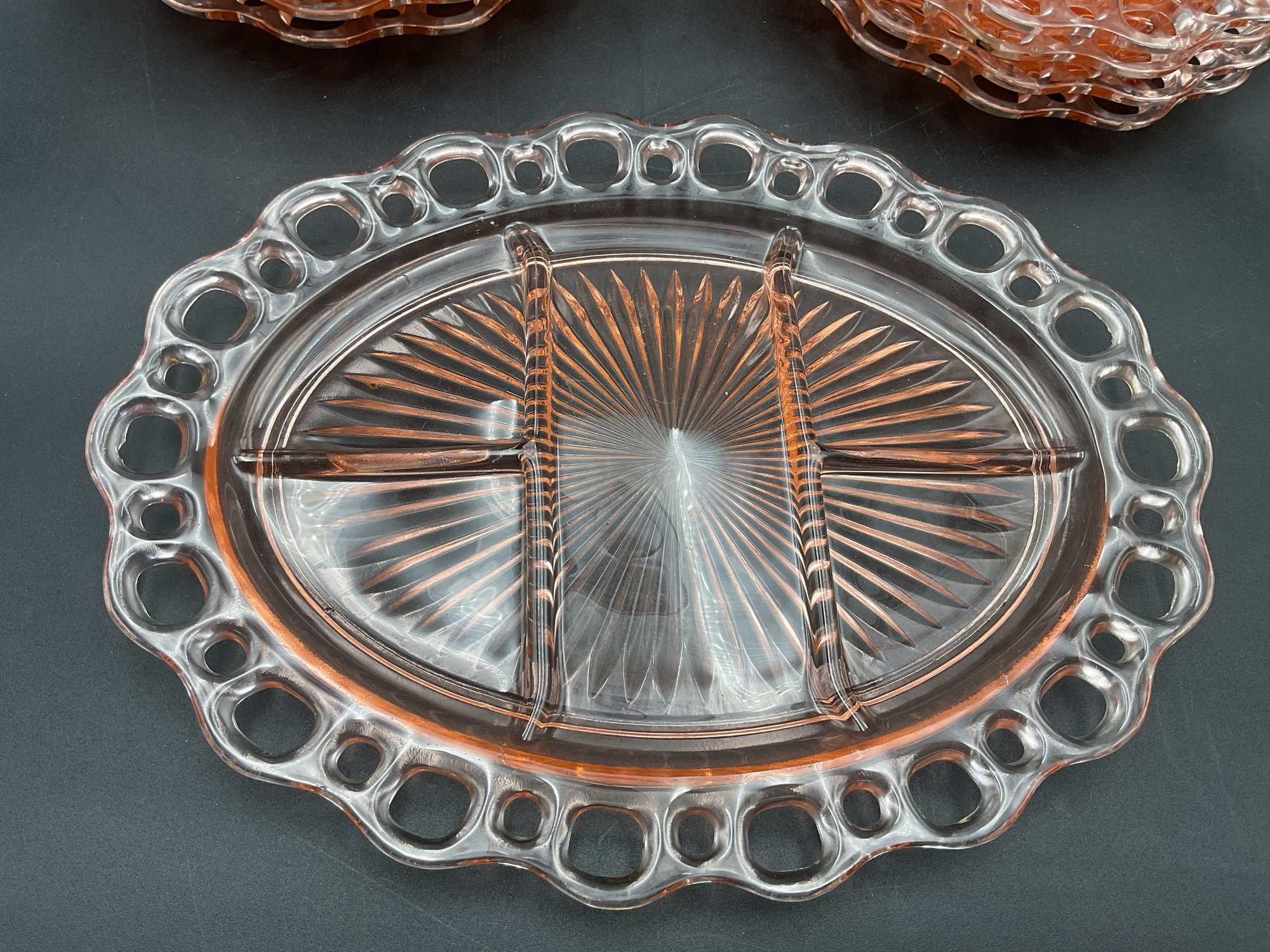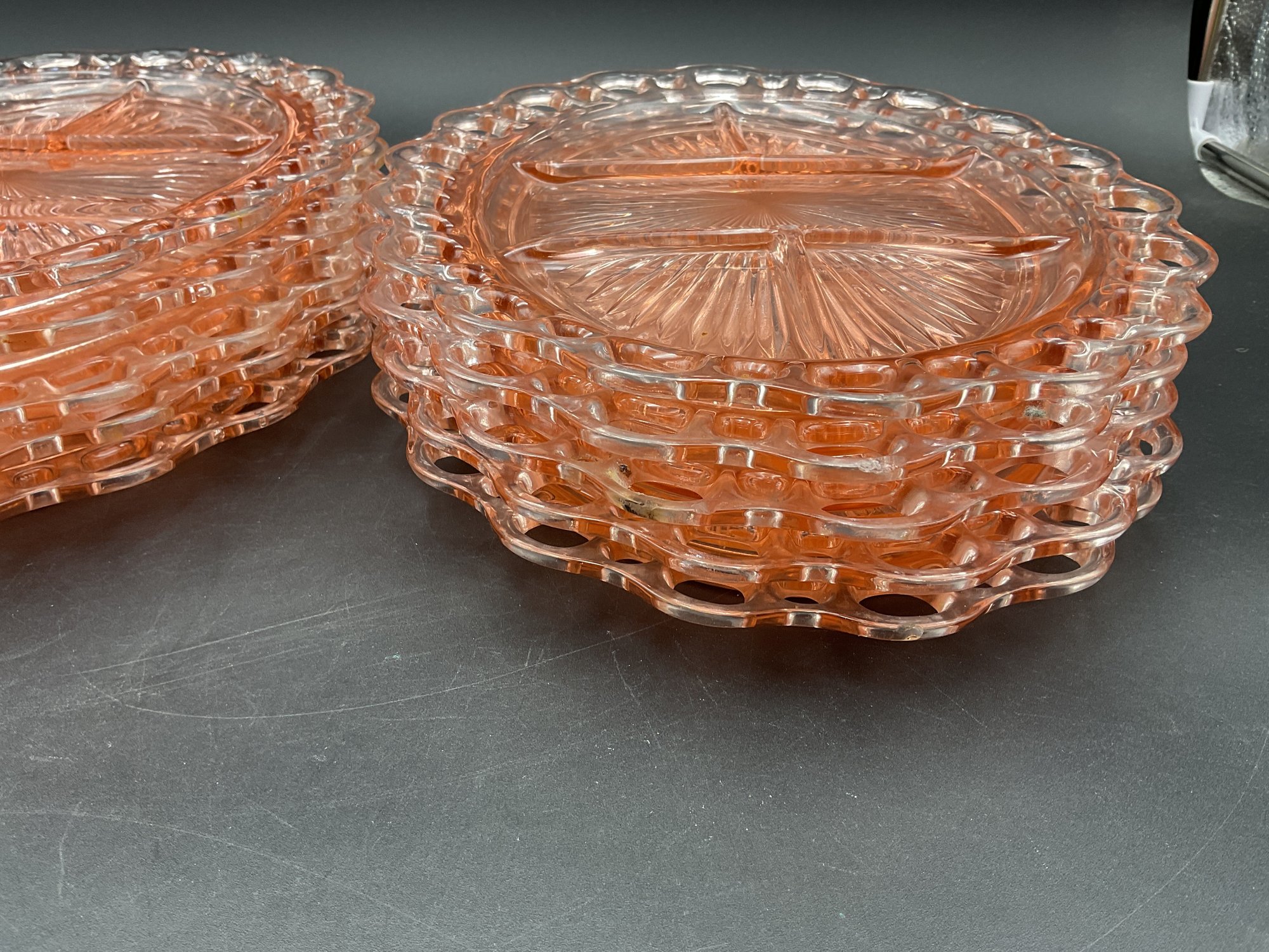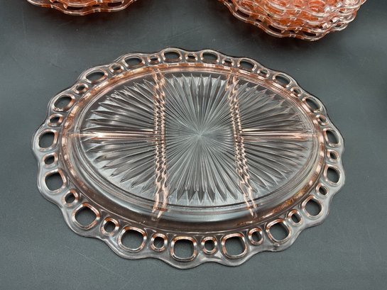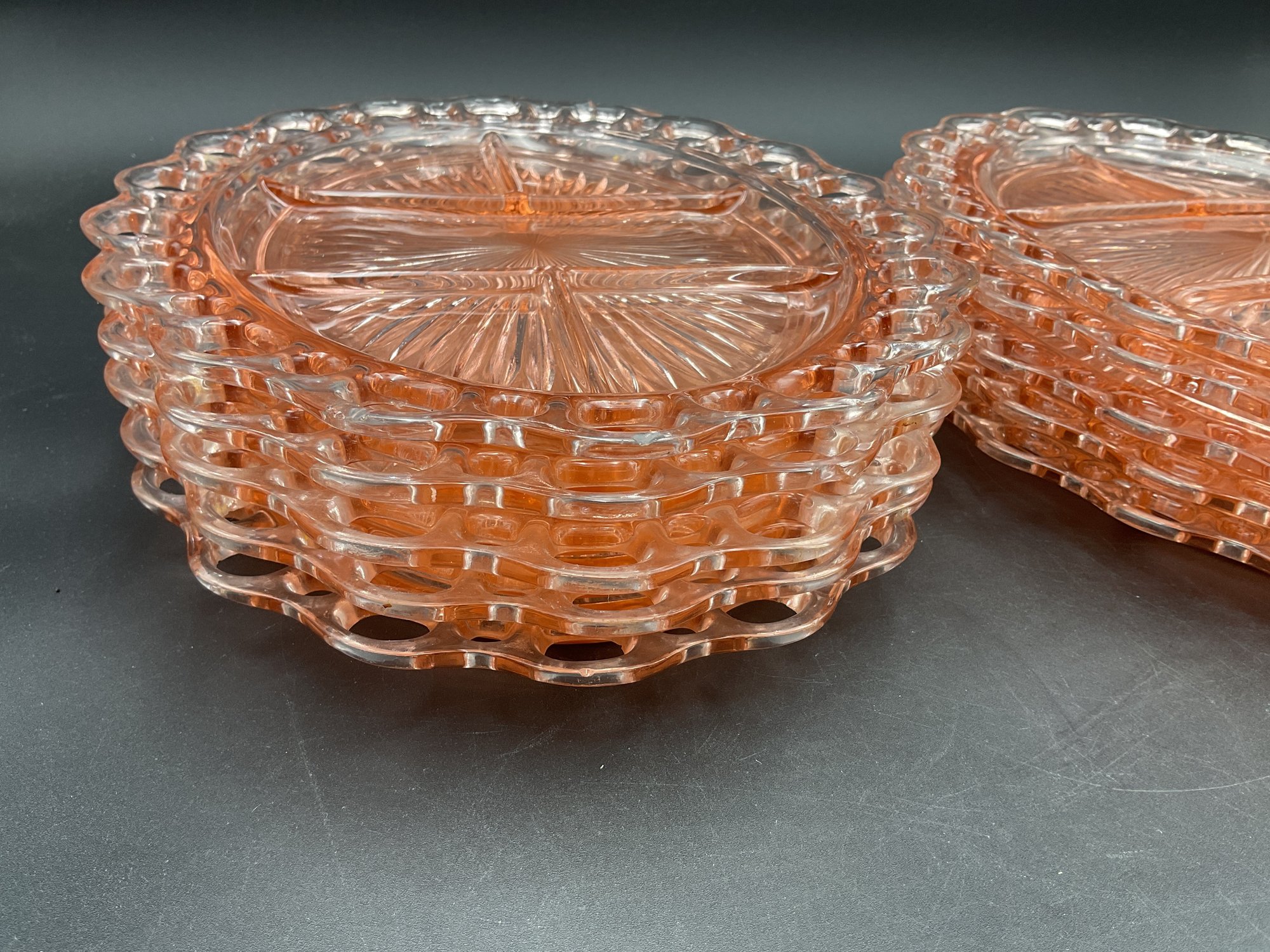 Ten Anchor Hocking Old Colony (aka Open Lace or Lace Edge) pink depression glass large divided serving dishes. Vintage from the 1930's, this is an amazing collection! A couple are in excellent condition, the others have minor flaws (chips at the edges, one with crack at the center) - see photos for details. These sell online for $15-20 each!
