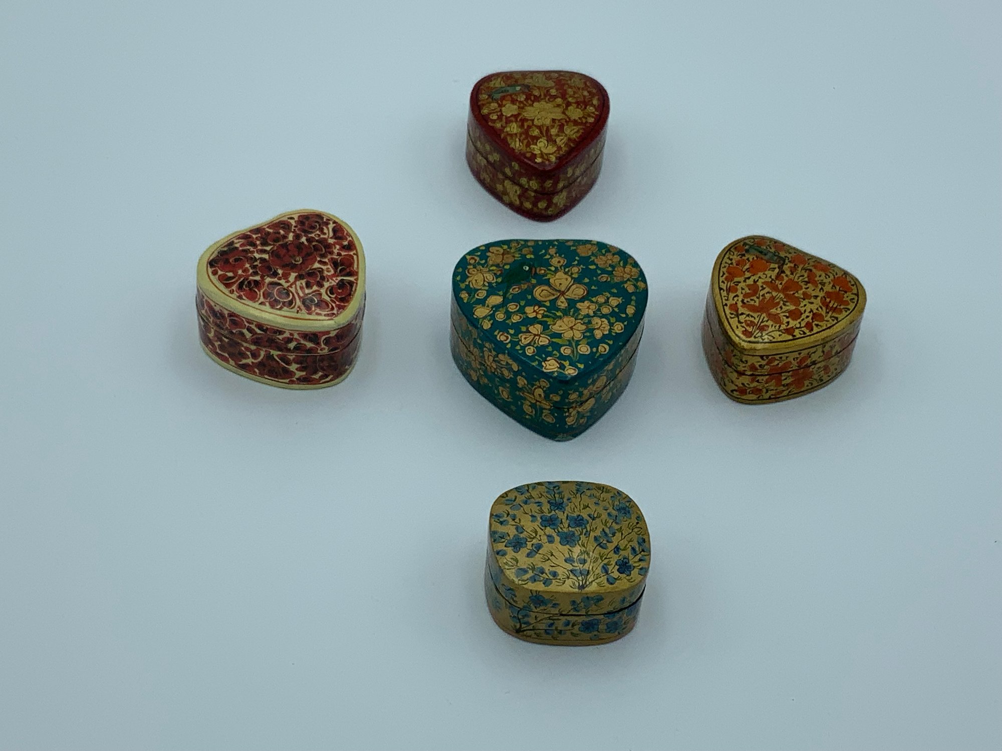 A collection of hand painted trinket boxes purchased by the owner in Kashmir. This lot includes heart shaped boxes all in very good condition. See photos for details