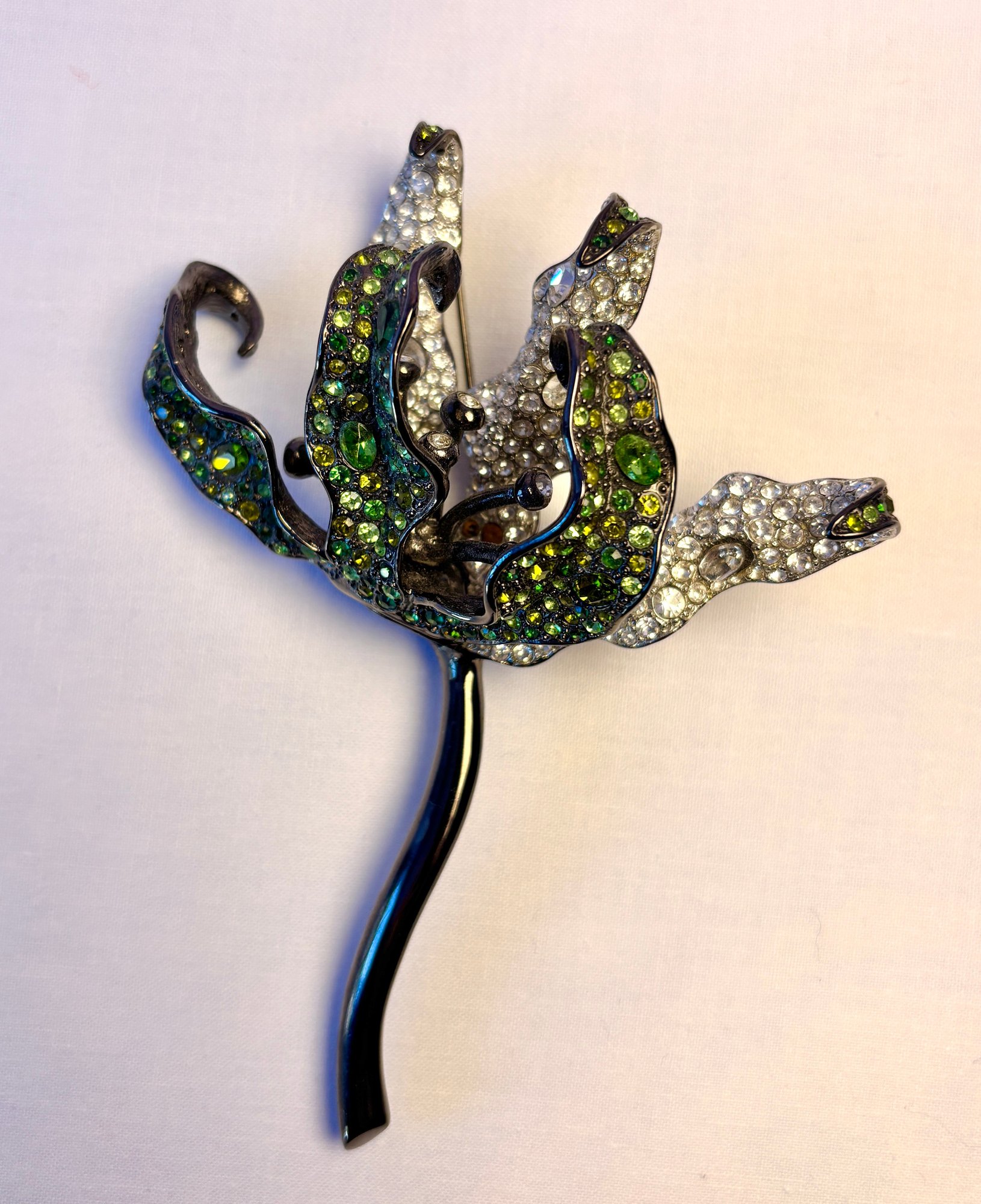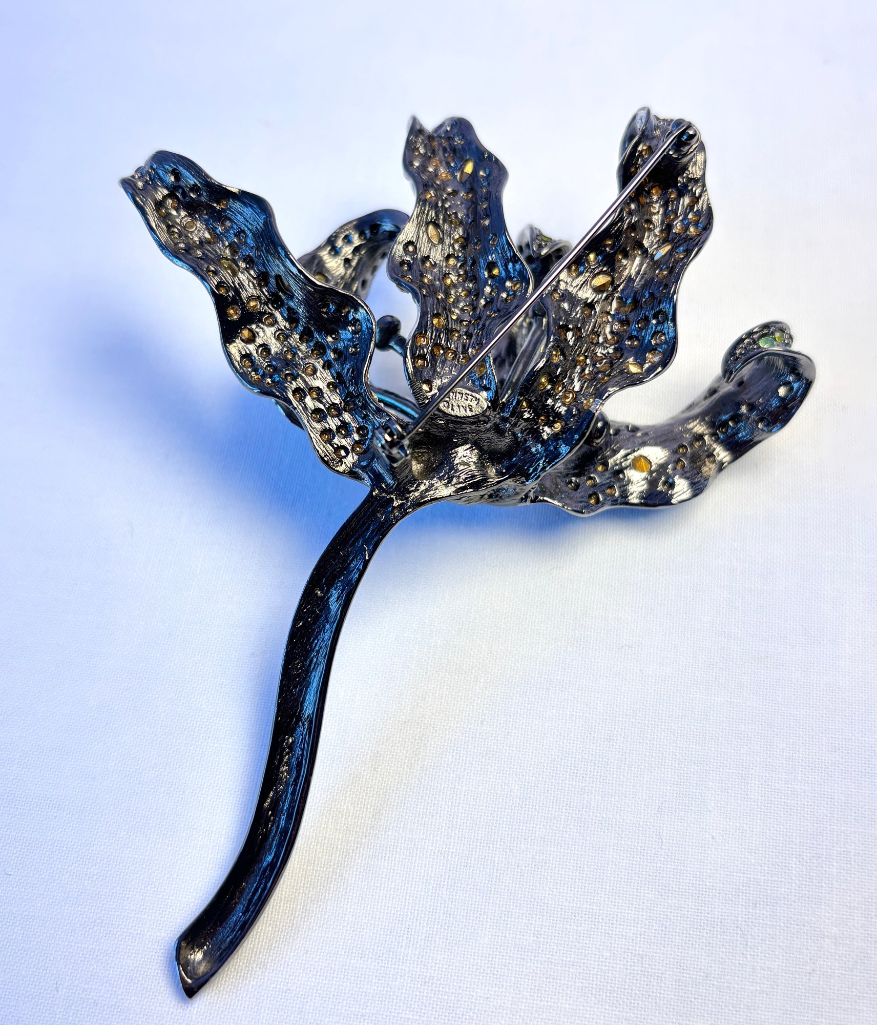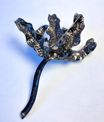 Gunmetal enamel and crystal rhinestone large dimensional lily brooch.