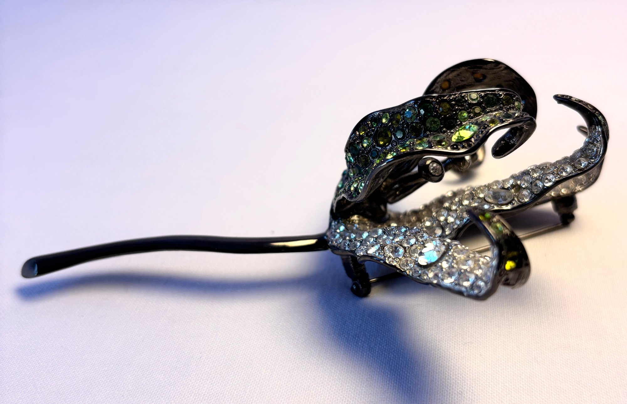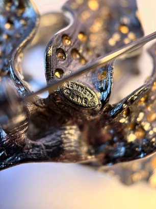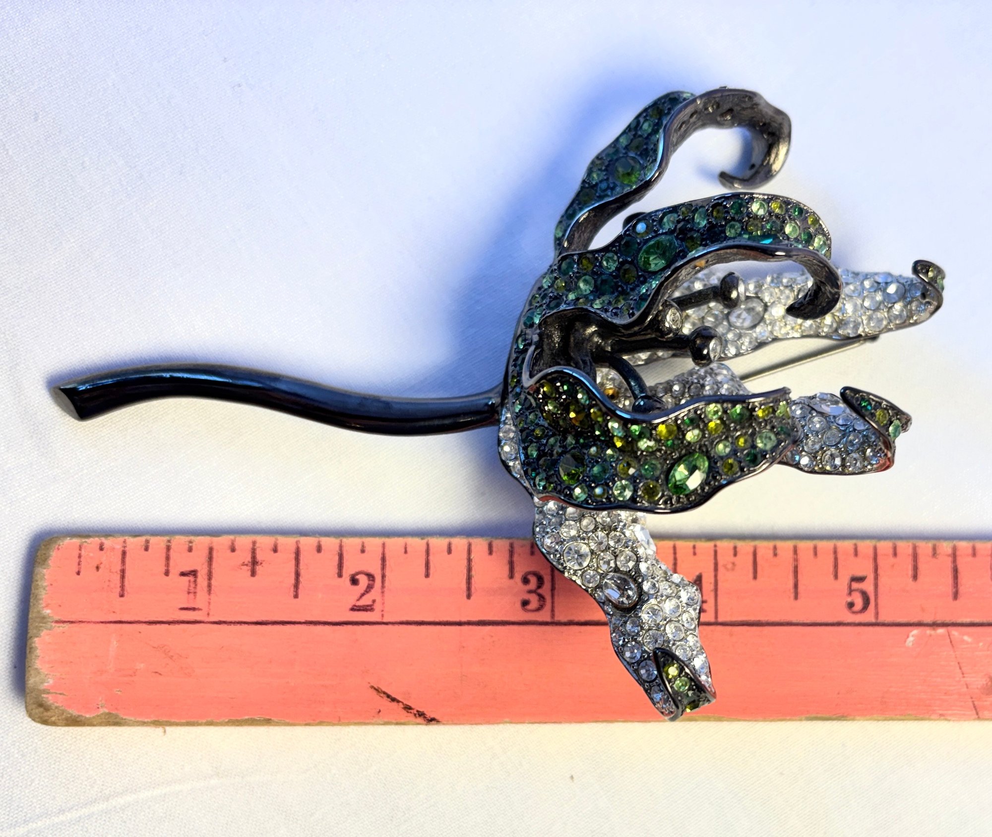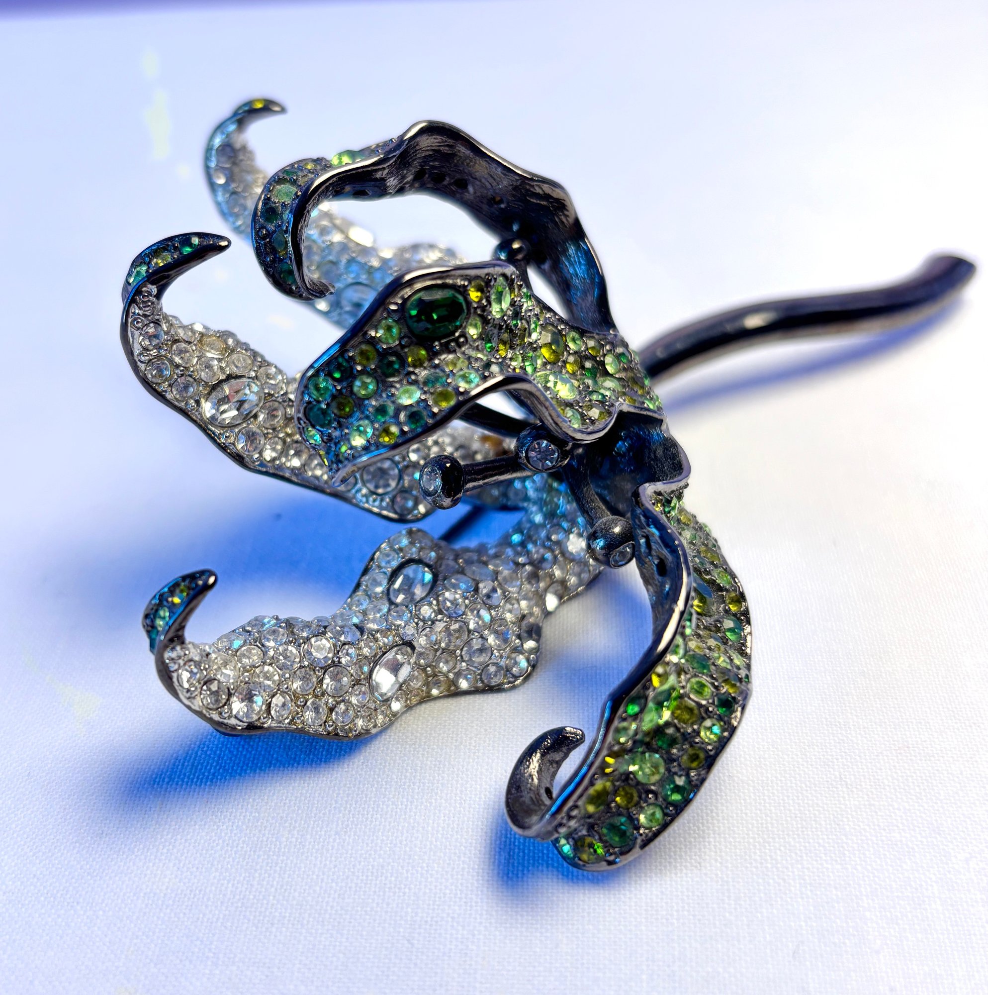 Gunmetal enamel and crystal rhinestone large dimensional lily brooch.