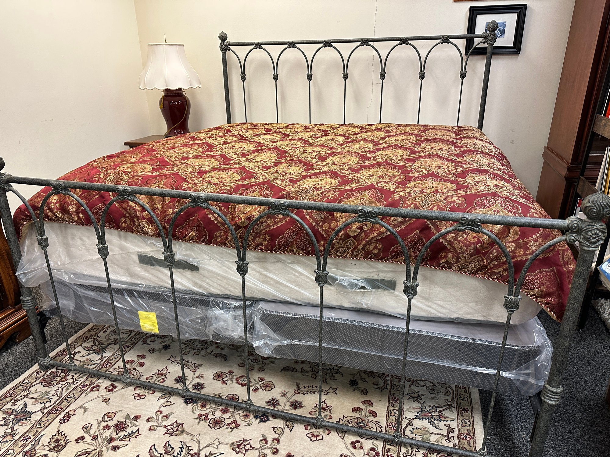 includes: Headboard footboard and frame. Really nice bed goes with many decor. 58" high 76 wide. mattress and bedding not included