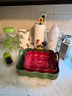 dry pan, 2 ceramic cookware dishes, 1 ceramic pitcher, coffee thermos, knife sharpener, cooler cups