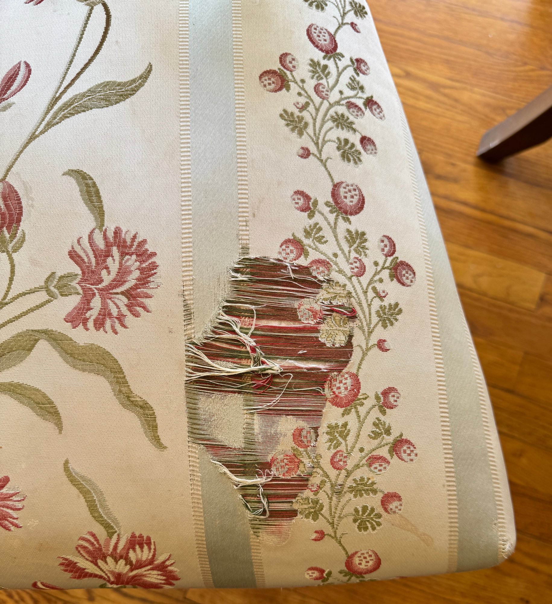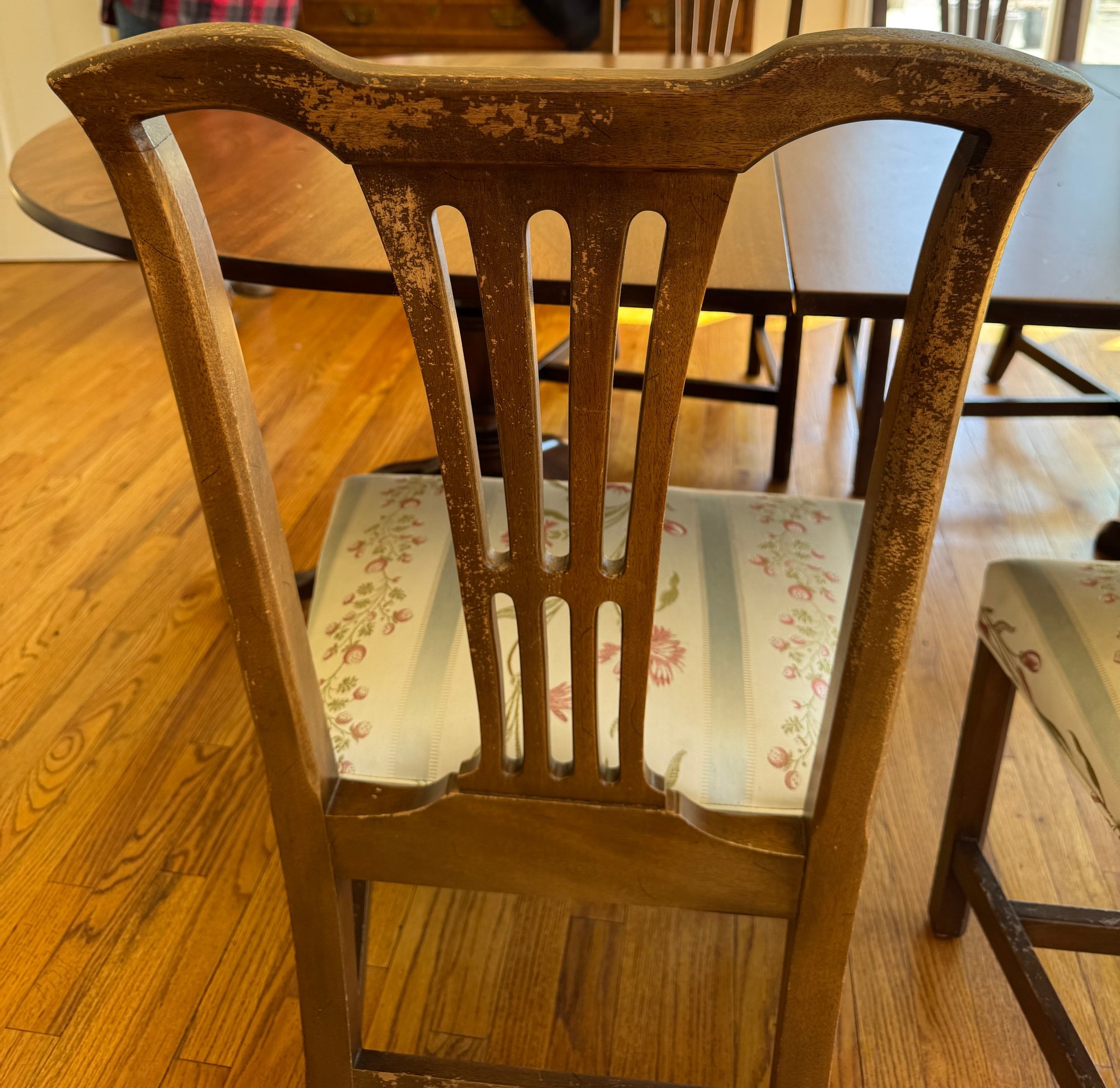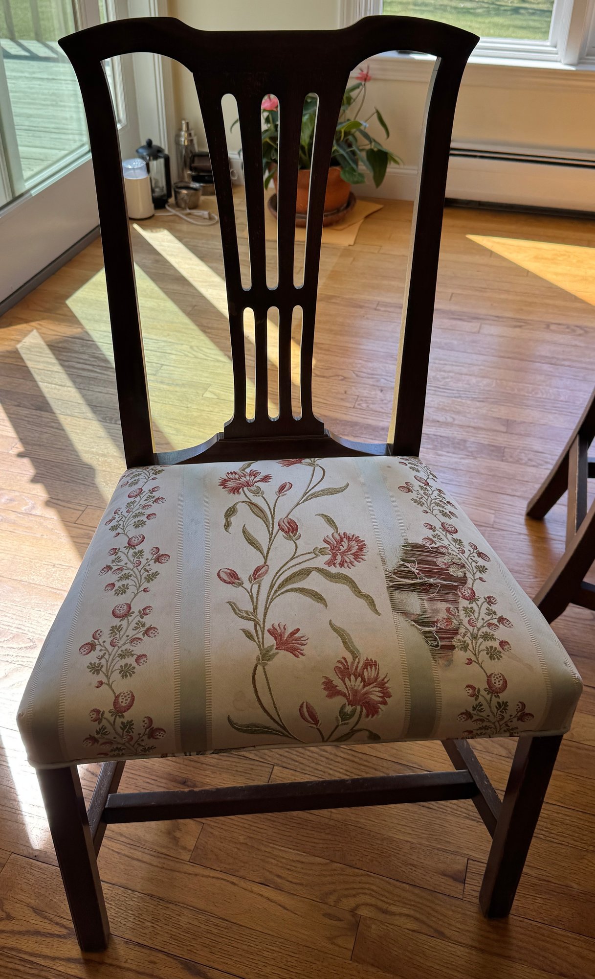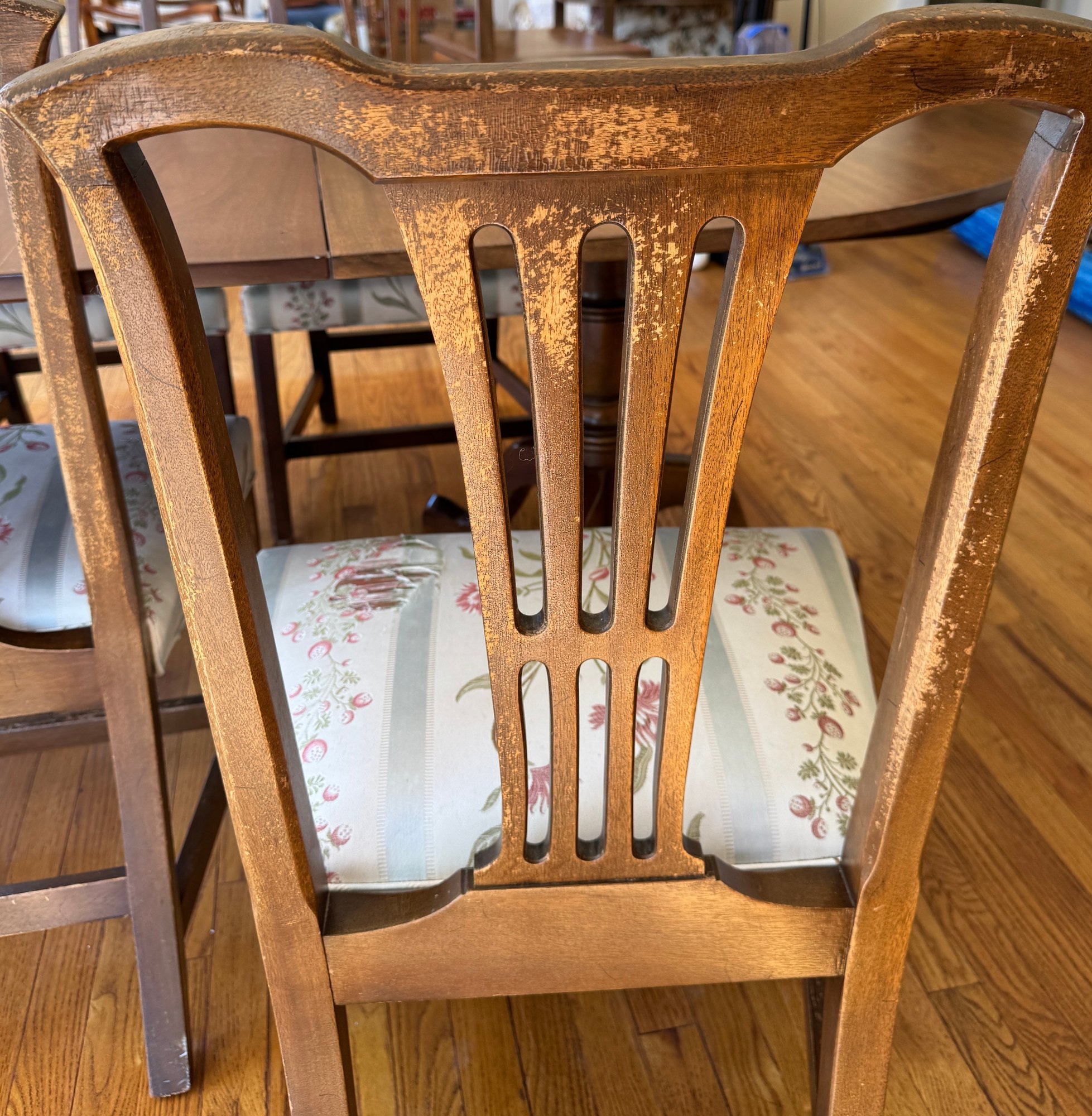 Notes: used condition, leaf discolored, all seats on chairs have holes or stains