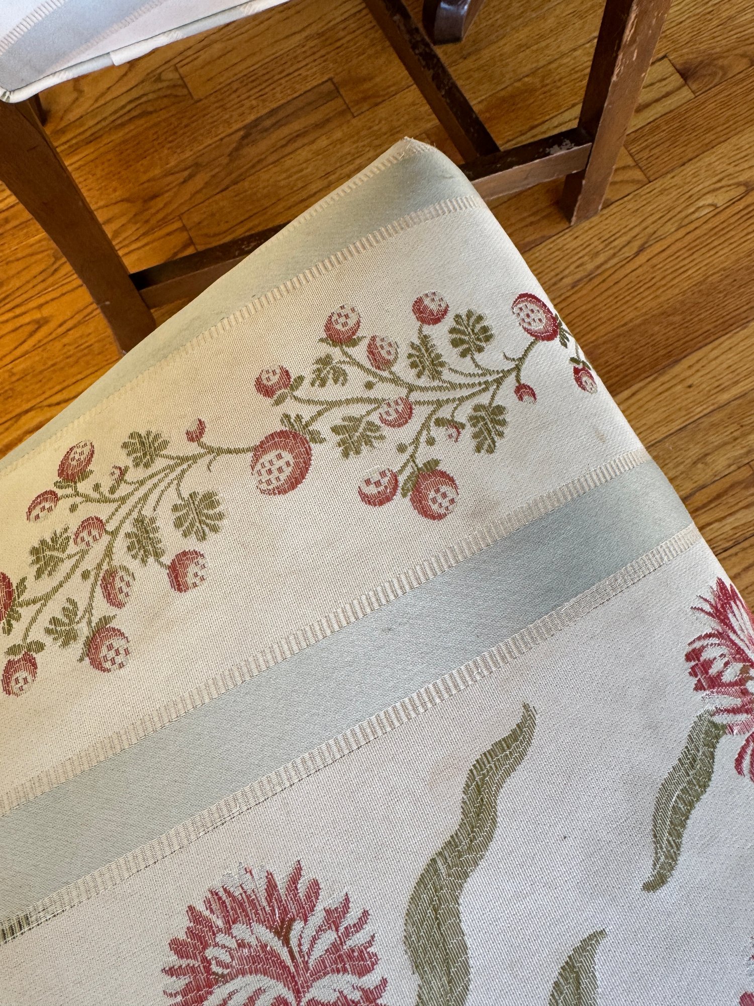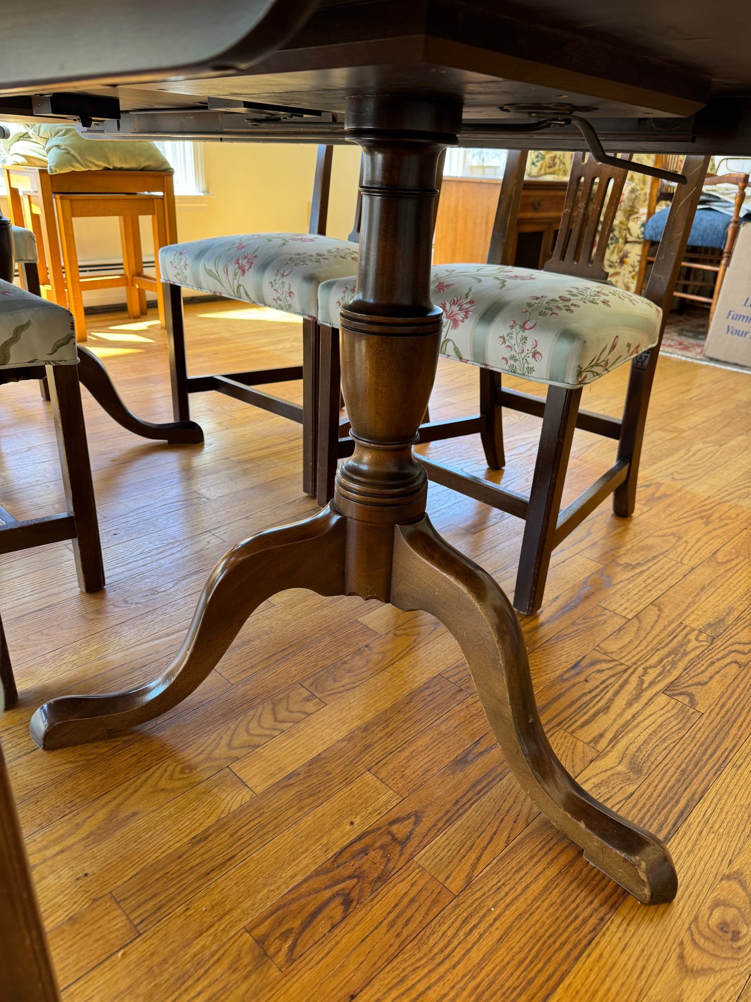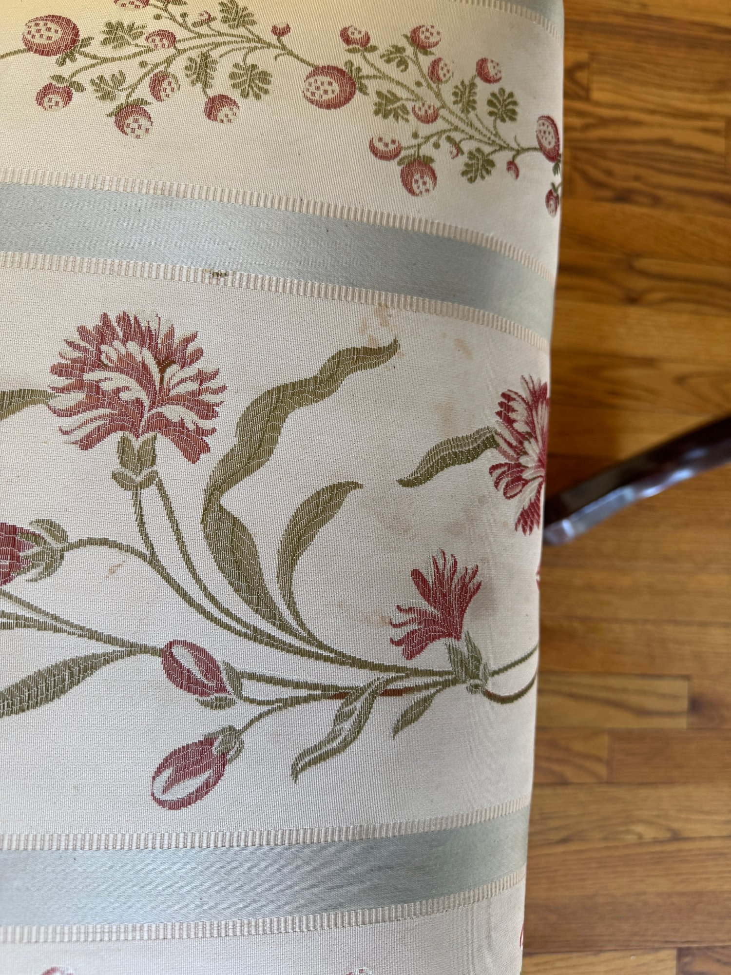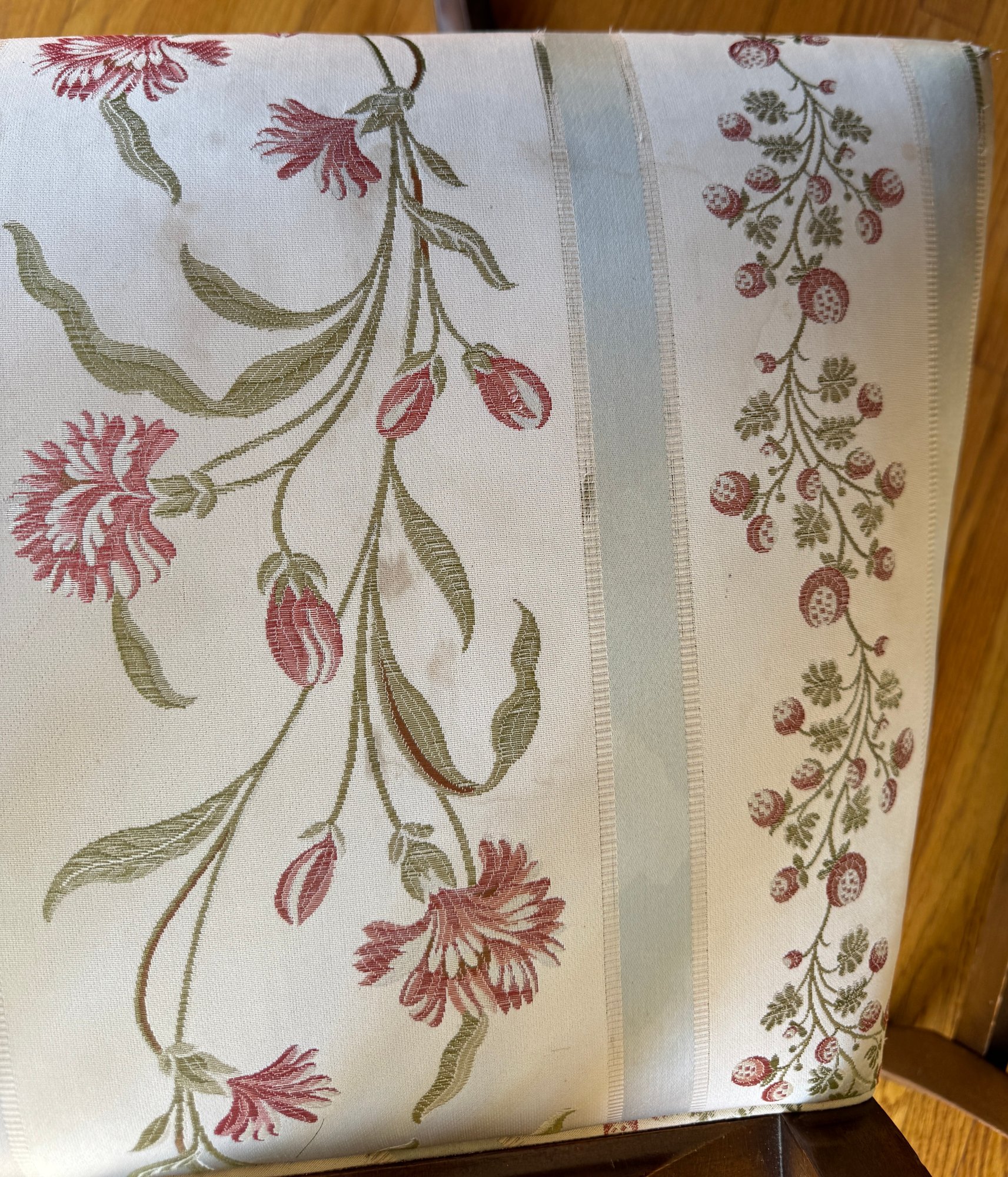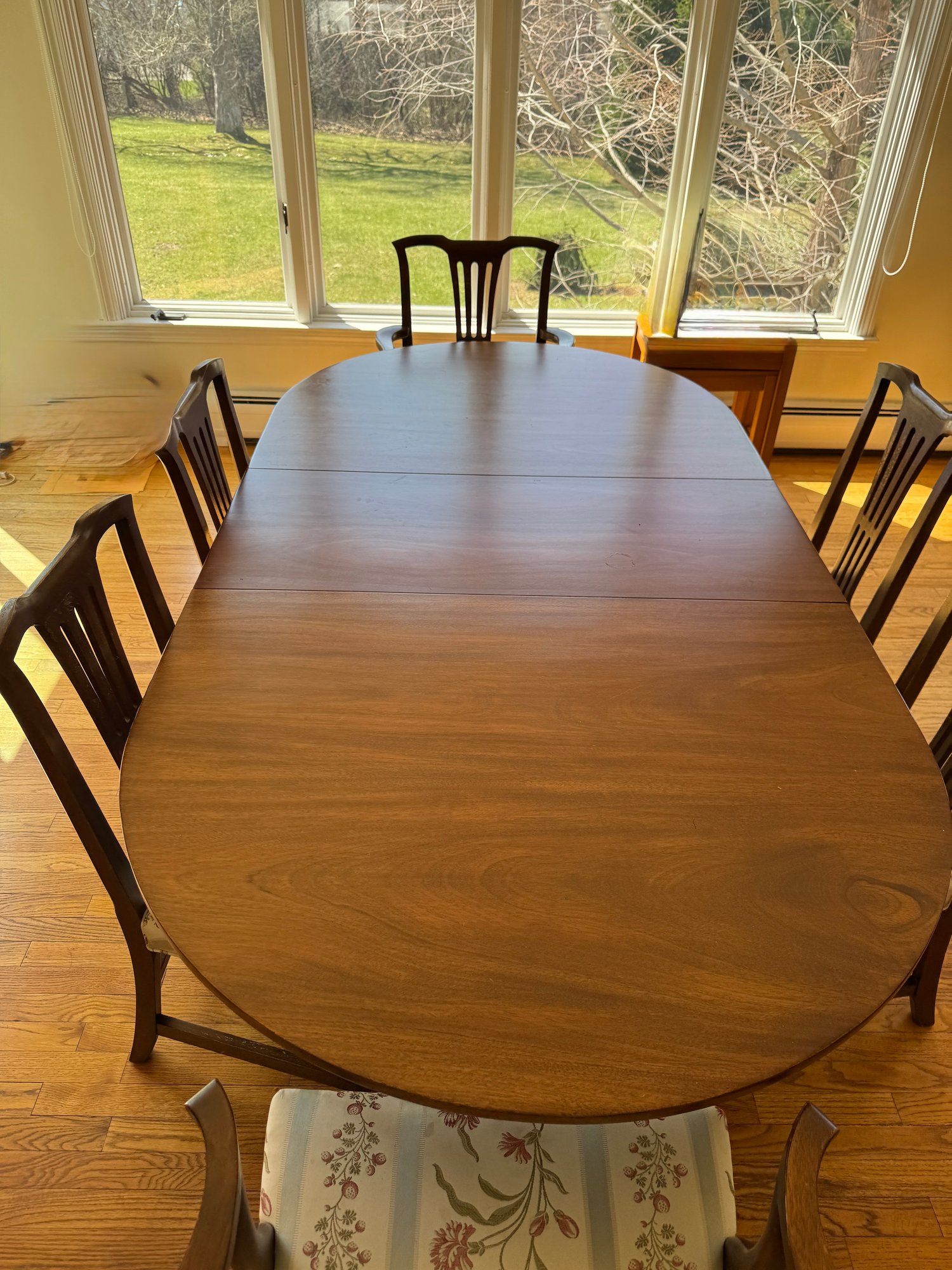 Notes: used condition, leaf discolored, all seats on chairs have holes or stains