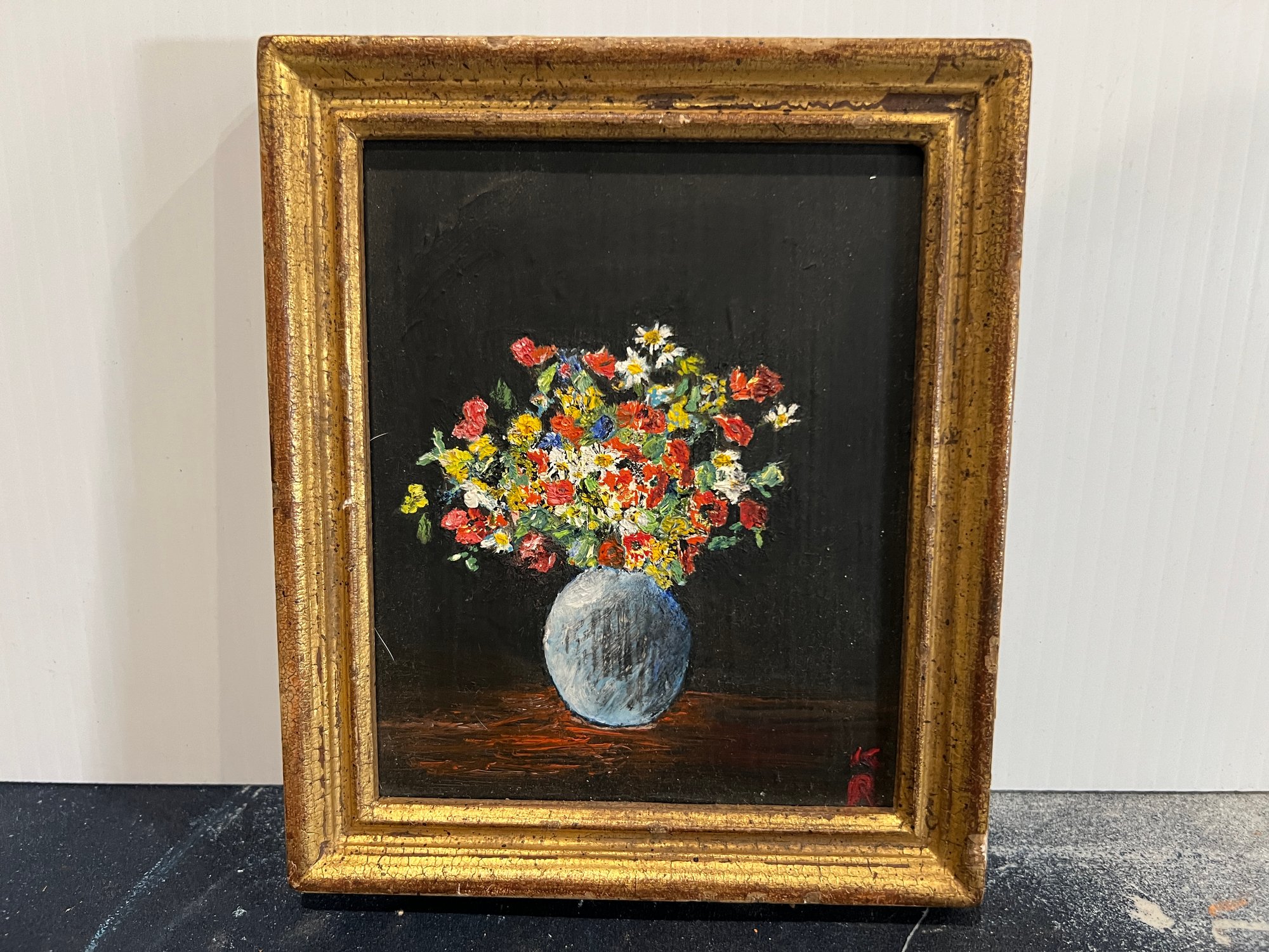 Original miniature oil painting depicting a still life of a bouquet of flowers in a vase against a black background, initialed KR in the lower right in red paint and the name Kitty Rolan is scrawled across the back.
