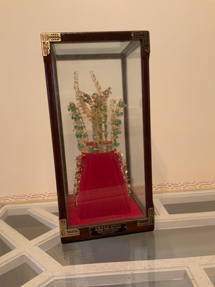 Reproduction of a royal headdress from the 5th-6th Century Silla Dynasty, a Korean National Treasure. This is in excellent condition with 24K gold plating and jade (?). Housed in a custom display case with decorative brass corners and information plate. Top glass can be removed (is currently taped in place for safety). These sell online for $150-200.