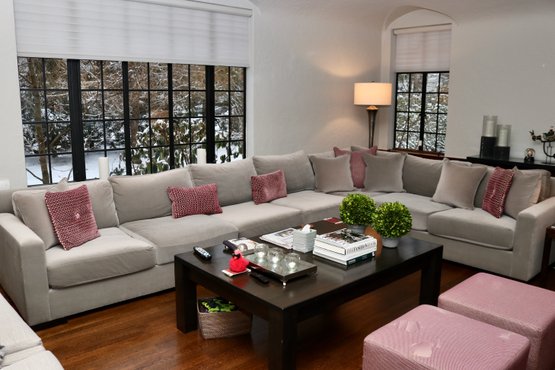 Step into a world of refined subdued luxury with this Kravet Derring Sectional, designed by Larry Laslo, a name synonymous with sophisticated interiors. This expansive sectional is enveloped in a soft, neutral-toned fabric. The deep, plush seat cushions and supportive back pillows offer a perfect balance of structure, comfort, and relaxation, making it an inviting centerpiece for any living space.
