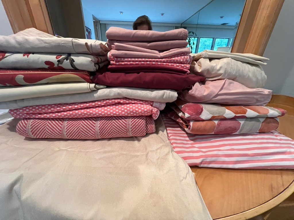 Pinks and soft reds, linens, sheets, pillow cases, stunning duvet cover, Queen size