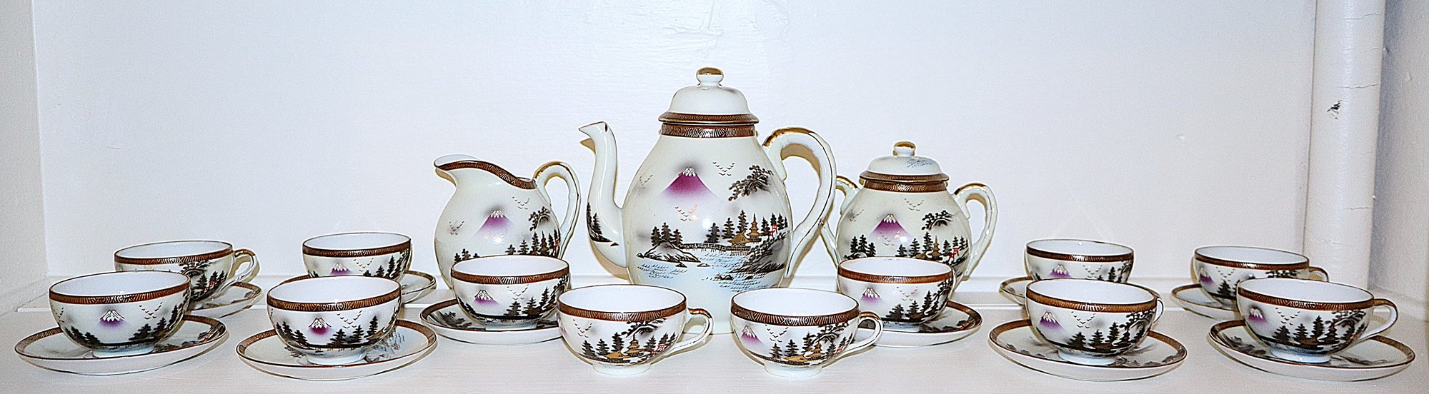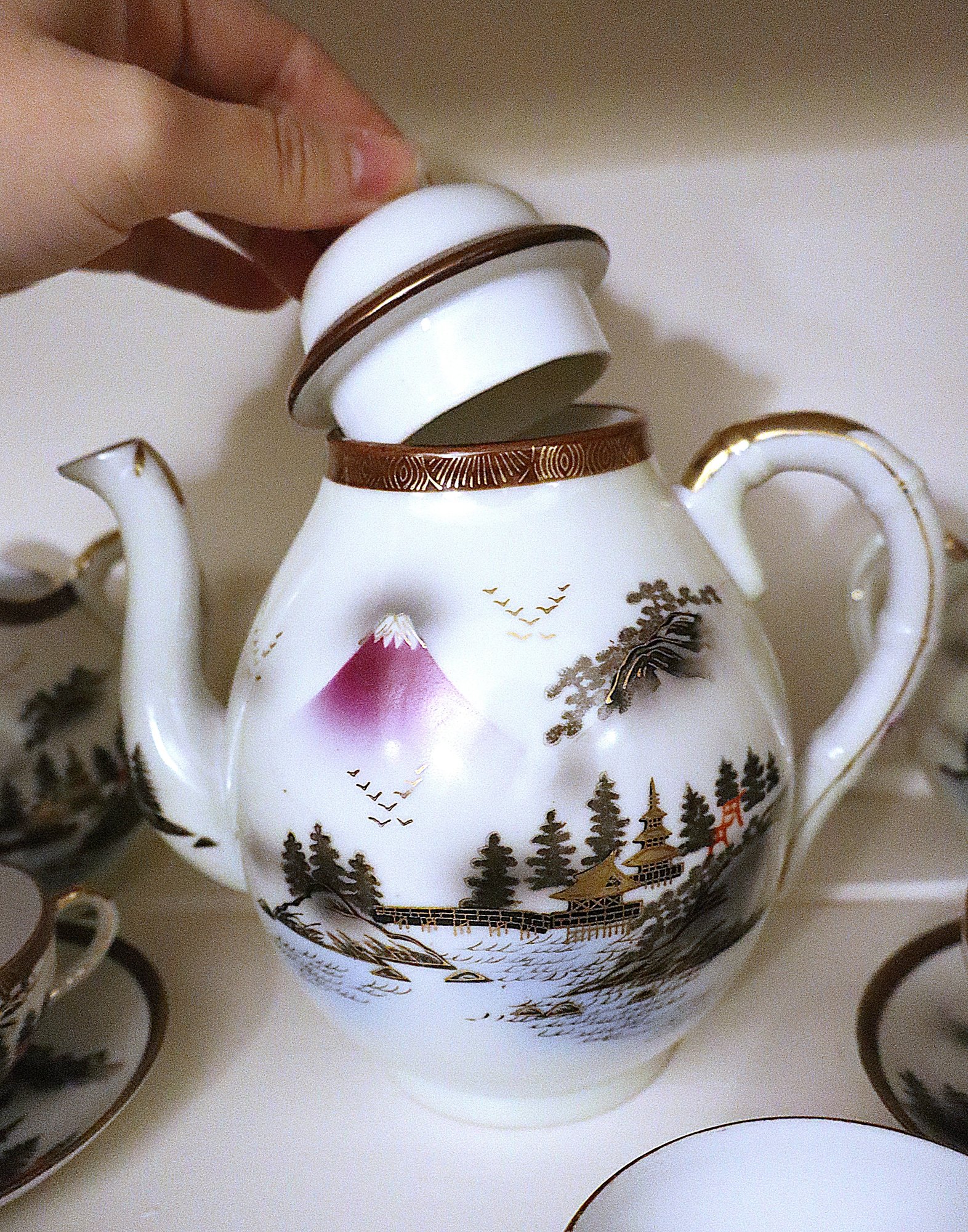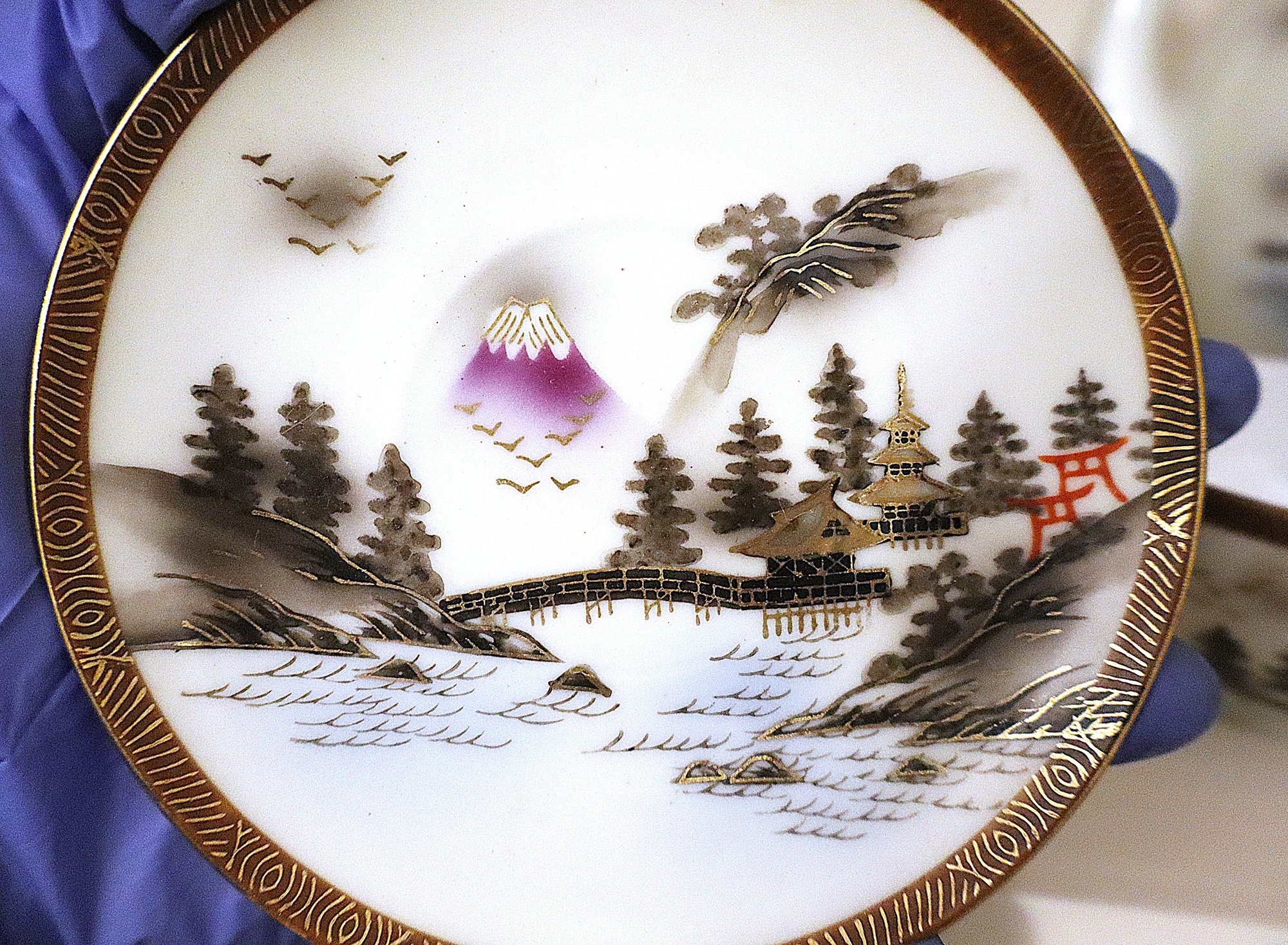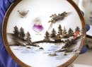 Pattern has hand painted village & bridge road with a pagoda, trees & birds flying with a scene of Mount Fuji in the background with a gold trim