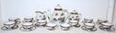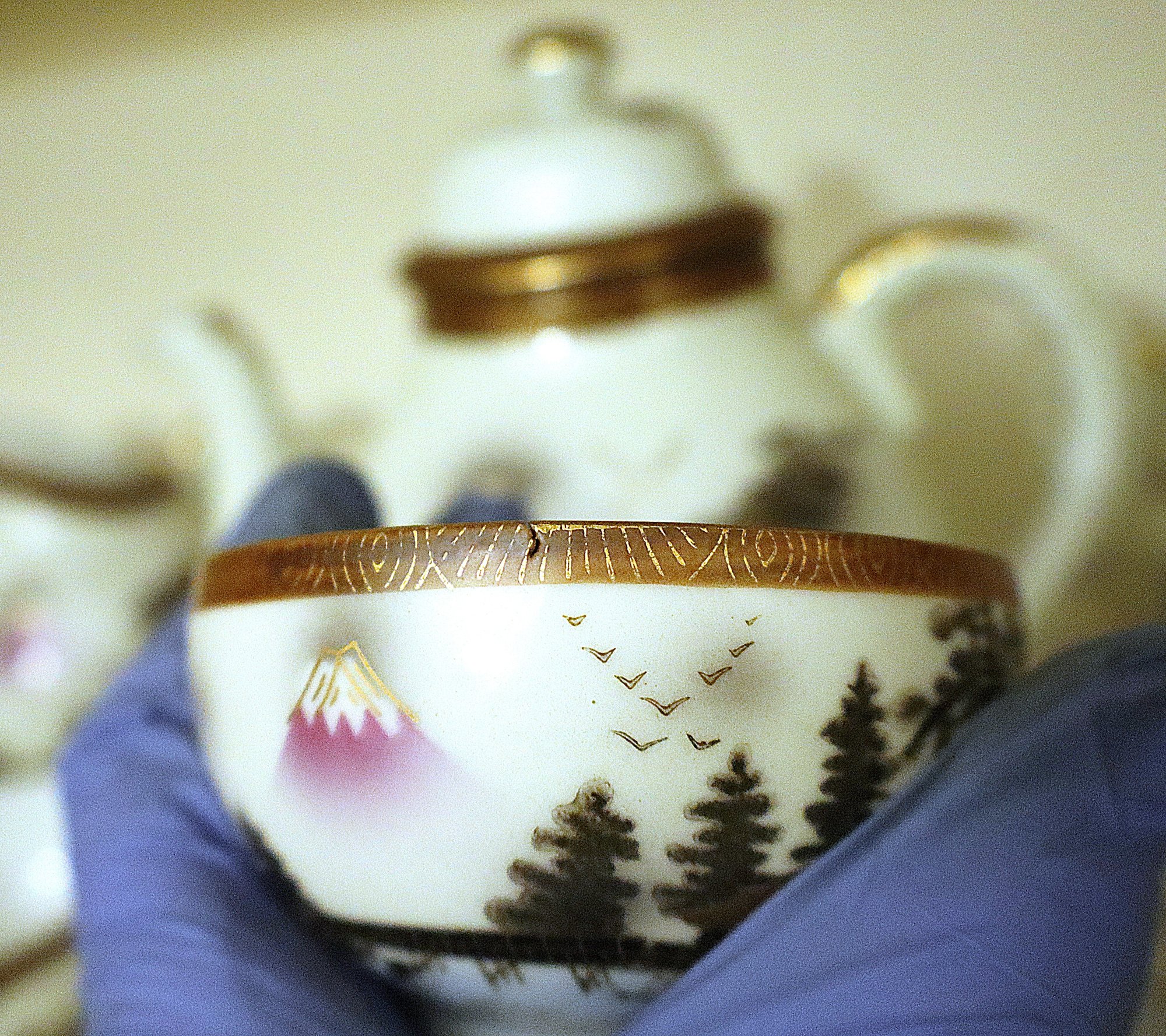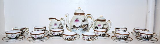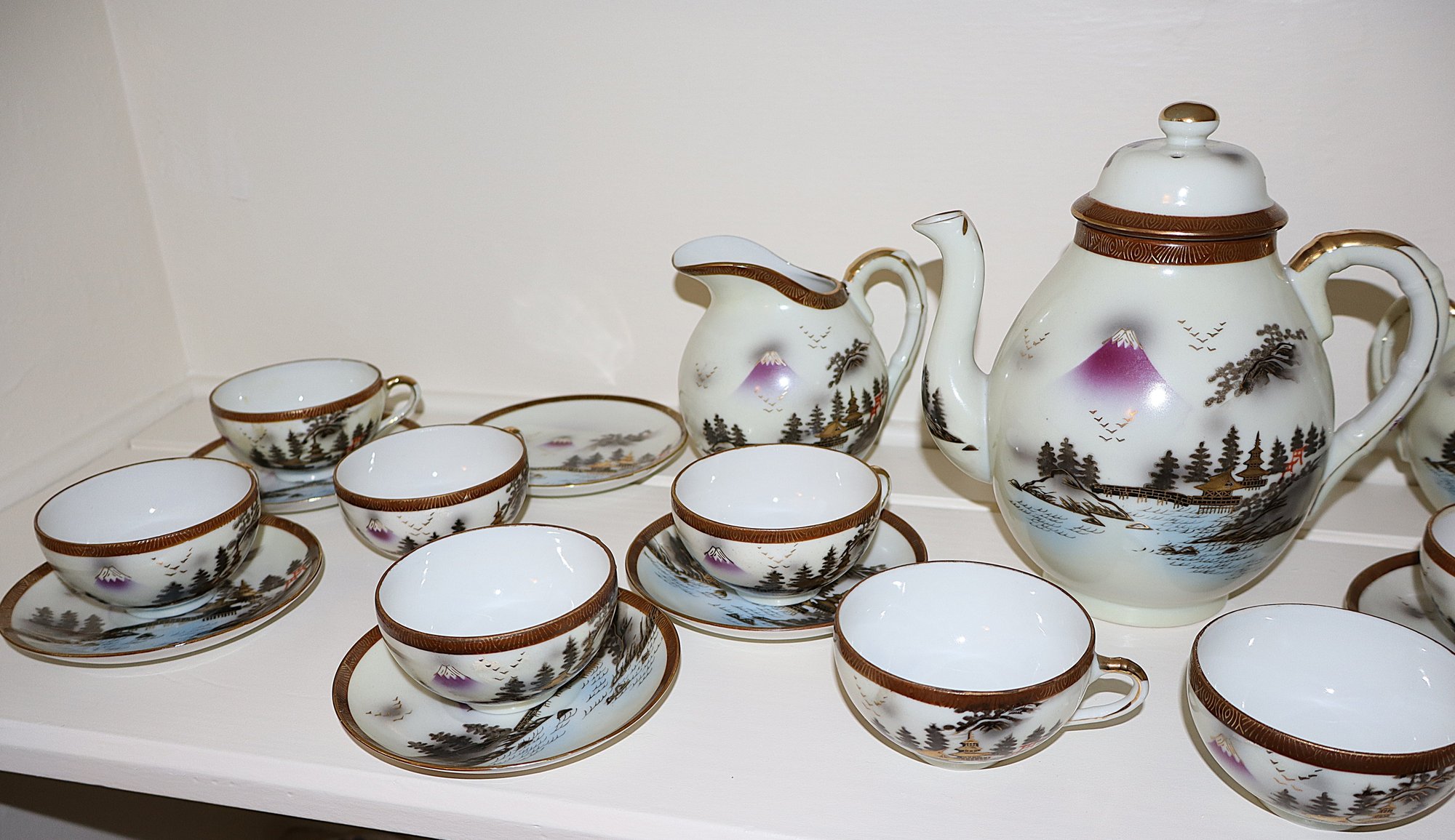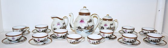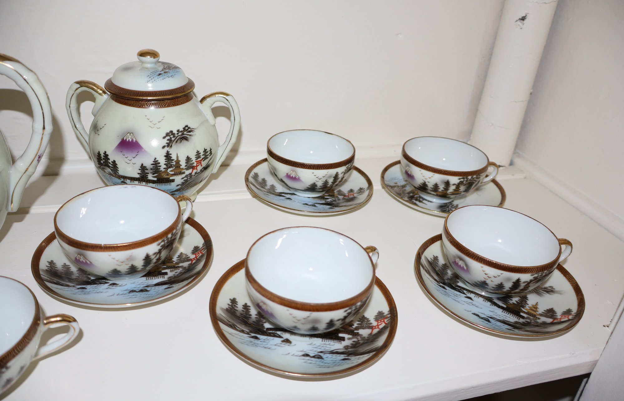 Pattern has hand painted village & bridge road with a pagoda, trees & birds flying with a scene of Mount Fuji in the background with a gold trim