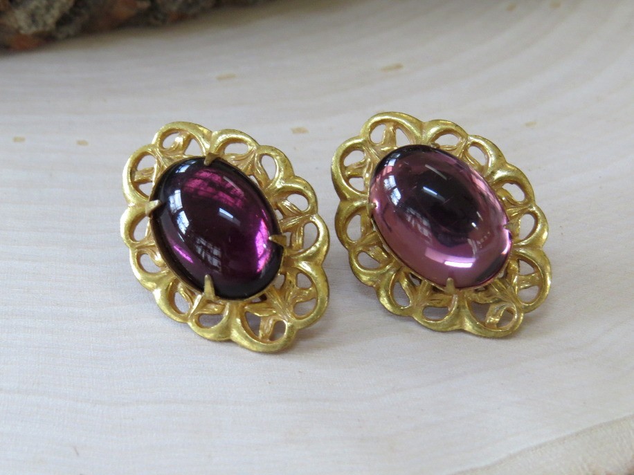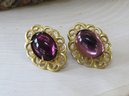 Oval purple glass centers are encircled by a gold-tone lacy edge border. Glass stone is prong set and earrings measure 1 1/4" long X 7/8" wide. Color varies slightly between the two earrings.