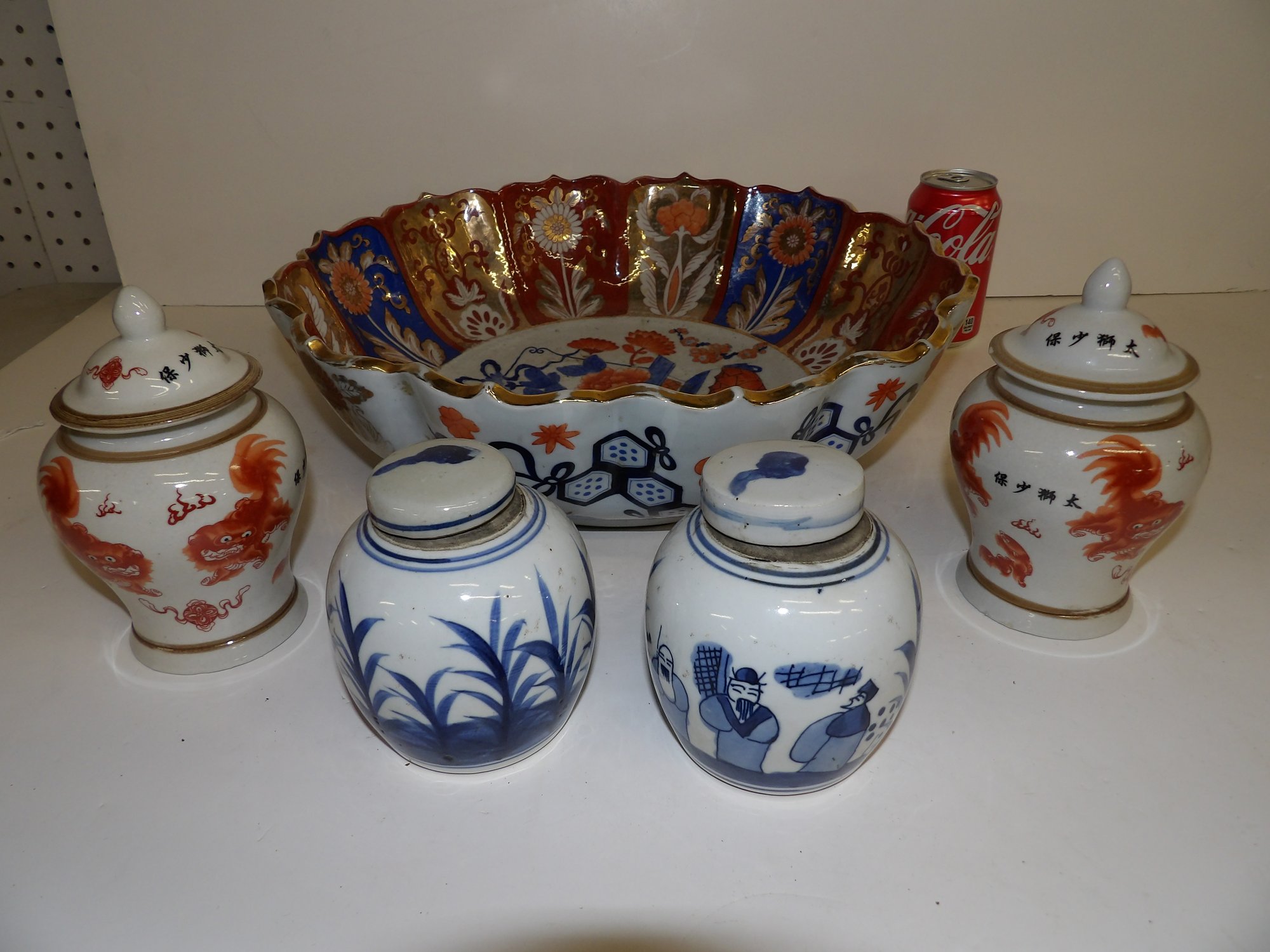 Large 15" Imari Bowl And Two Newer Pairs Chinese Porcelain Jars