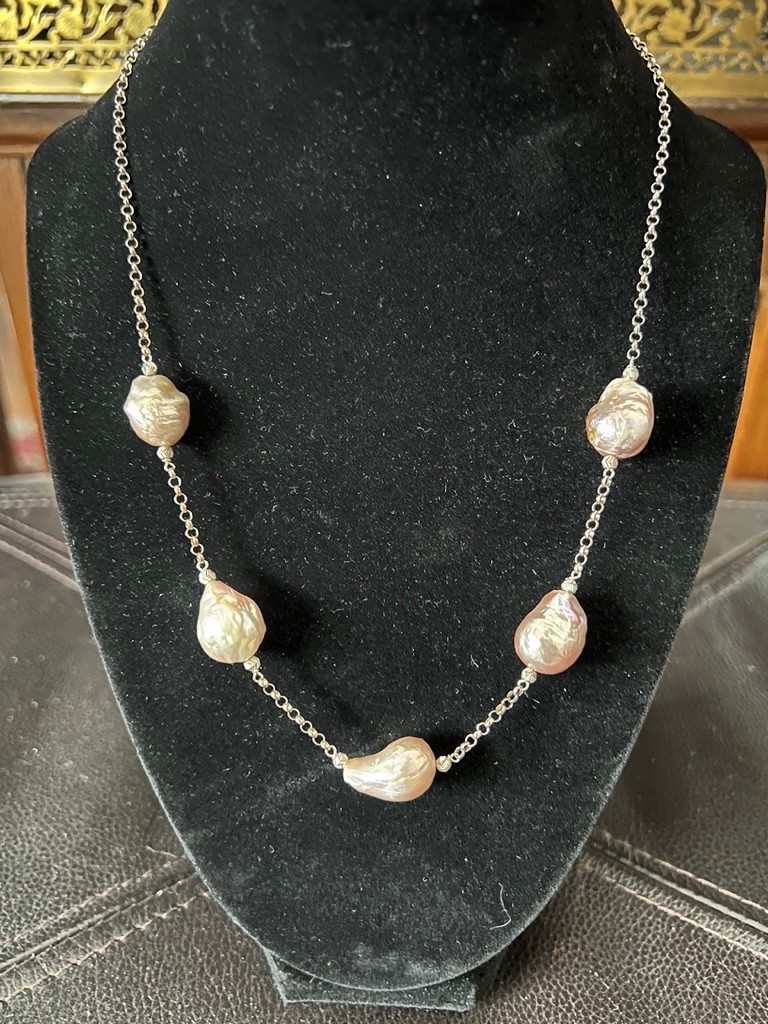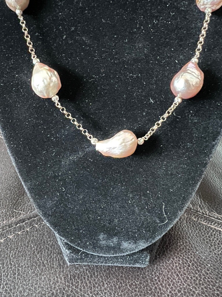 LARGE freshwater baroque pearls, set on a Sterling Silver adjustable length chain, hangs beautifully, rolls wonderfully on your neck, is elegant and in the pink hues. A lovely set, on a rolo chain, perfect in many ways.