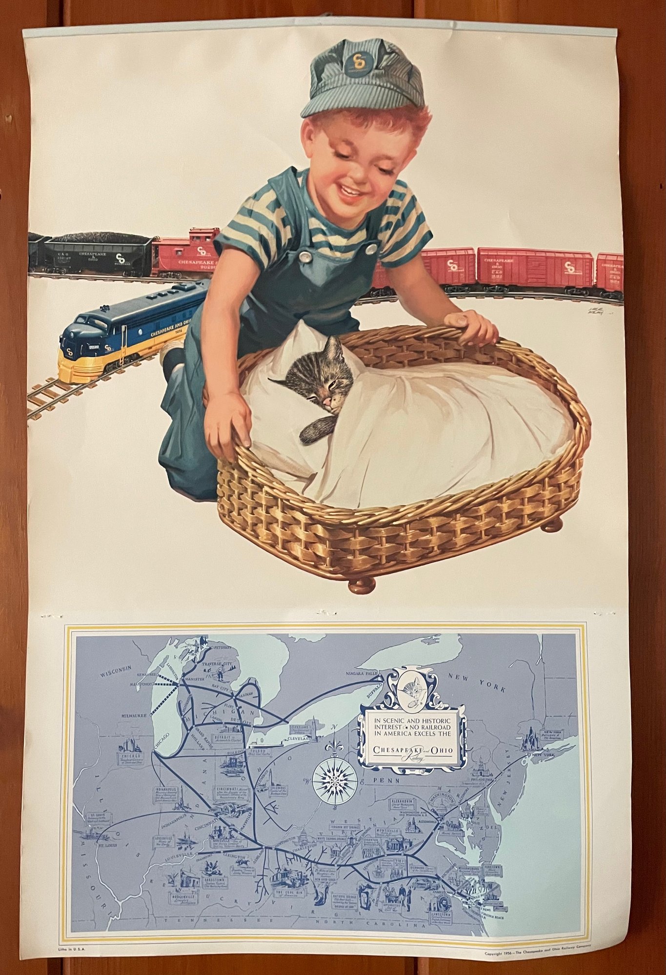 So charming - this Chesapeake & Ohio Railroad Calendar for 1957. The page with the boy and the map were originally on top of the calendar. But it's all very well preserved. They are lithograph prints by an artist named Jack Kerry. It's 23" high and in good condition, but only December of 1957 remains.