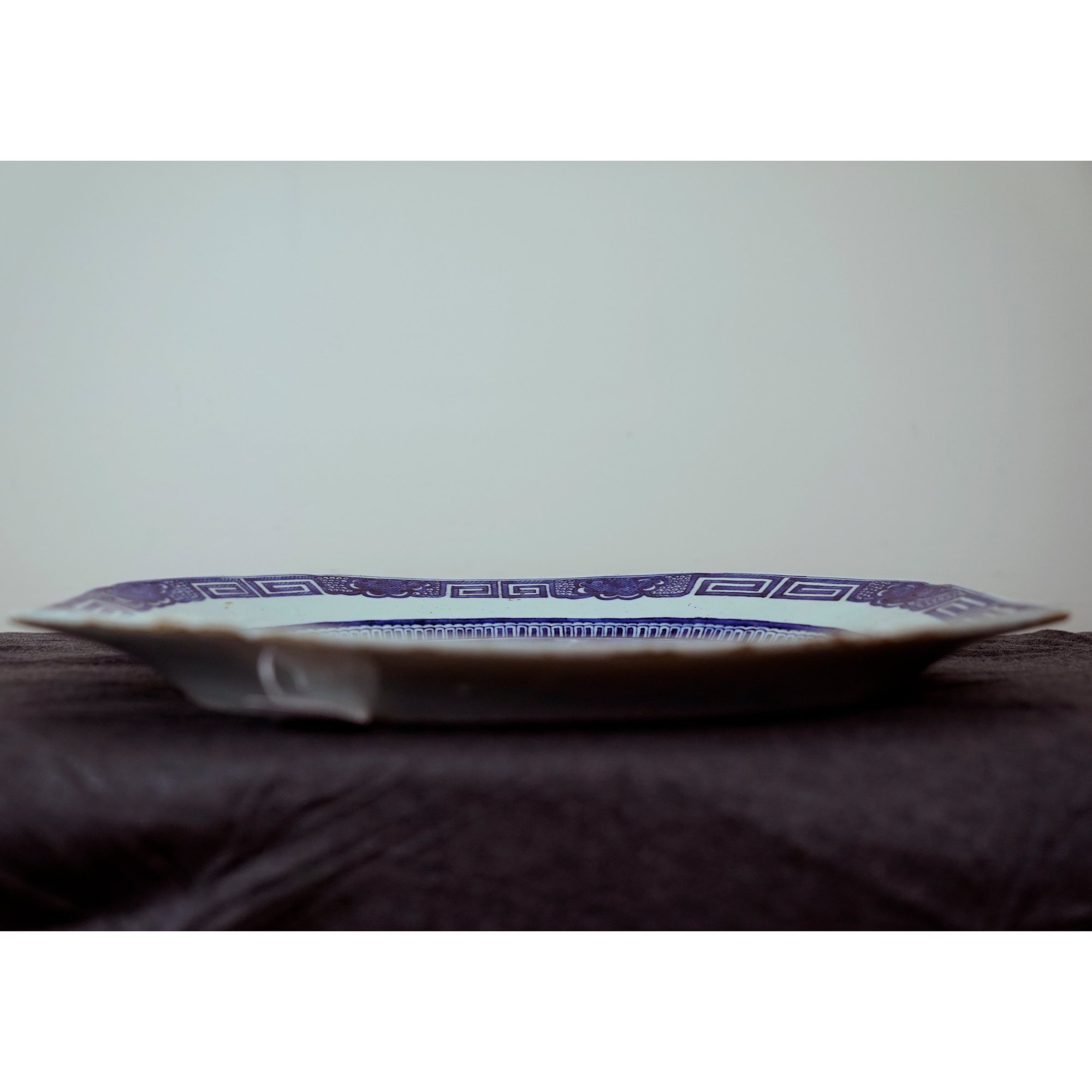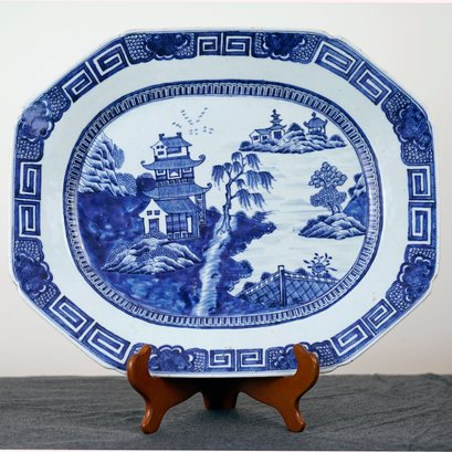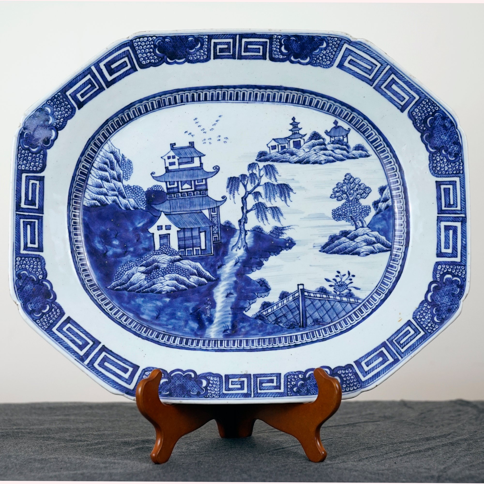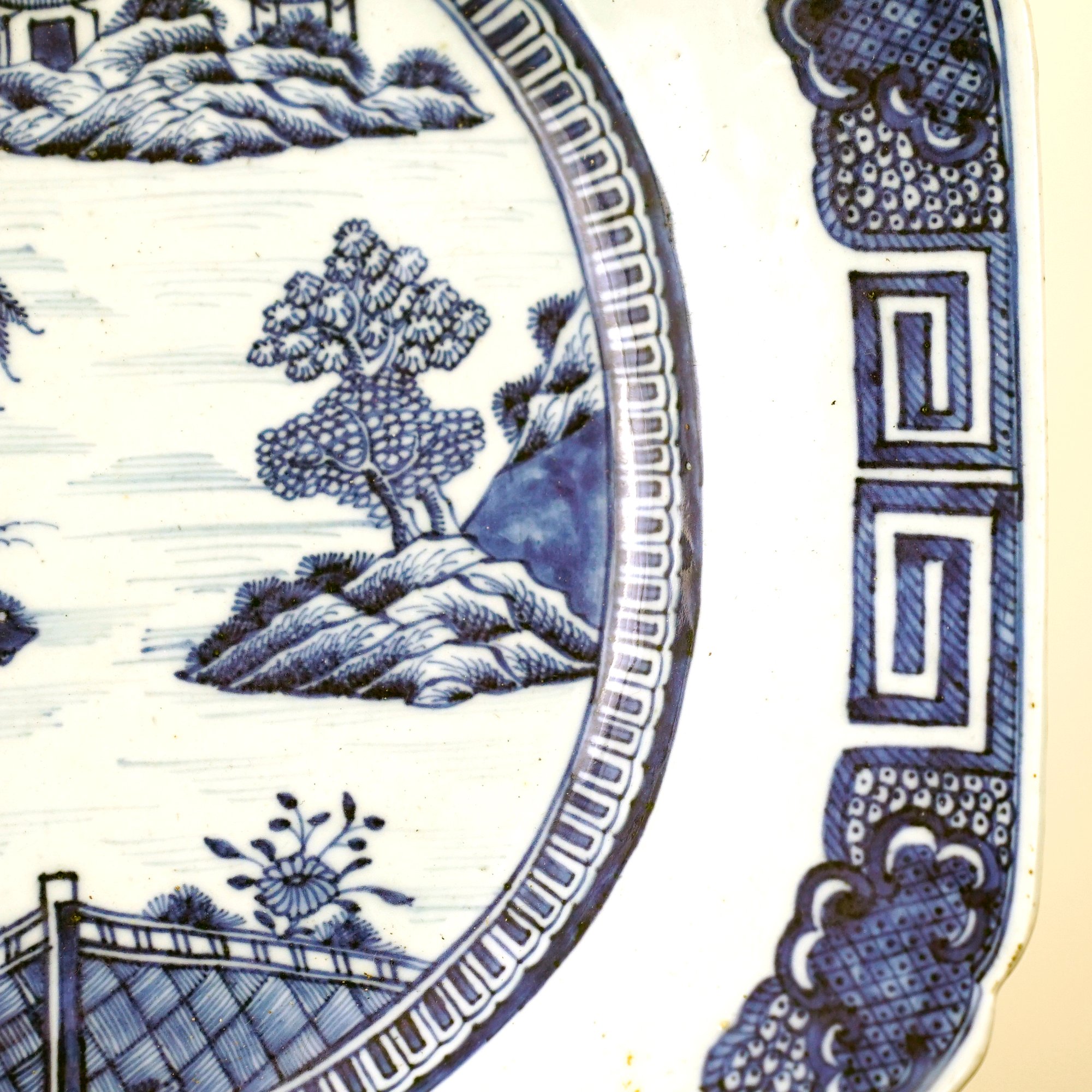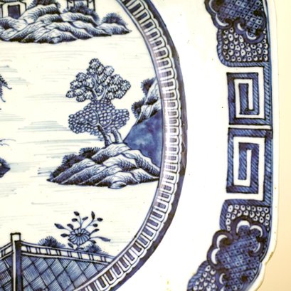 19th century, depicting a pagoda seaside landscape, the border with Greek key and diapered decoration.