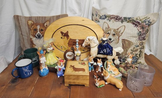 Large dog themed lot featuring Corgi's. So many different things are in this lot including pillows, a trinket box, & figurines. The size large t-shirt was found after the group photo & is included in the lot.