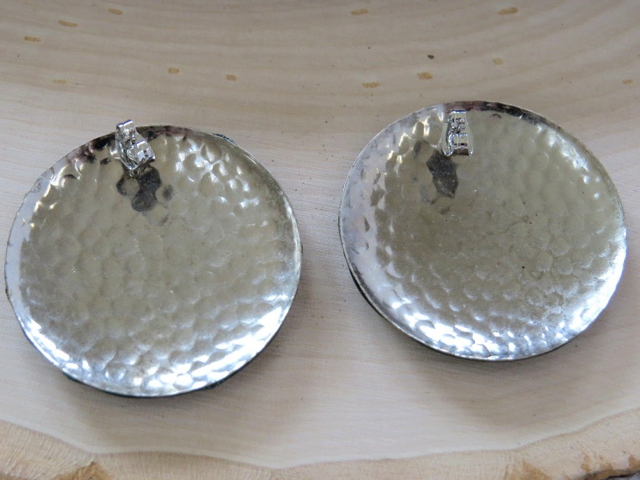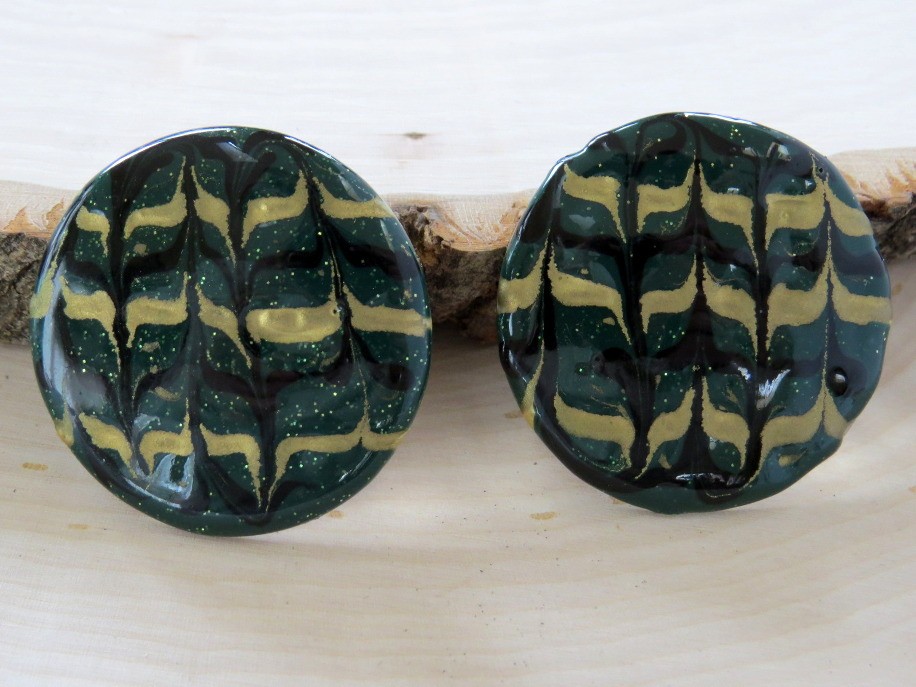 Unique enamel design large disc stud earrings in rich colors of gold, black and dark green. Earrings measure 1 1/2" in diameter and have hammered backs.