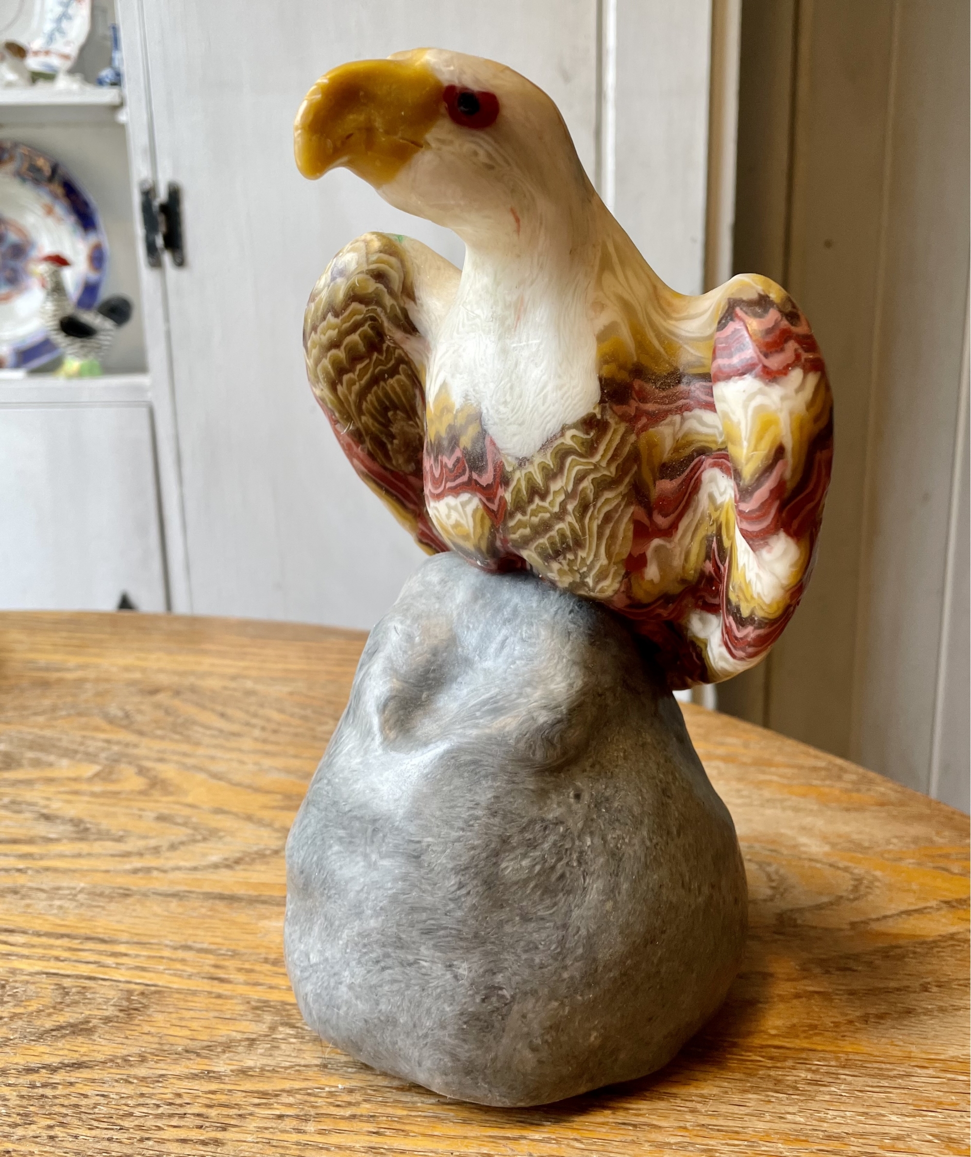This is a 8 3/4' tall candle in the form of a colorful eagle sitting on a rock. It was handmade in China and sold in Los Angeles. It's in good condition and the dimensions are 8 3/4" tall by 5 1/2" at the widest point.