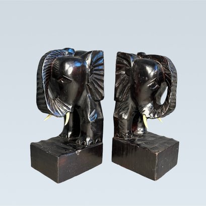 Large Elephant Book Ends that are made of wood and have a pretty shiny finish to them. The tusks appear to be made of bone or perhaps resin. Note some areas with some scuffs but overall these are really pretty and sturdy and make a nice statement.
