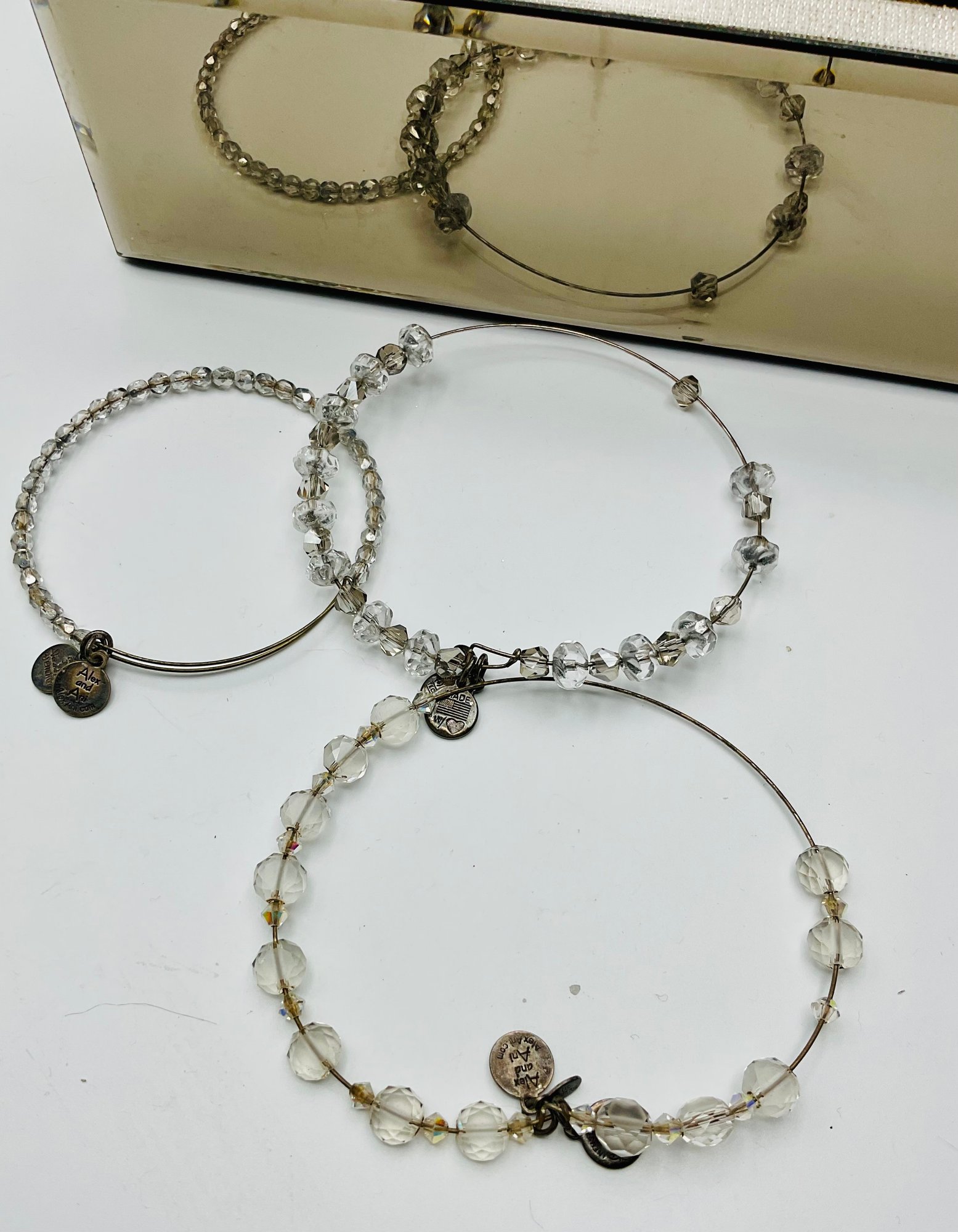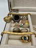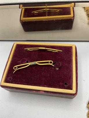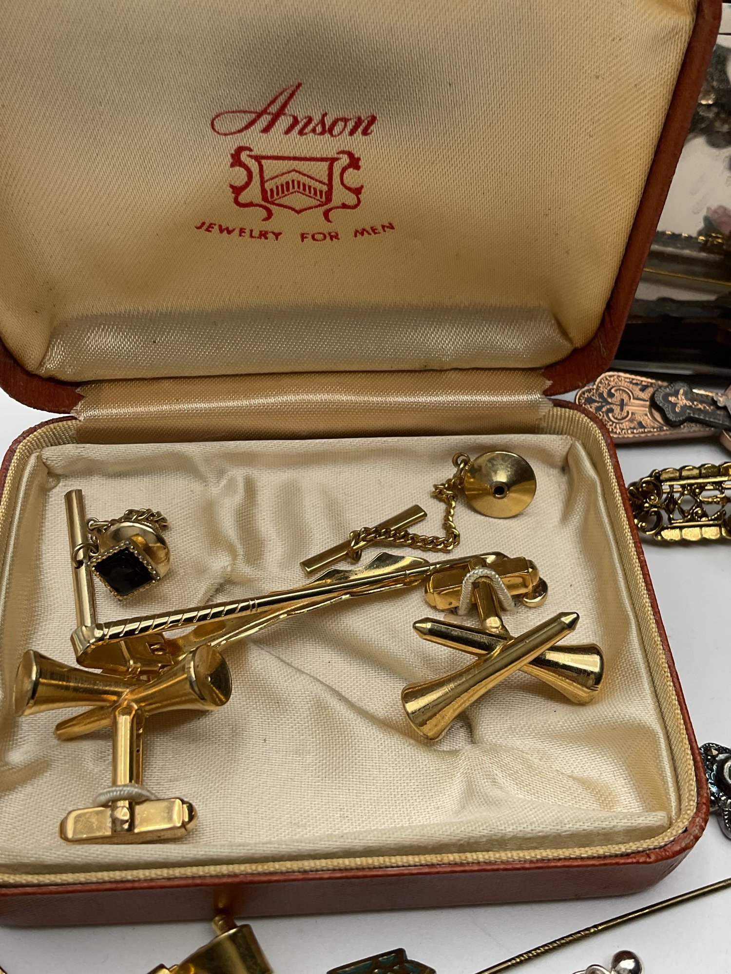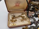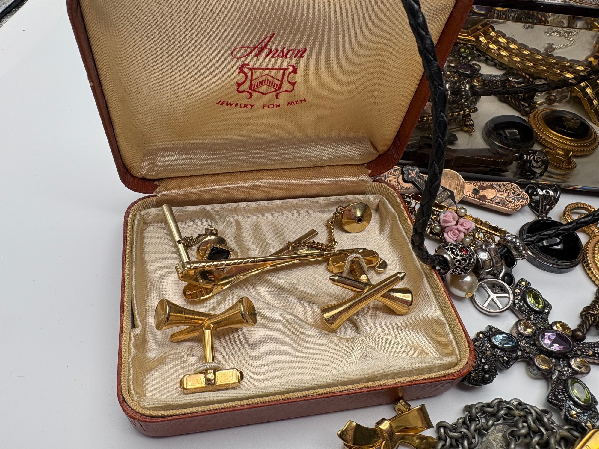 Designer & Branded Items: Includes several Alex and Ani wire bangles with faceted crystal beads and a vintage Anson "Jewelry for Men" boxed set containing golf-themed tie bars and cufflinks.