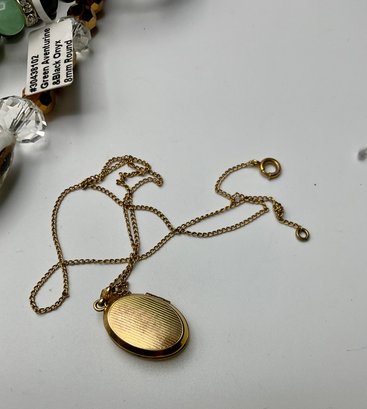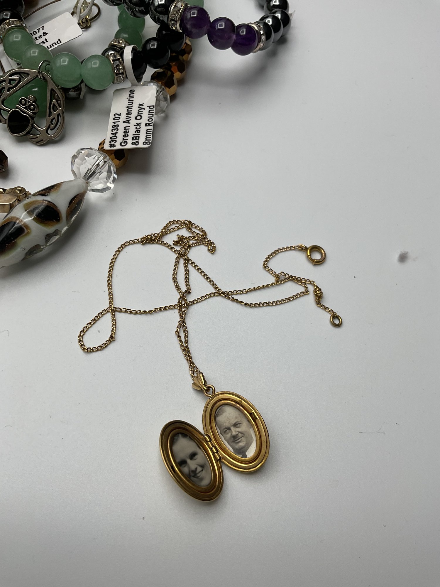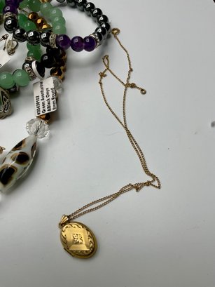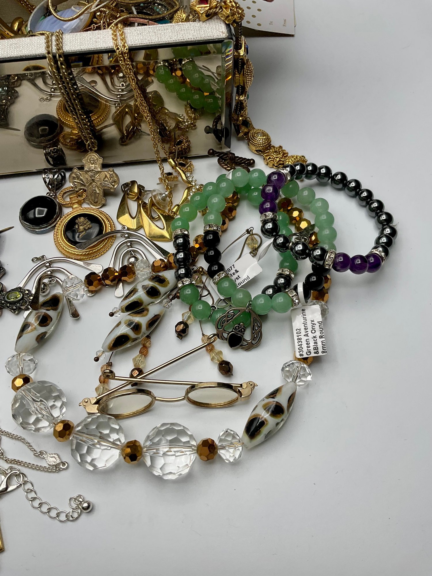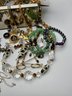 Beaded & Fashion Jewelry: A wide array of beaded necklaces and bracelets in jade green, amber, and iridescent tones, plus various gold-toned hoops, bangles, and cocktail rings.