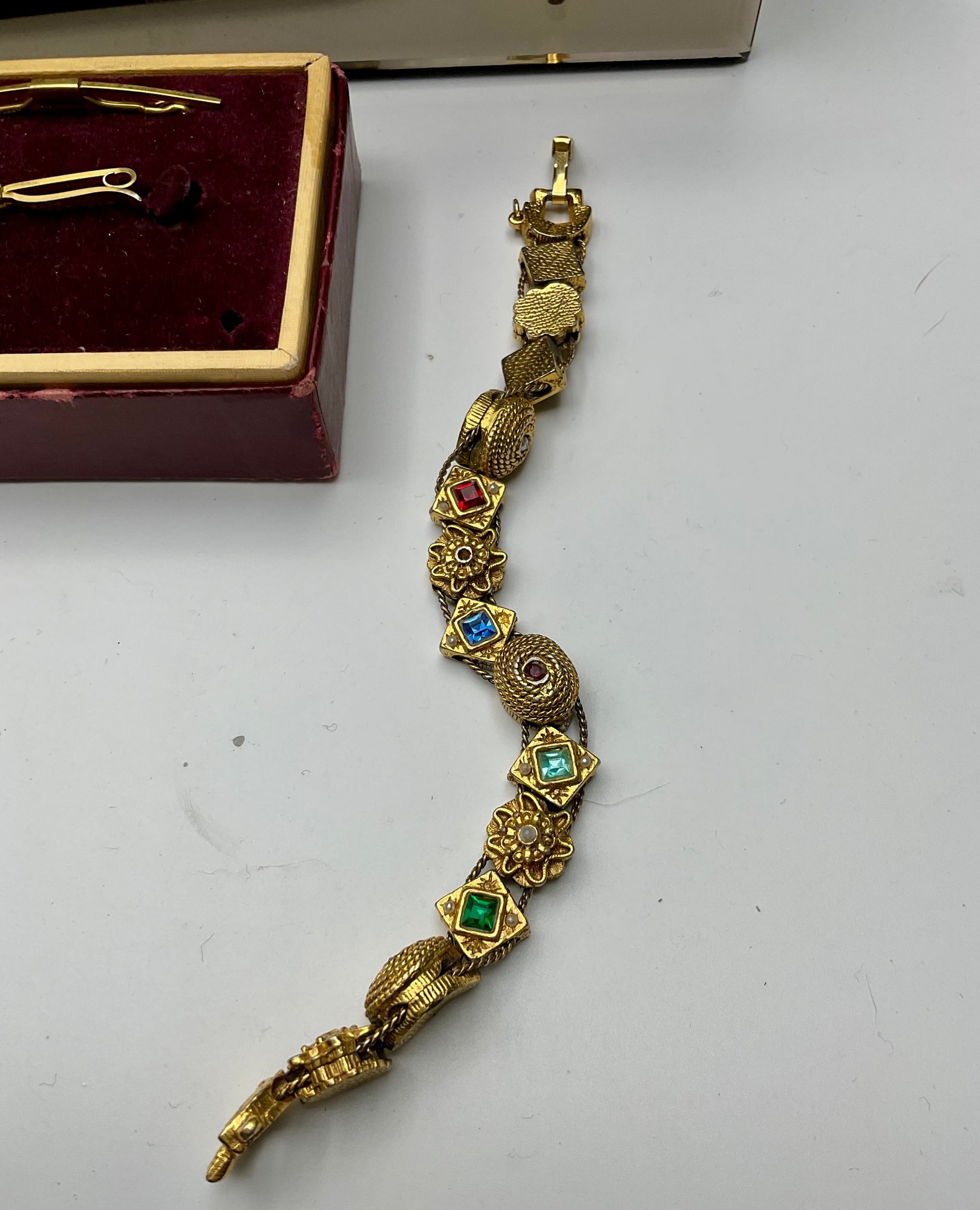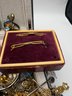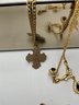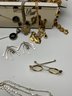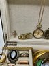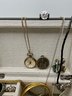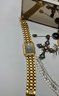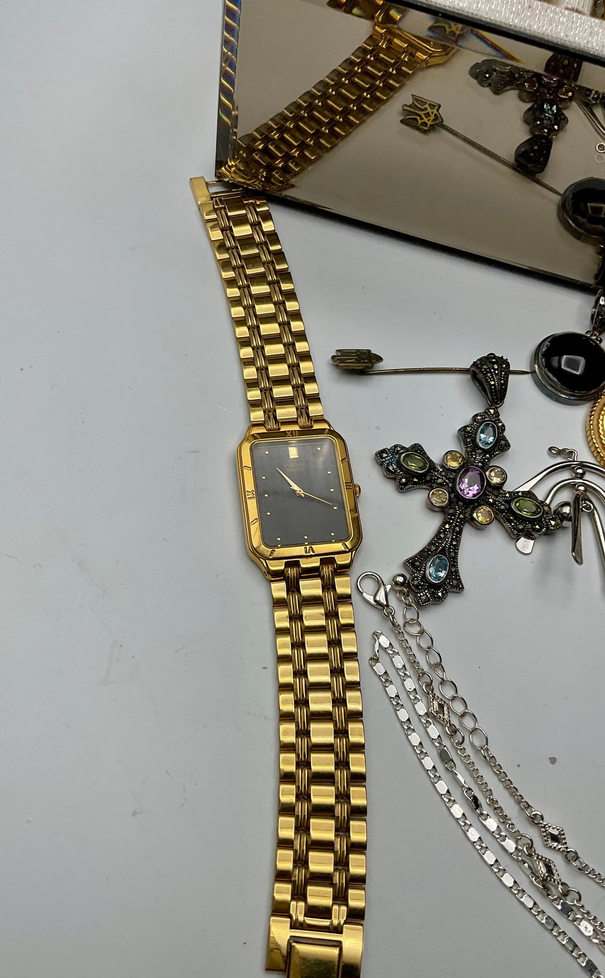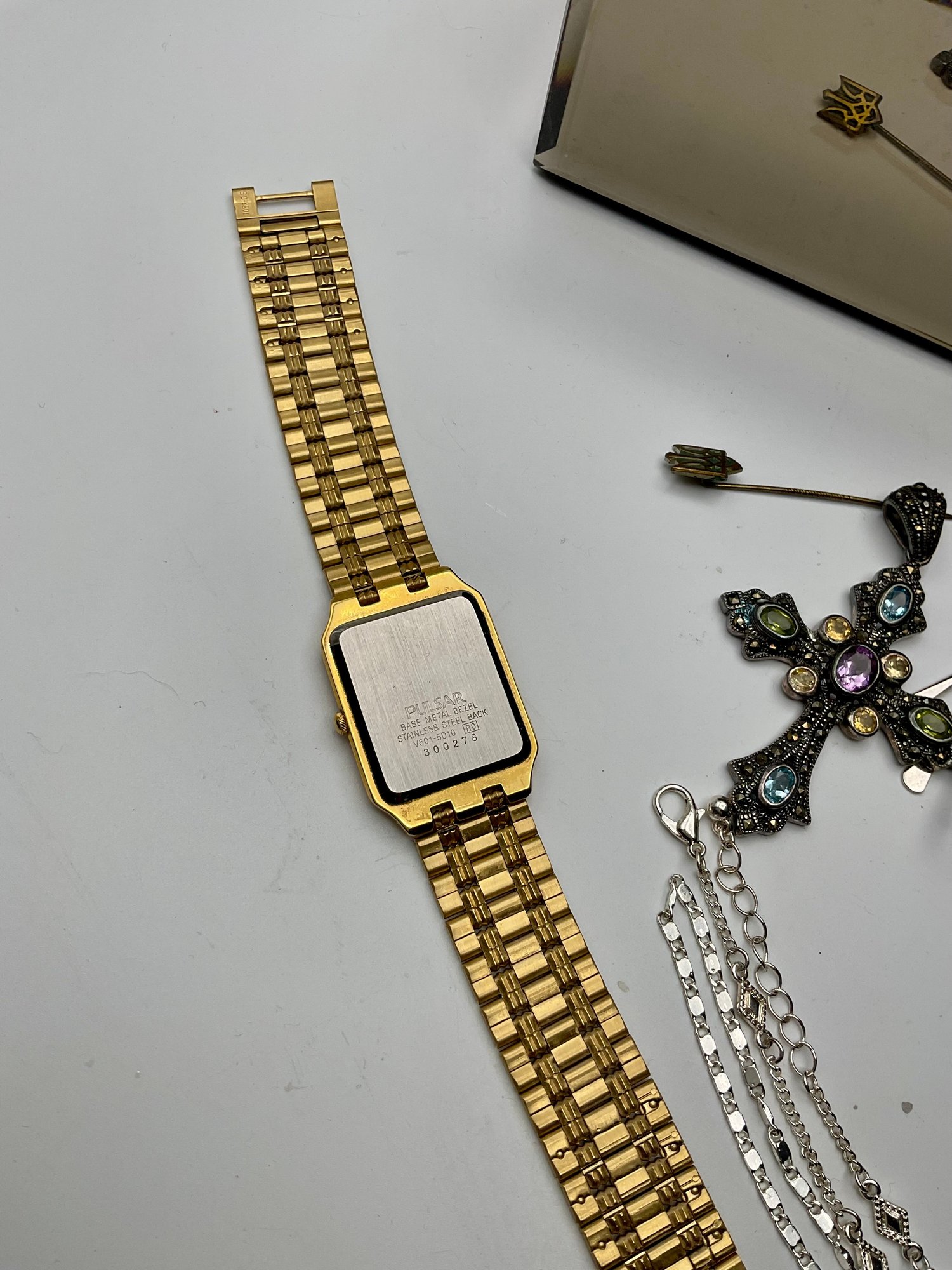 Watches & Timepieces: Features a gold-toned Pulsar Quartz rectangular dress watch with a black face, several vintage pocket-style pendants, and a unique miniature gold-toned eyeglasses accessory.