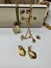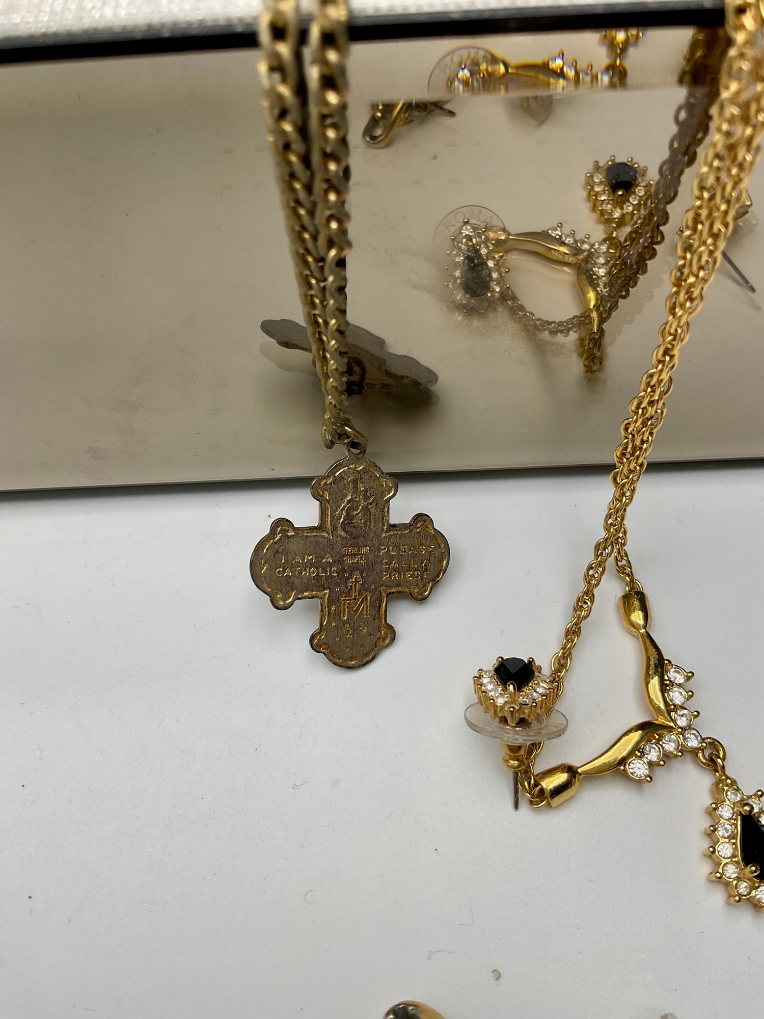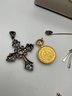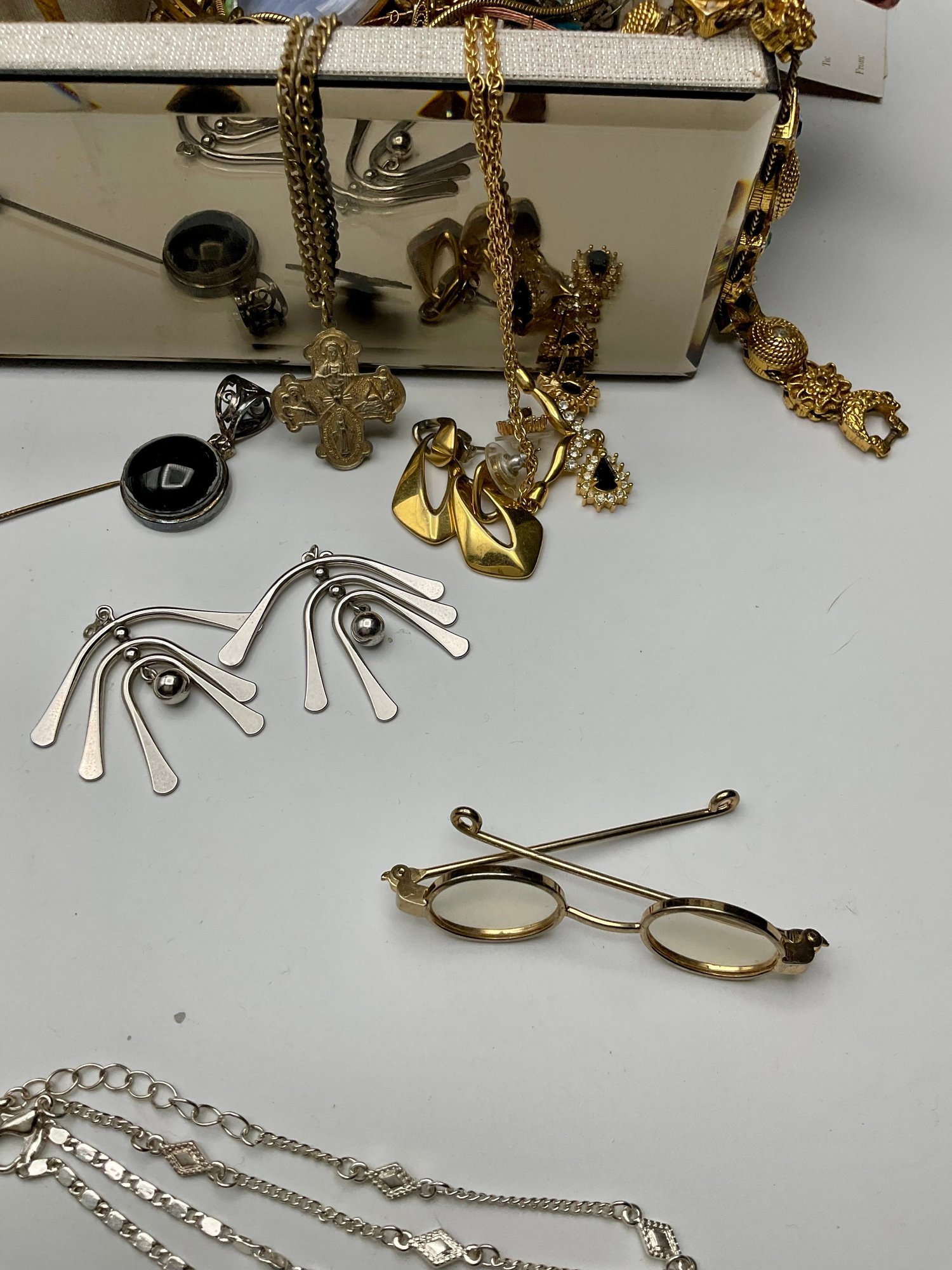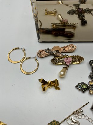 Unique Statement Pieces: Mid-century modern style silver-tone "drip" earrings, Victorian-style rose and pearl bar brooches, and various religious medallions and crosses.