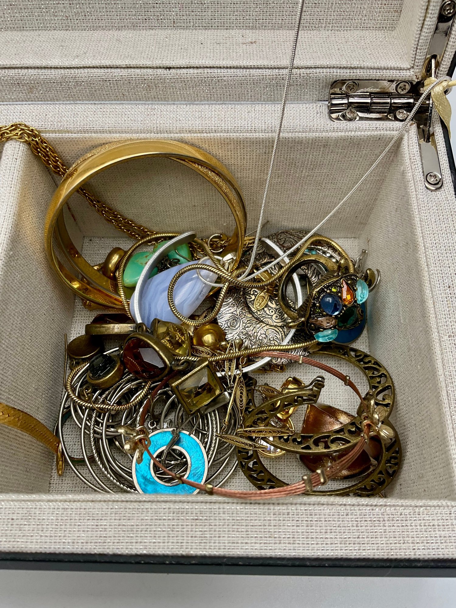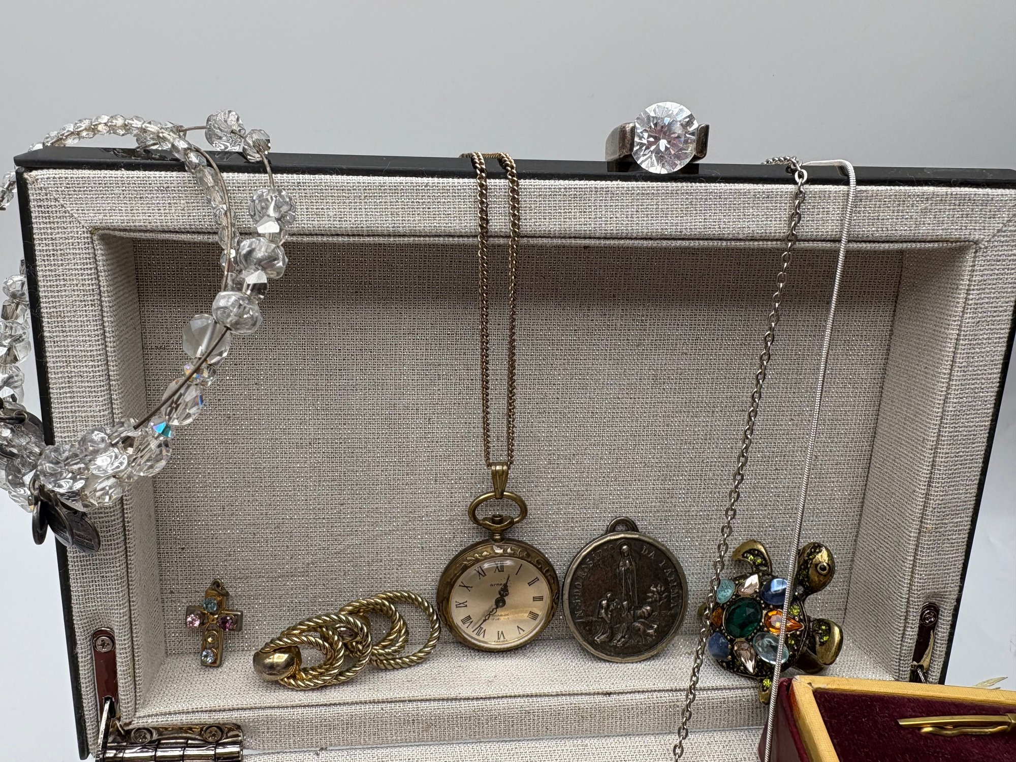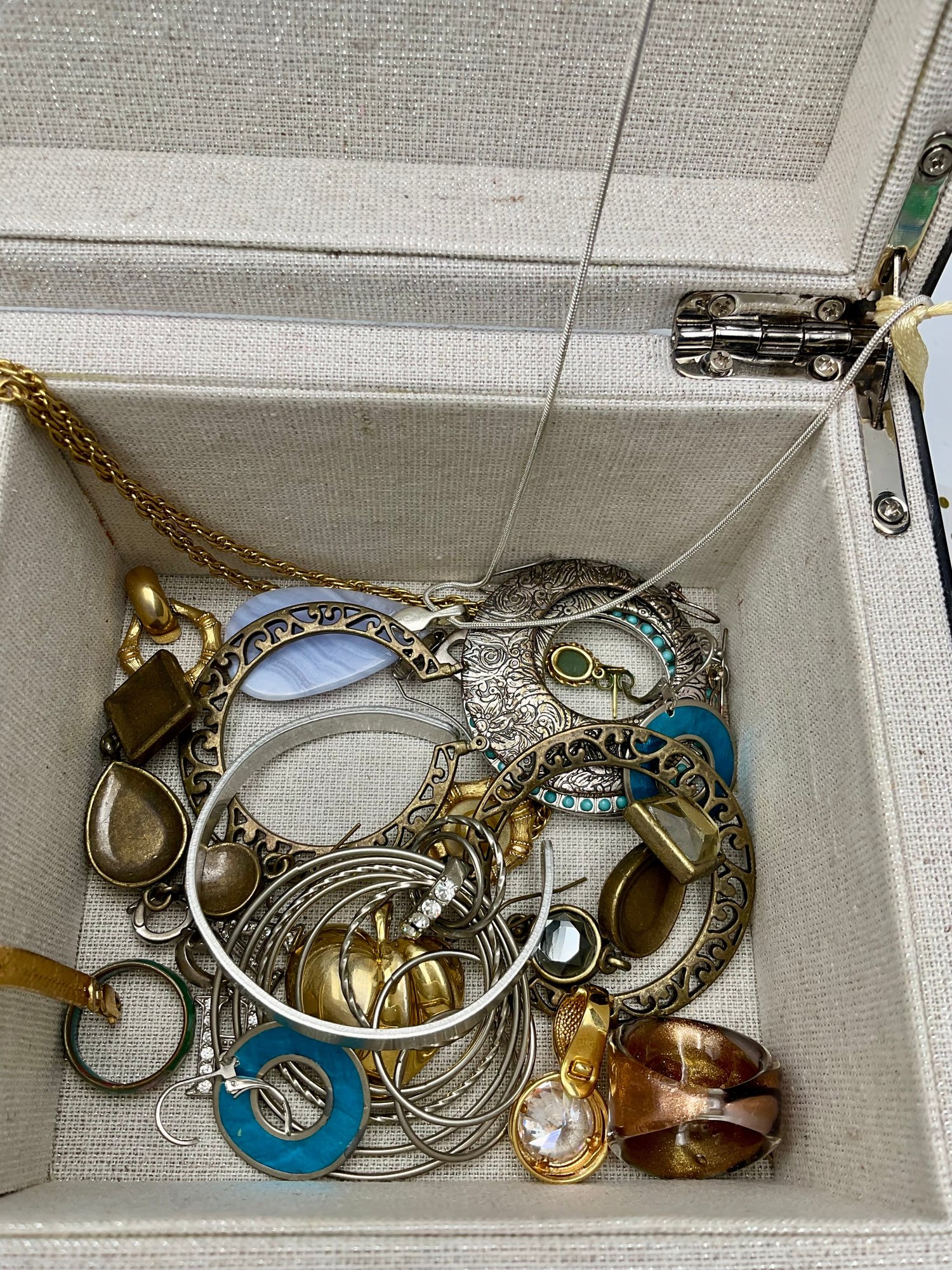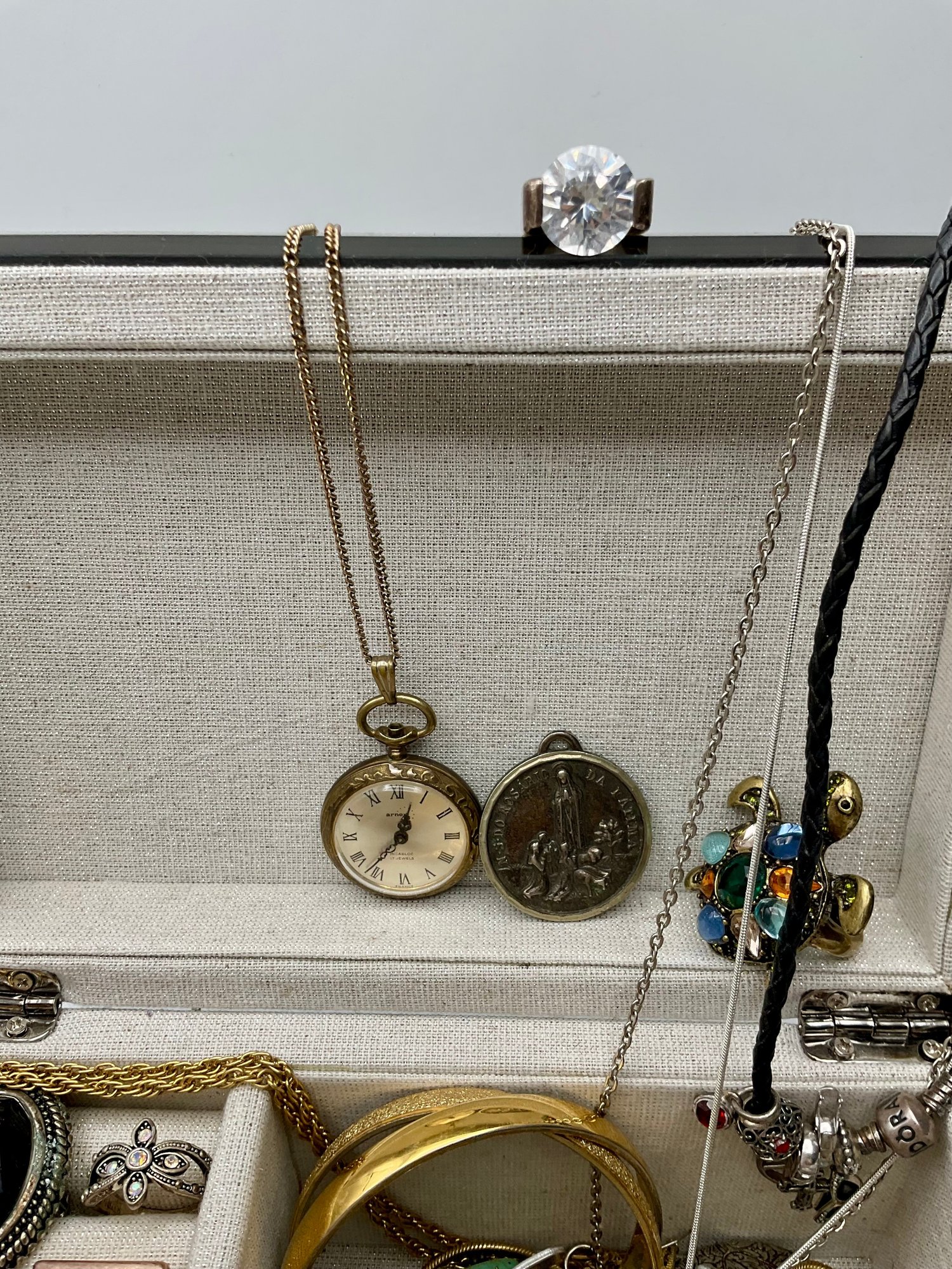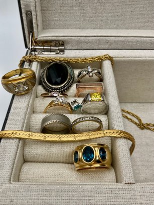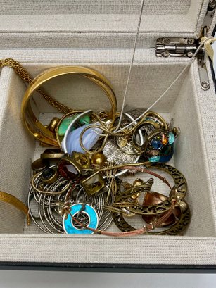 Explore a vast and eclectic assortment of jewelry housed in a stylish, cream-colored fabric and mirrored jewelry box. This collection features a curated variety of styles, ranging from classic vintage treasures to modern accessories.