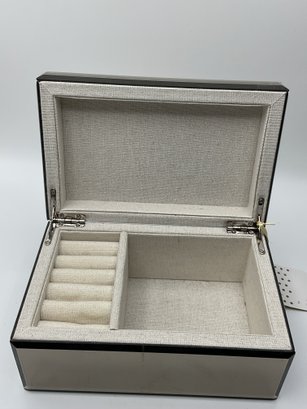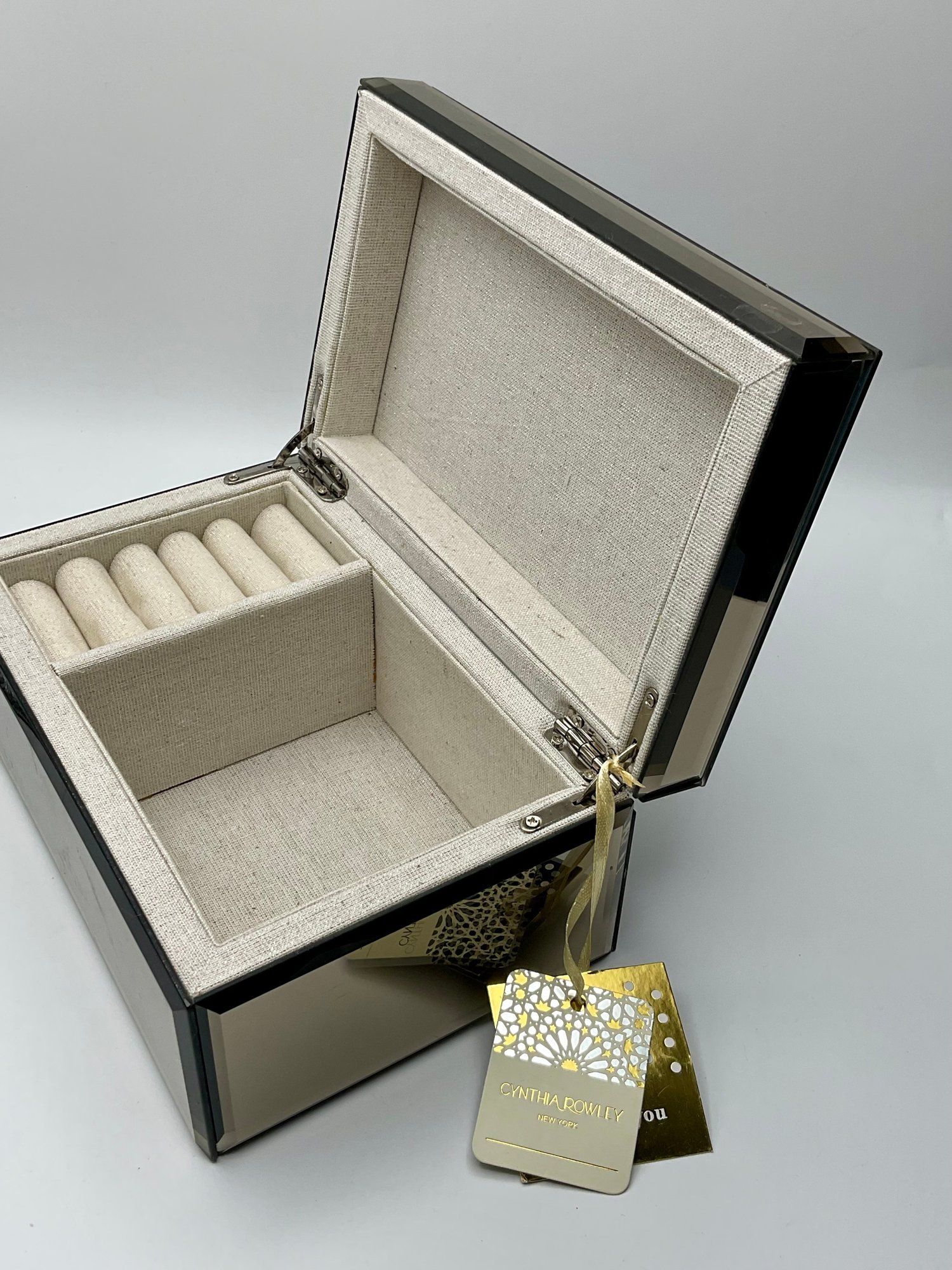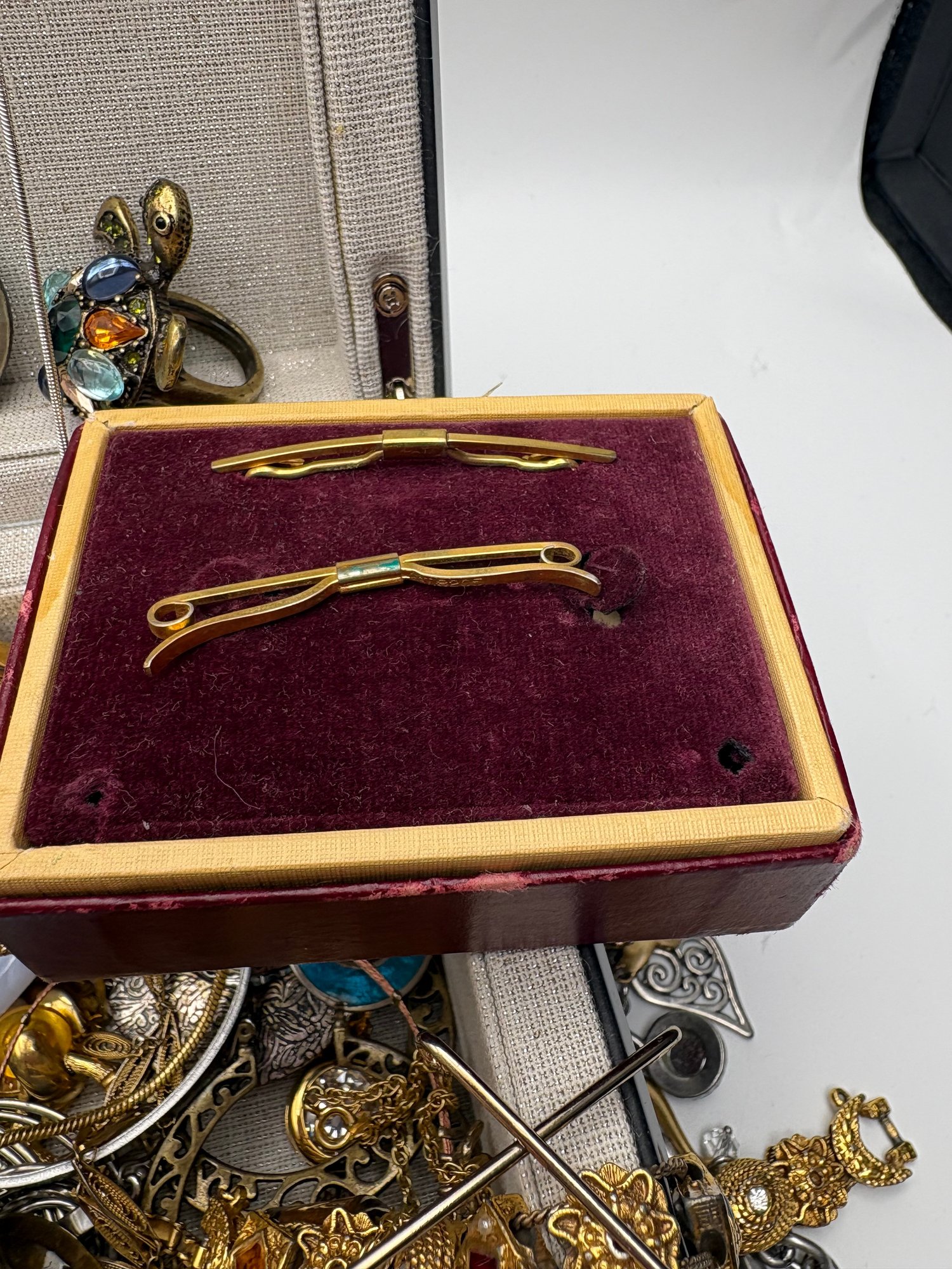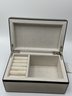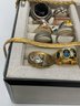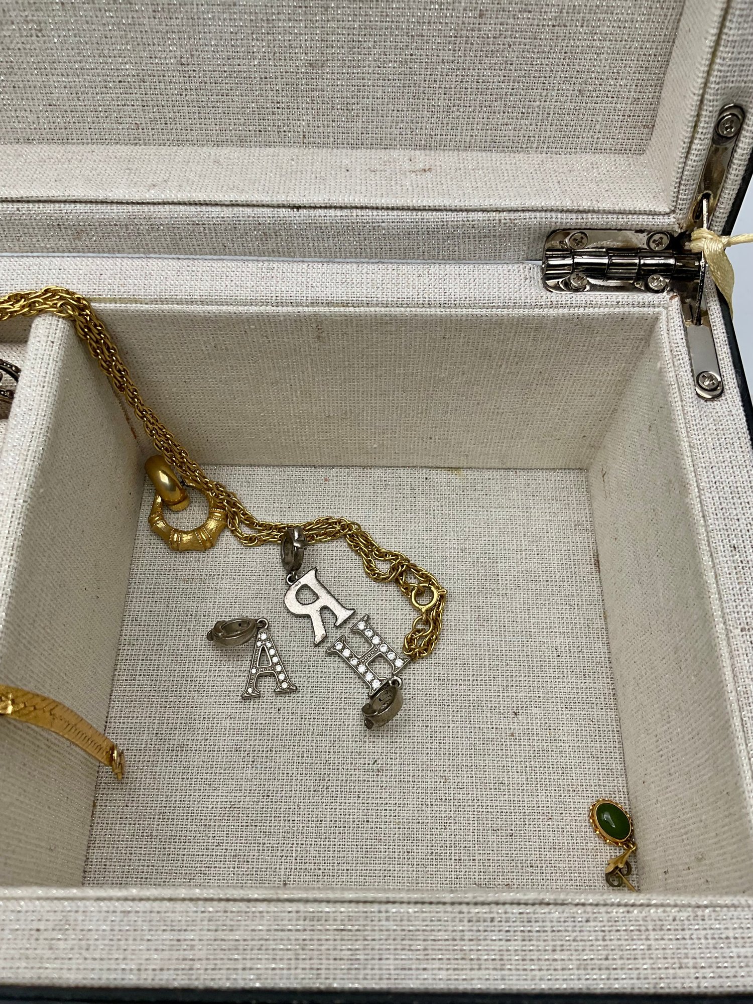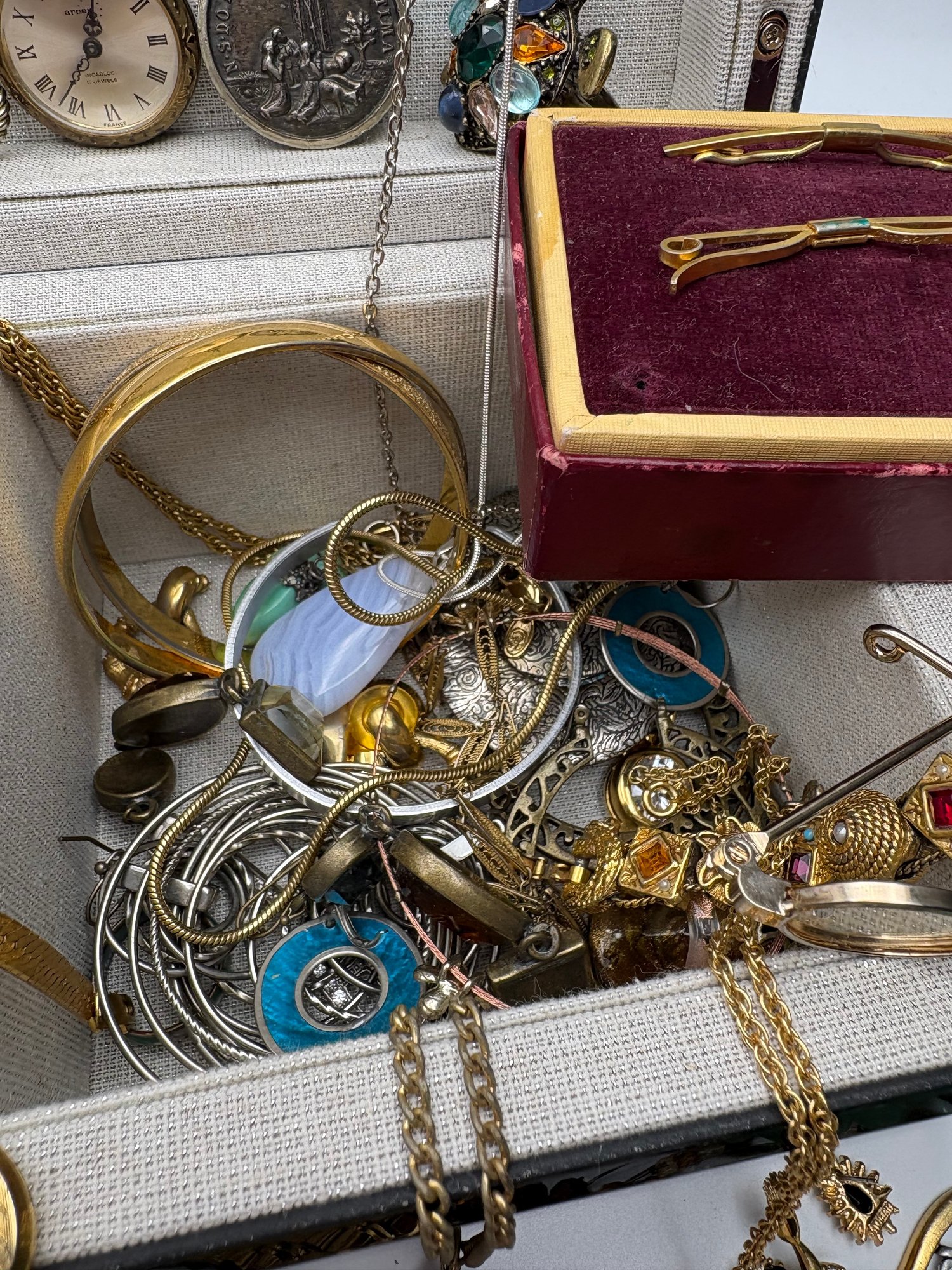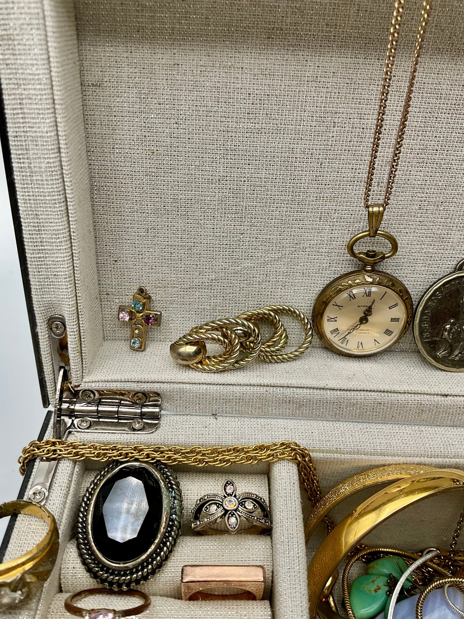 Explore a vast and eclectic assortment of jewelry housed in a stylish, cream-colored fabric and mirrored jewelry box. This collection features a curated variety of styles, ranging from classic vintage treasures to modern accessories.