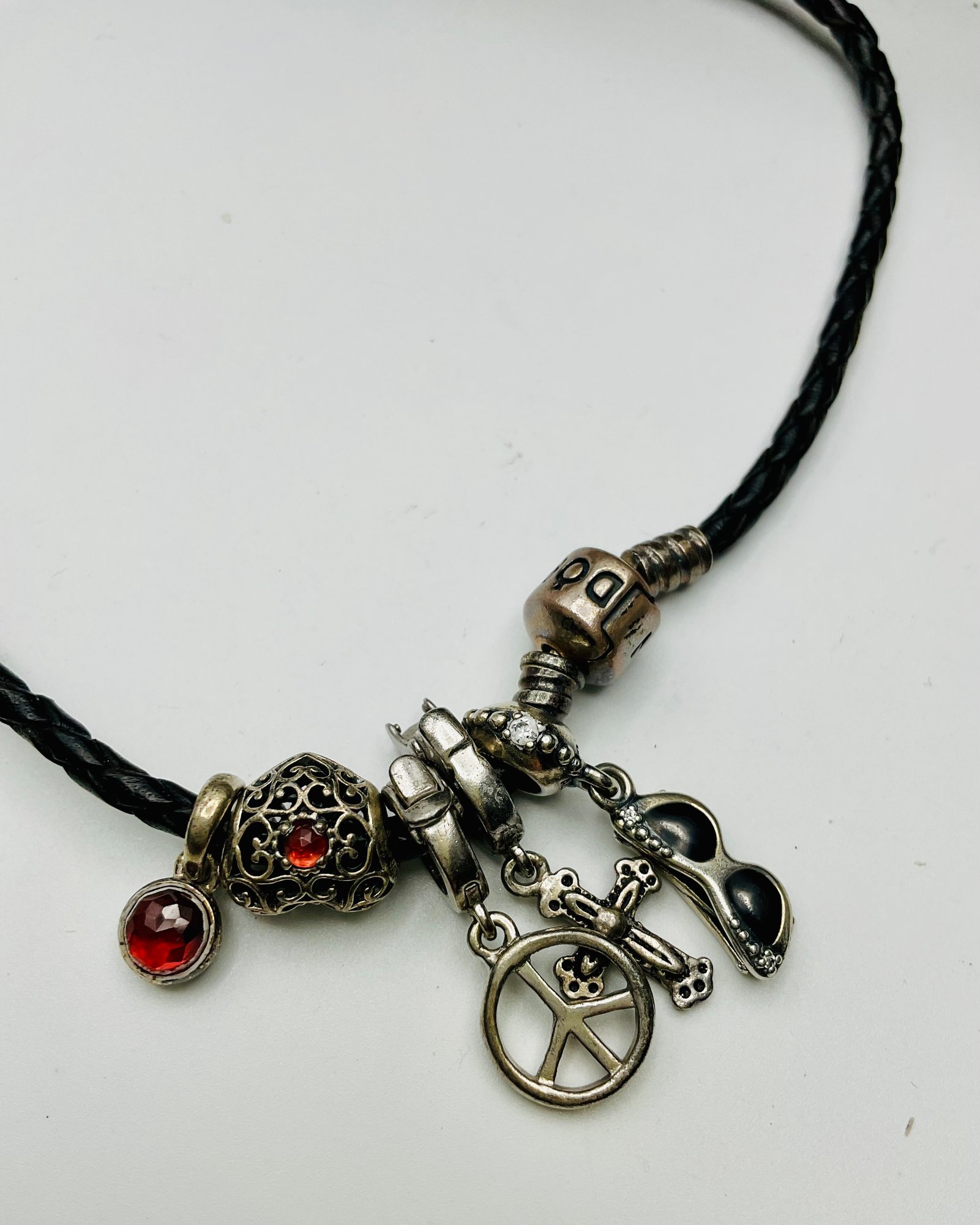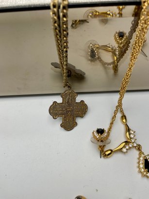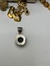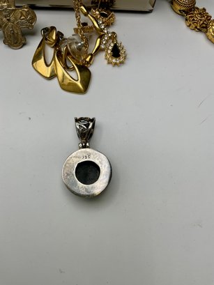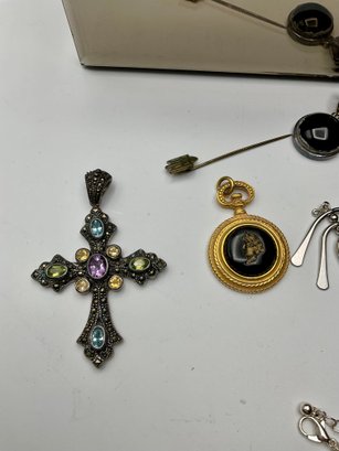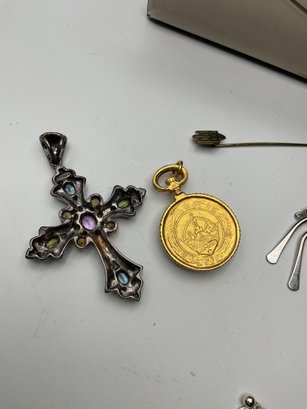 Sterling Silver & Fine Accents: Notable pieces include a large 925 marked sterling silver pendant and an ornate marcasite cross pendant set with colorful gemstones (amethyst, peridot, and blue topaz tones).