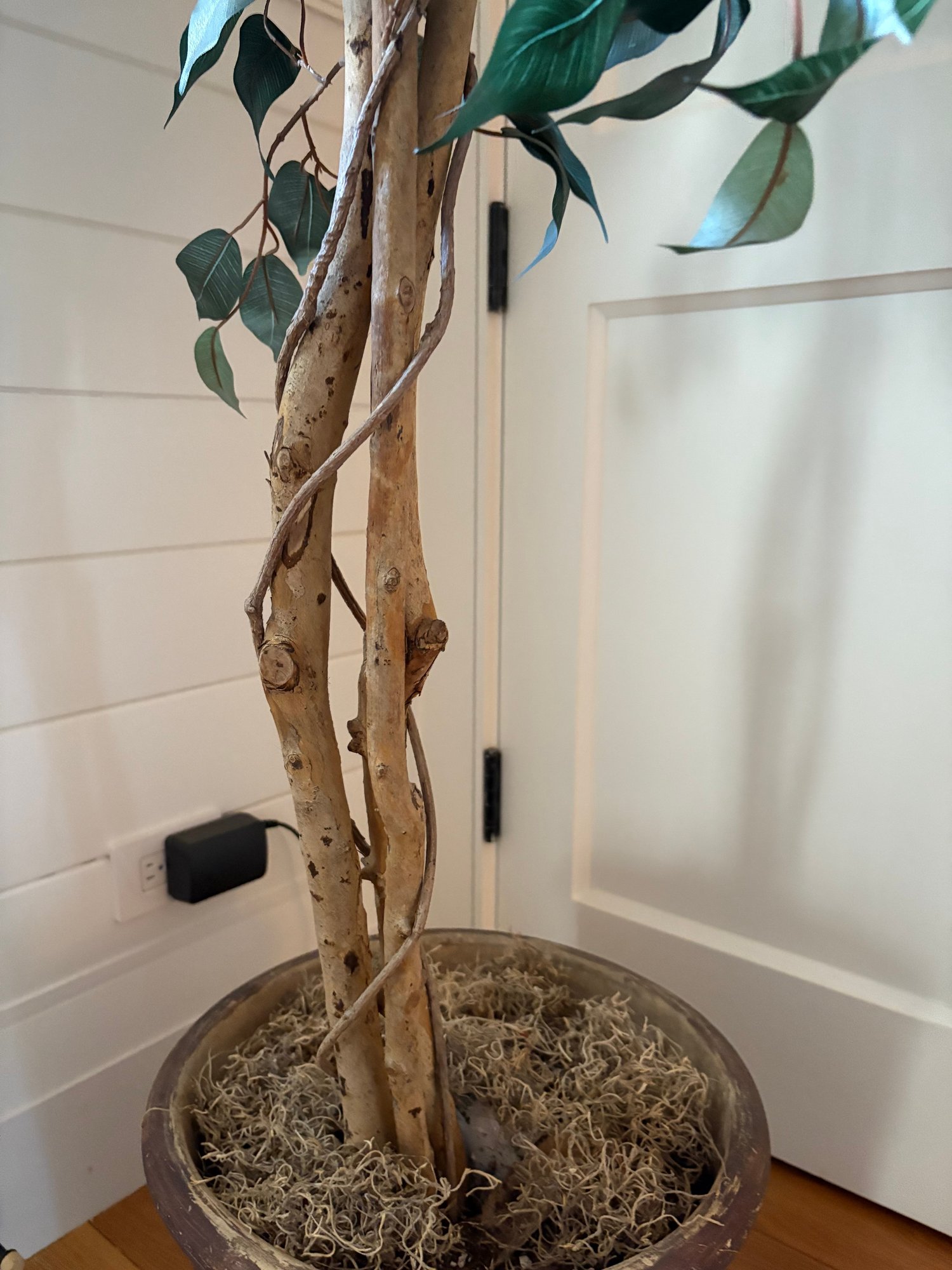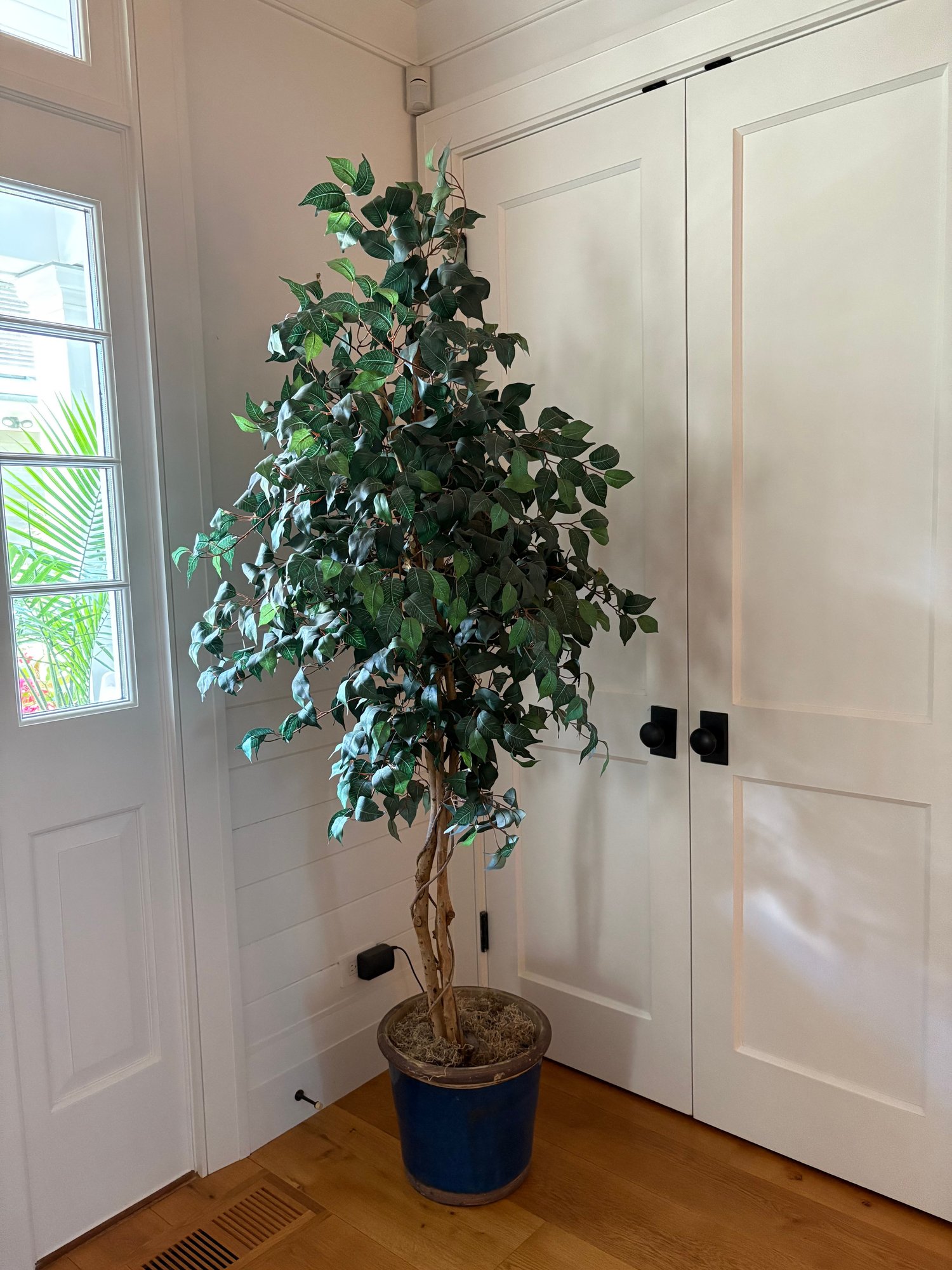 Large faux ficus tree in cobalt blue planter.