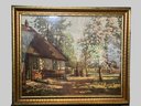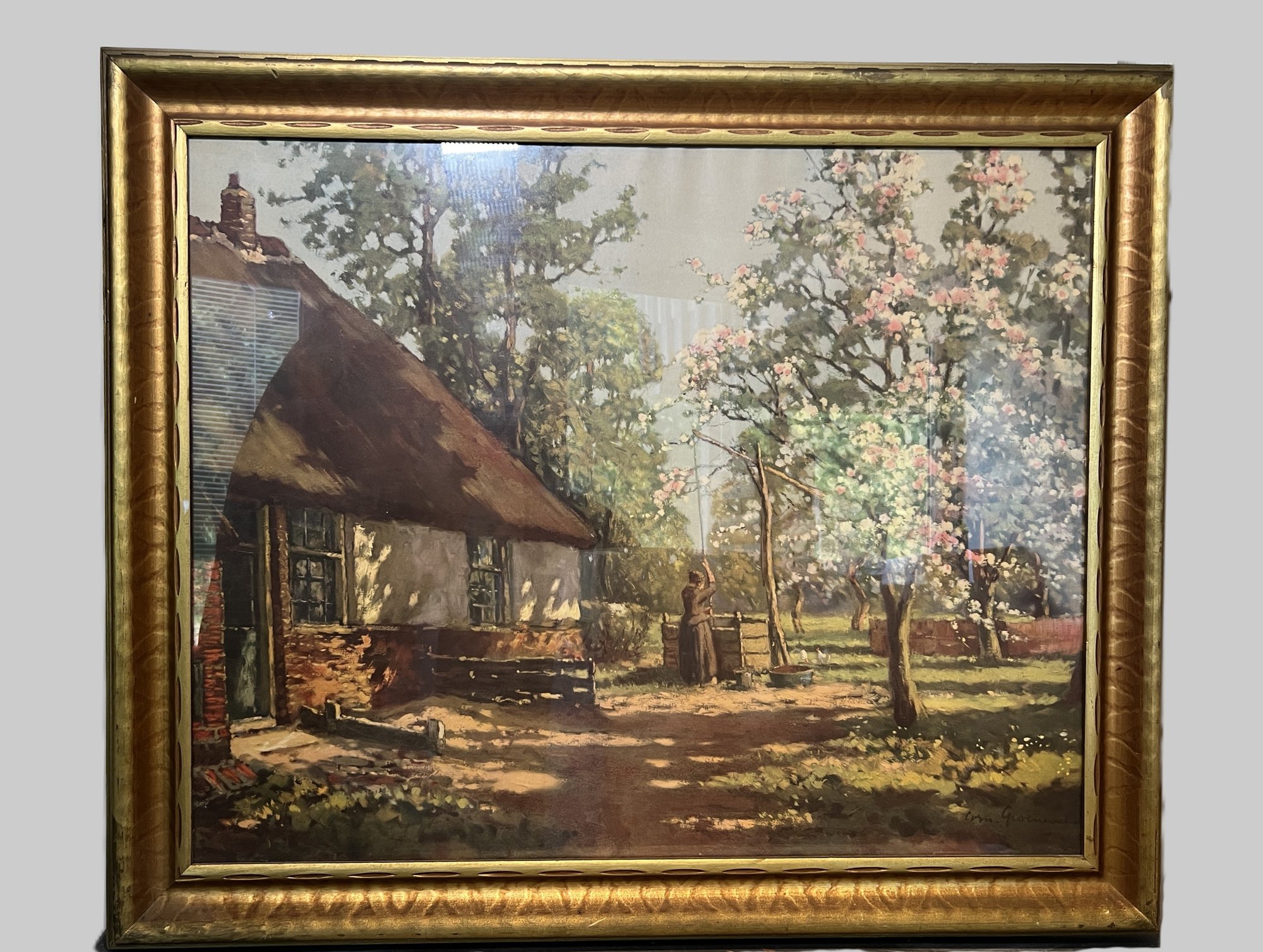 Large framed vintage print of a painting depicting a woman drawing from a well in front of an old farmhouse.